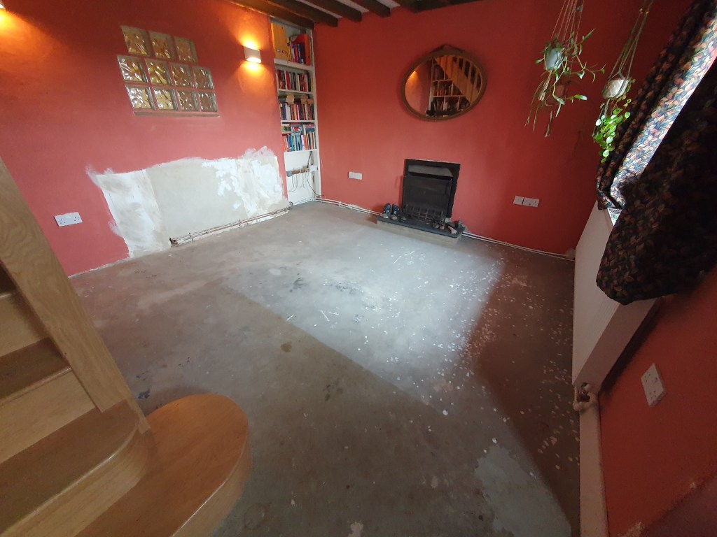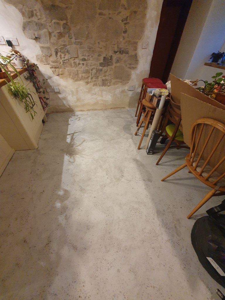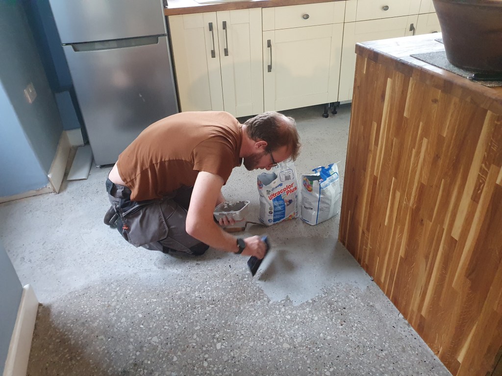 Our first job was to spread of layer of grout across the concrete. It was a little terrifying thinking that we might just be ruining the floor entirely. Chris got started on the grout, while I emptied our welsh dresser to make it light enough to move, and moved various lighter pieces of furniture into one area of the kitchen so we could work on the rest of the floor. Kitchen rearranged, Chris left me to finish the grouting, while he headed off on other small jobs to keep occupied.
