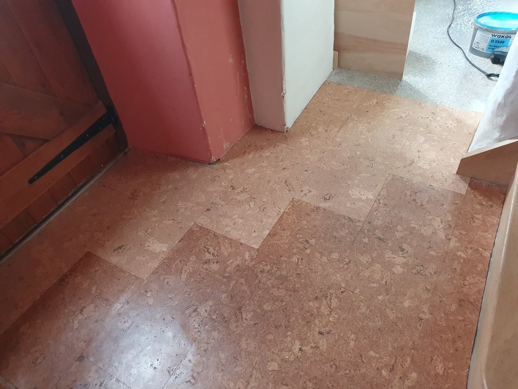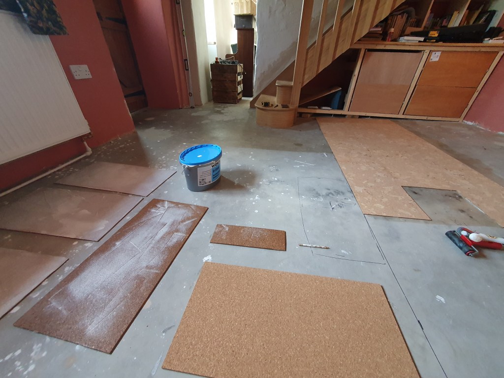 The cork comes in retangular tiles. To prep them they needed to be painted with adhesive and left to dry for 30min, with the same adhesive also being painted on the floor. We found the most efficient thing was to have one person preping tiles, while the other laid a previous batch.