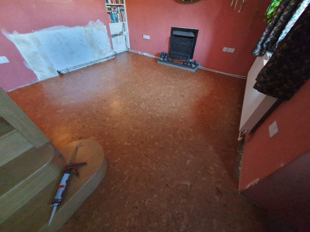 We’d ummed and ahhed about the lounge floor for a long time. My preference would have been carpet, but Chris wanted hard flooring. While I’m happy with wood or tiles in other rooms, the lounge is a room where I like to lie on the floor and I wanted something warm. In the end we compromised on cork, which is very insulating material, and therefore warmer than wood. It’s also very sustainable, and I’d been keen to try it out somewhere if possible.