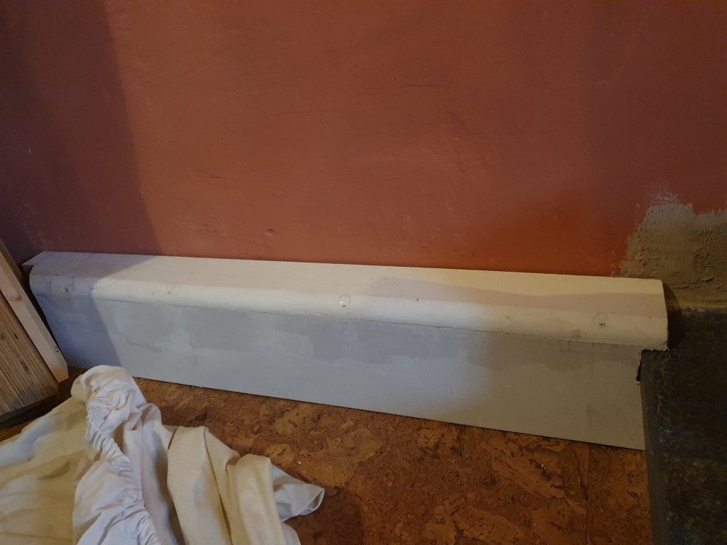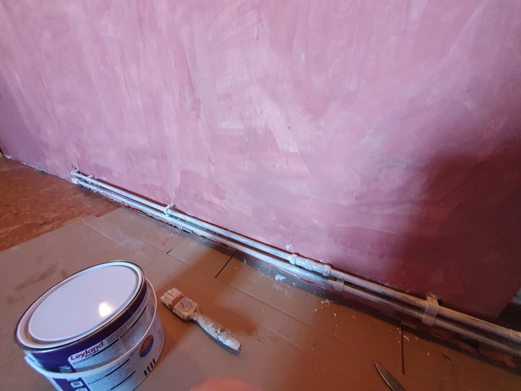 While the furniture was out of the way we tried to get a few more jobs done, including filling, sanding and painting where the radiator used to be, and painting the water pipes with primer ready to be painted the same colour as the walls.