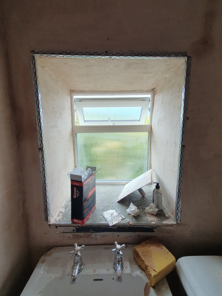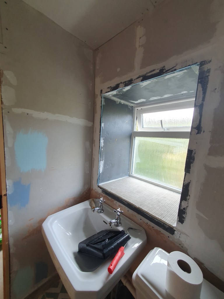 Upstairs I wanted to attach the windowsill in the spare bedroom but Chris reminded me he wanted the thicker insulated plasterboard replacing with the thinner fibre cement board. The reason was because the thicker board caused the windowsill to sit quite high on the windowframe. I felt a little bad replacing it given this was the third time, installed once by the contractors, only for my knee to go through it when we were installing the window, and then replaced by Max on his DIY week. Still at least all the boards were left overs from the previous work.