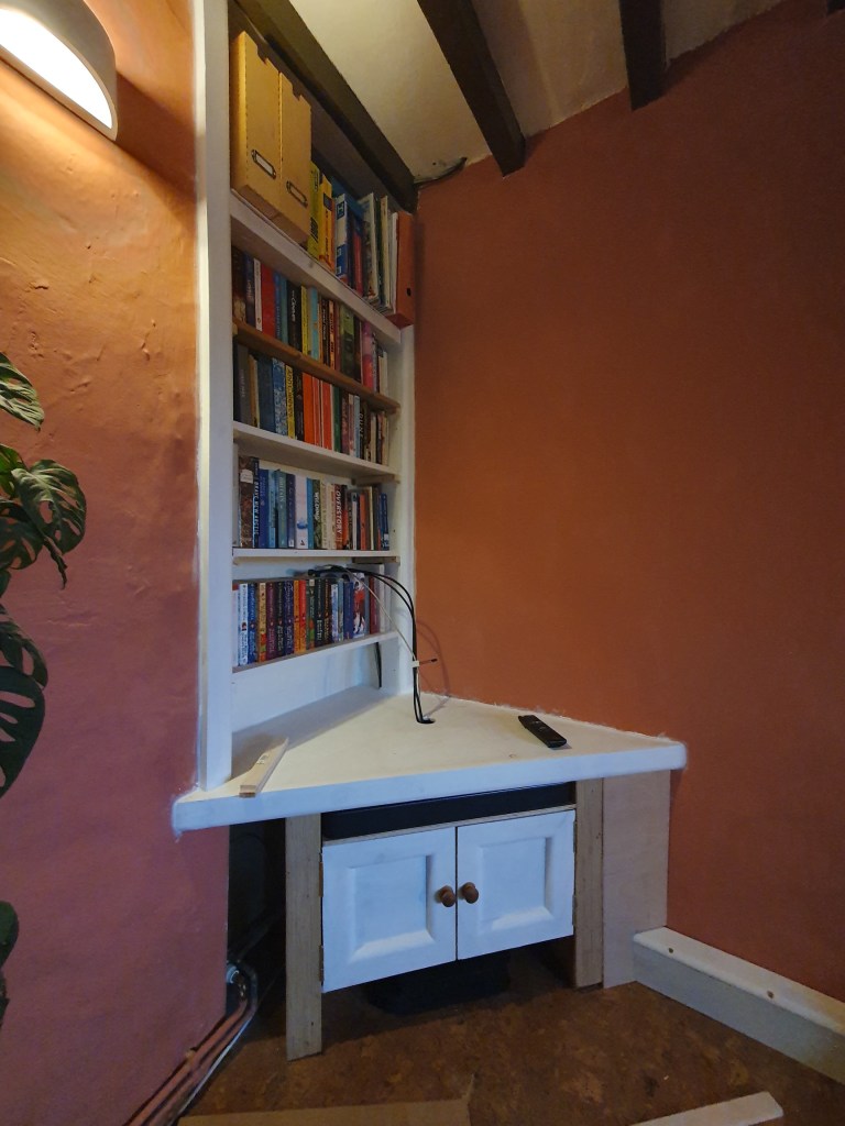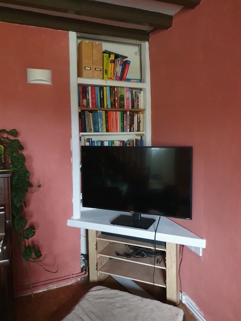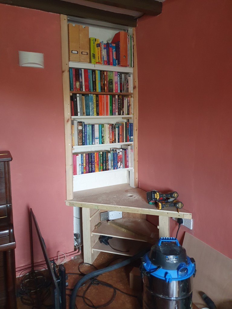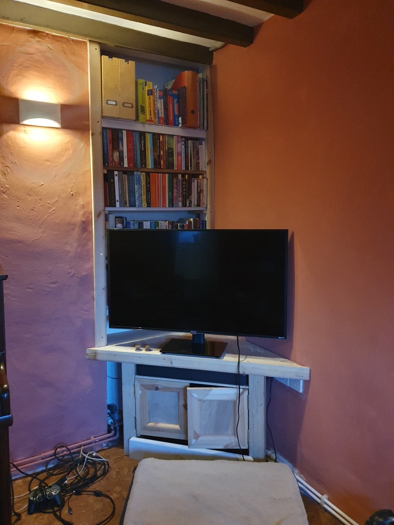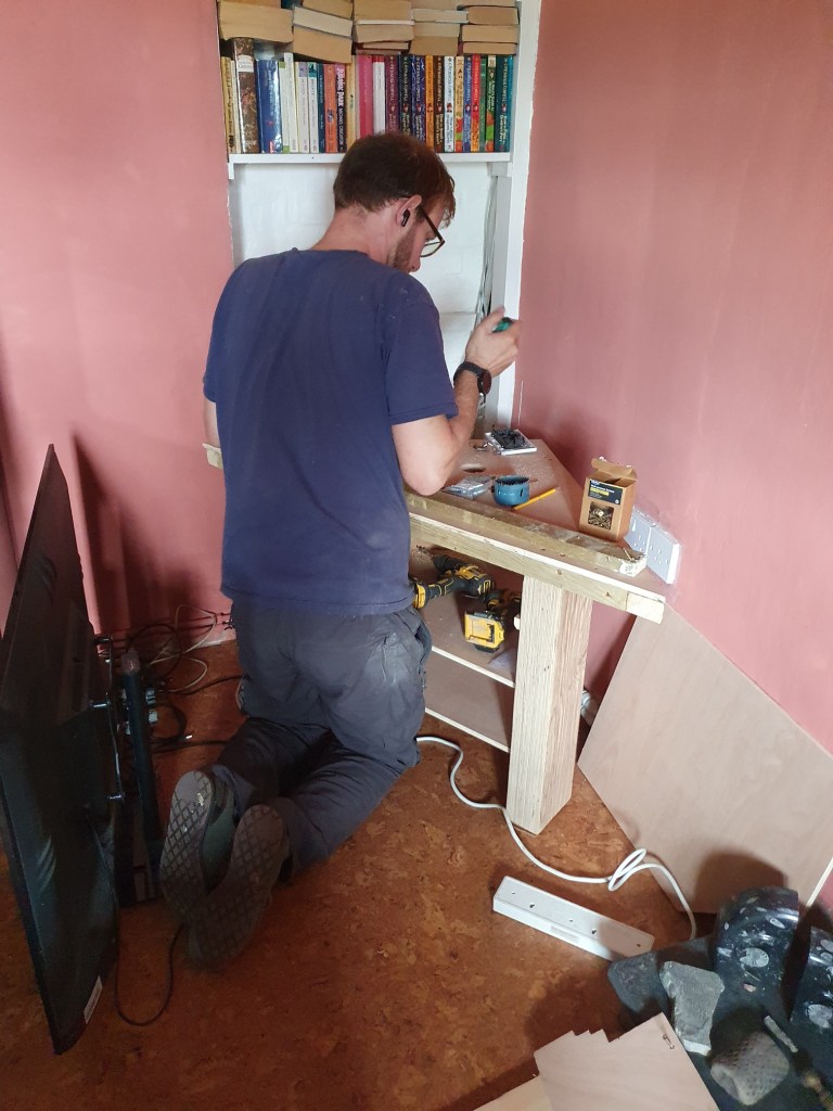 Chris opted for a more interesting job of building the TV unit he decided long ago would sit at the base of the bookcase.