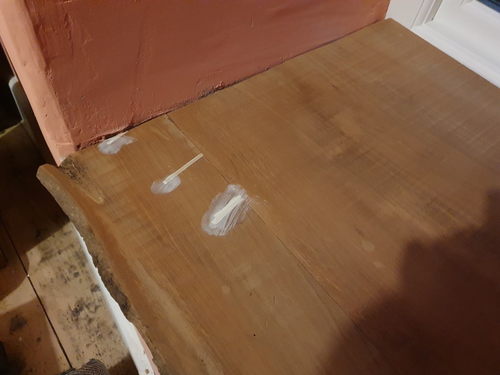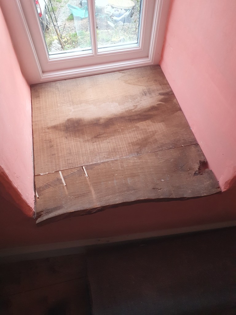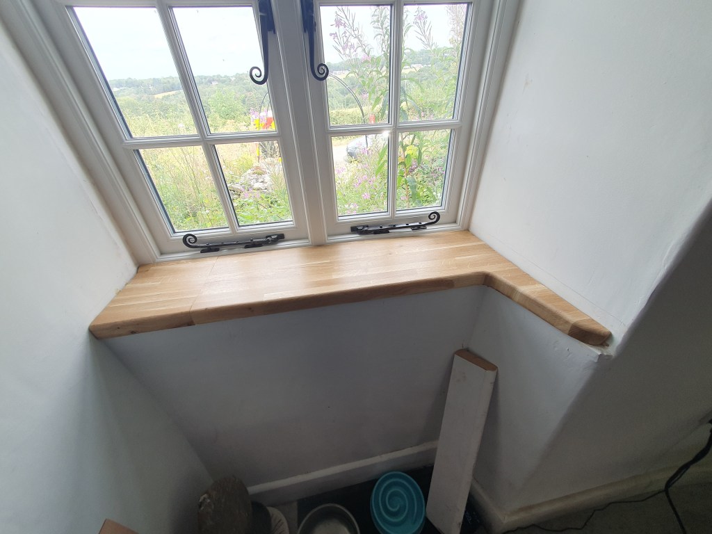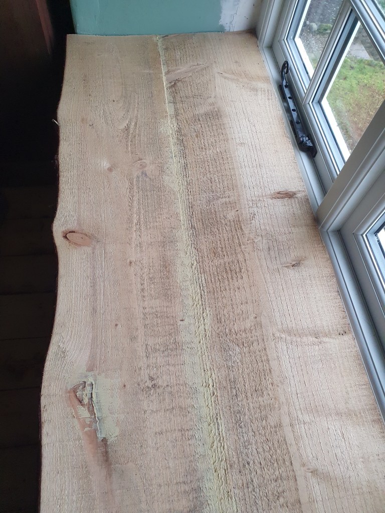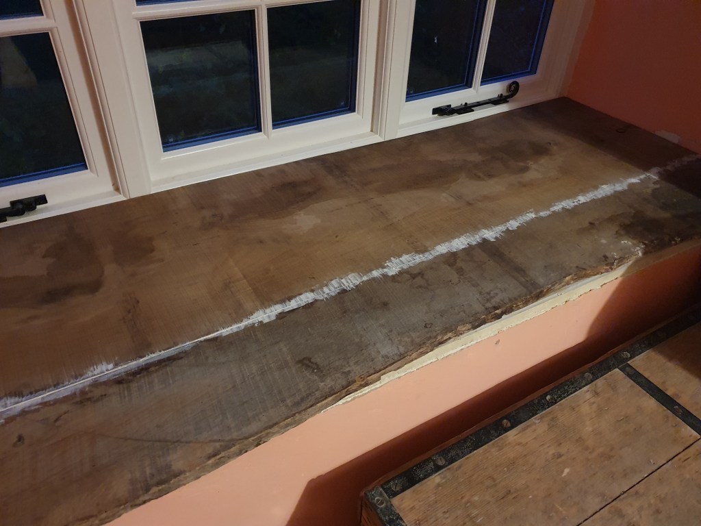 We decided not to bother trying to straighten the lounge windowsill, and just stuck it down as flat as we could. Chris also rounded the edge of the kitchen windowsill and stuck that in place, before treating both.