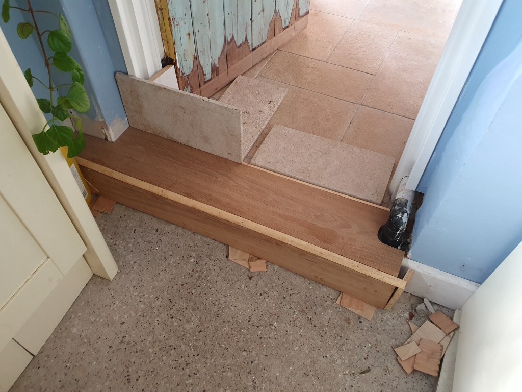 Having avoided the problem for a few years, we finally agreed to create a wooden step, which would at least be more obviously different. Chris used some spare planks of wood and bought some trim to create a rounded edge. Hopefully we won’t have too many people pancaking on our kitchen floor.