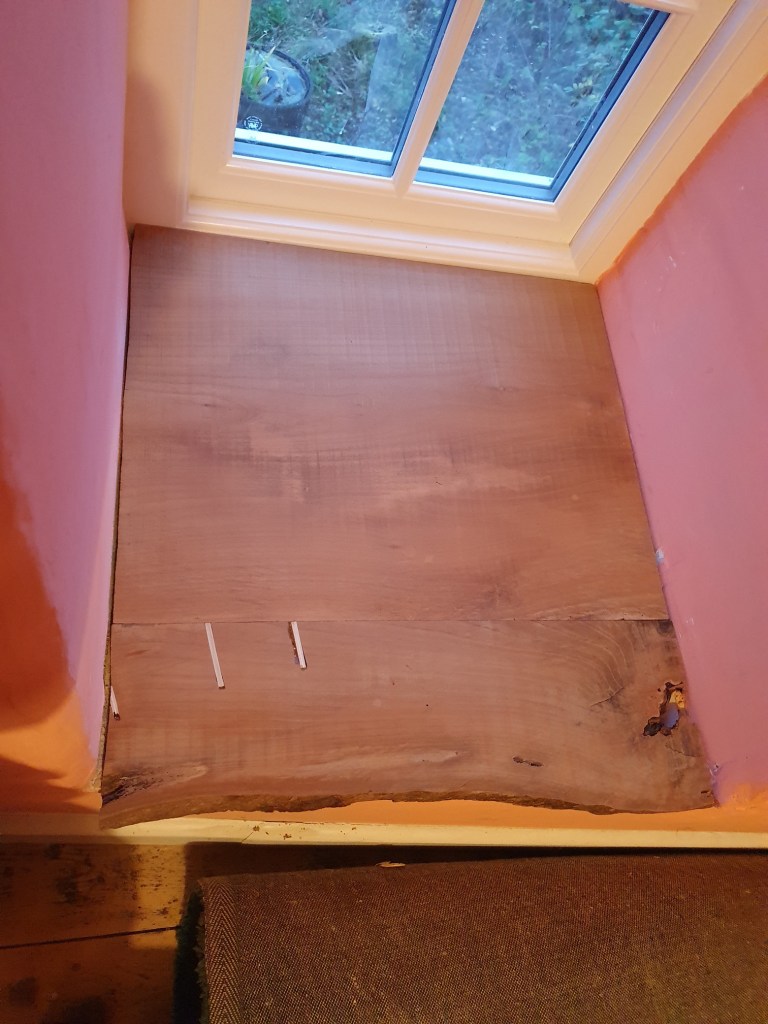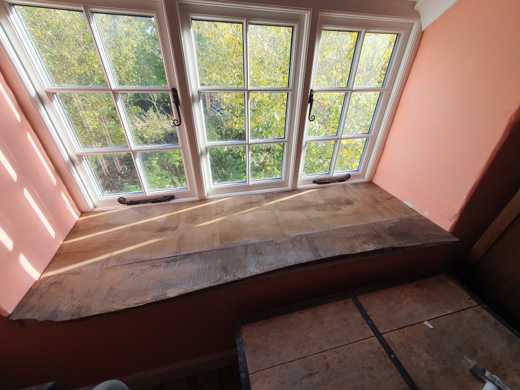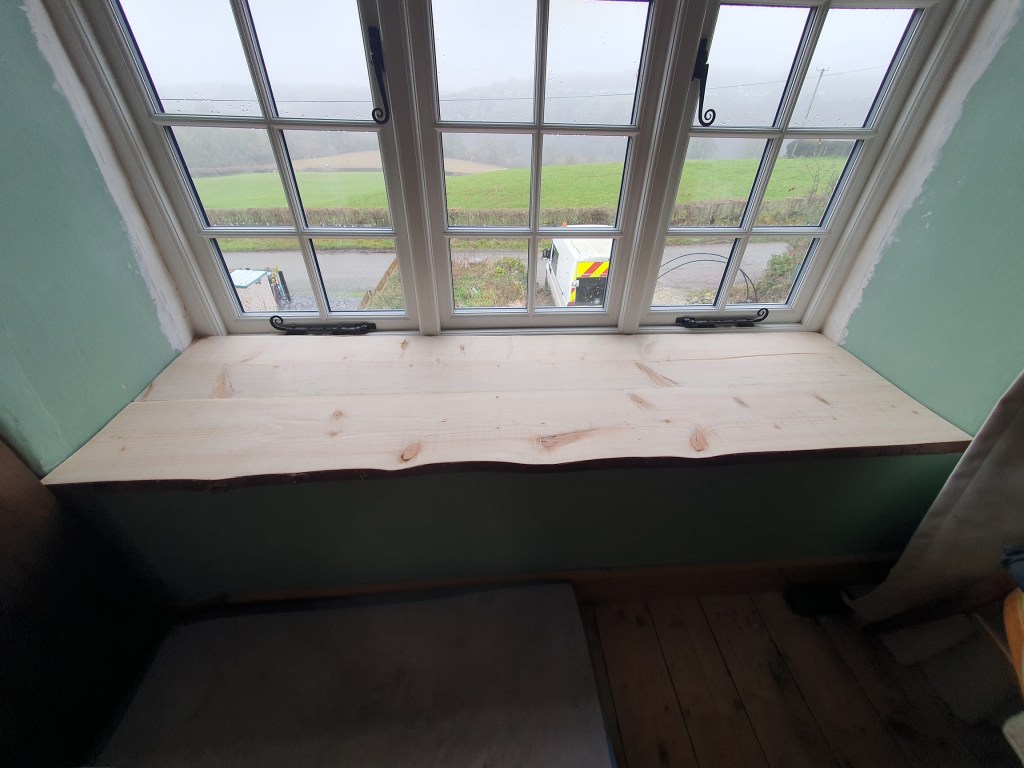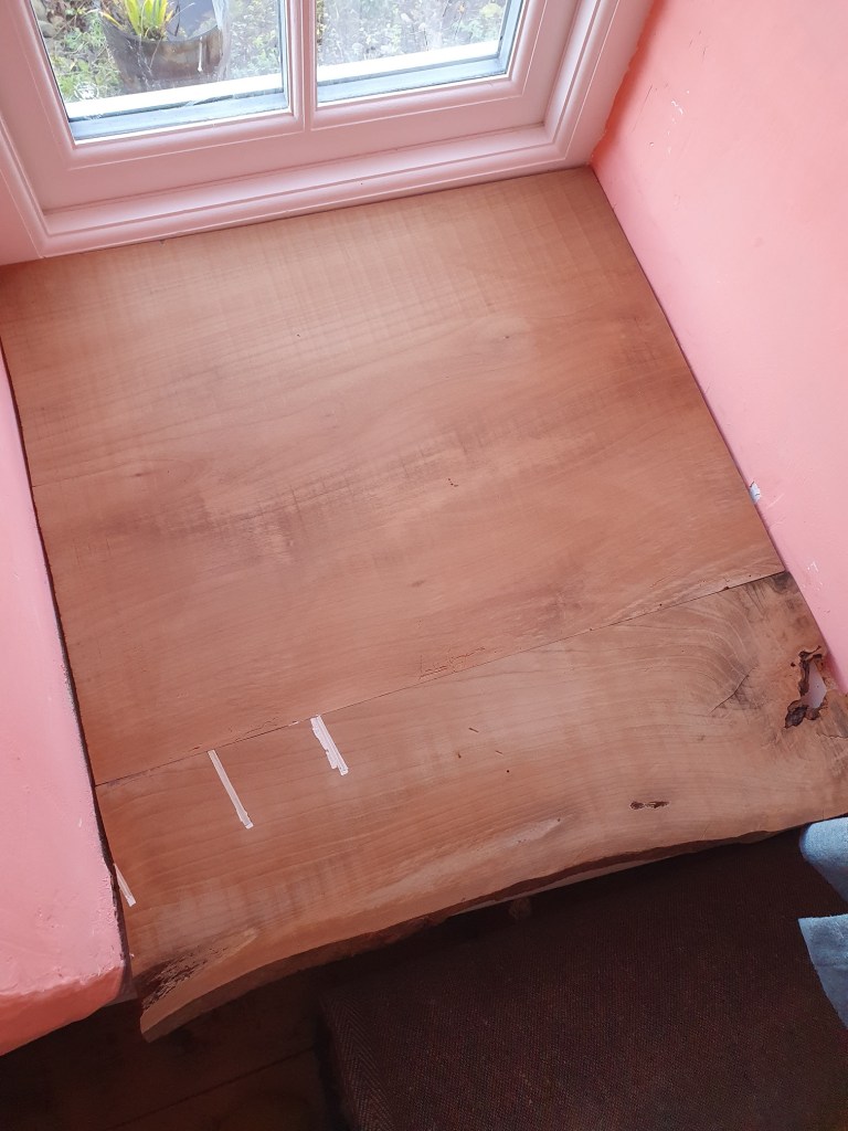 Having glued the planks for the study windowsills, I cut them to size. I needed Chris’s help to lift the bigger windowsill in and out of the alcove to try the fit.