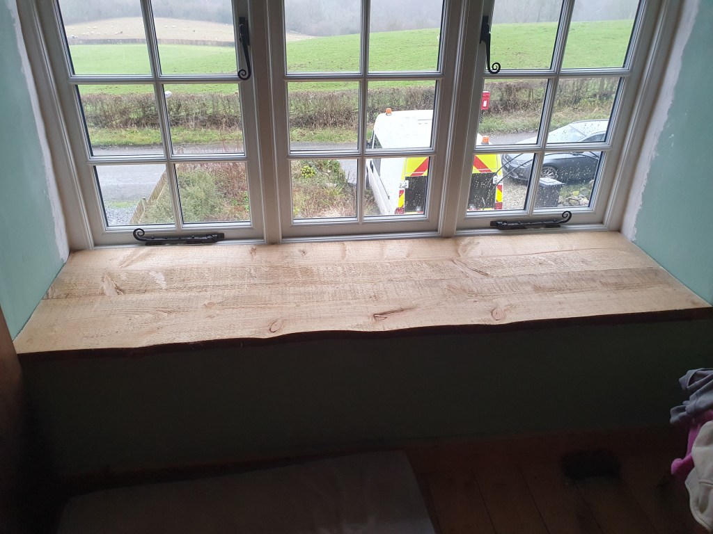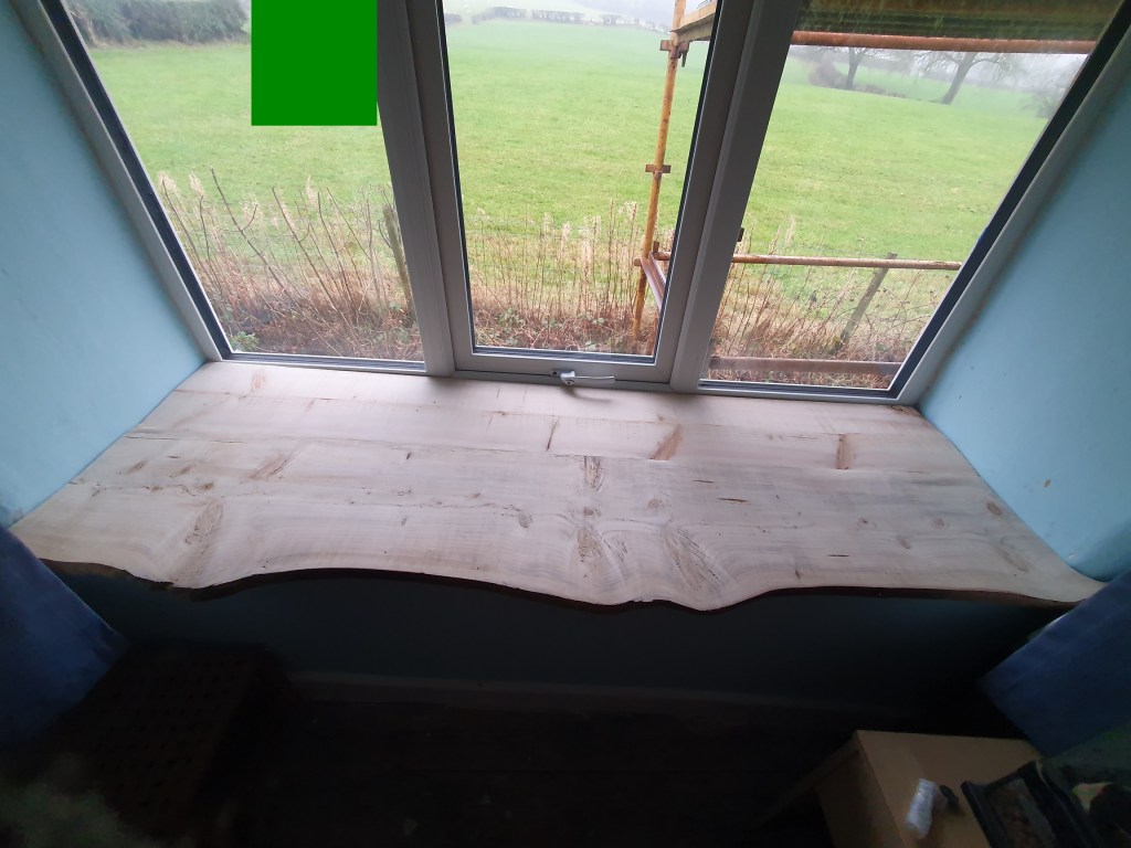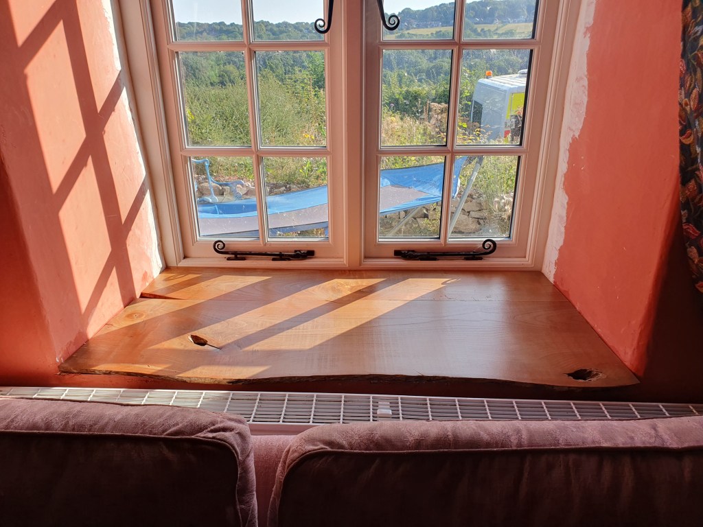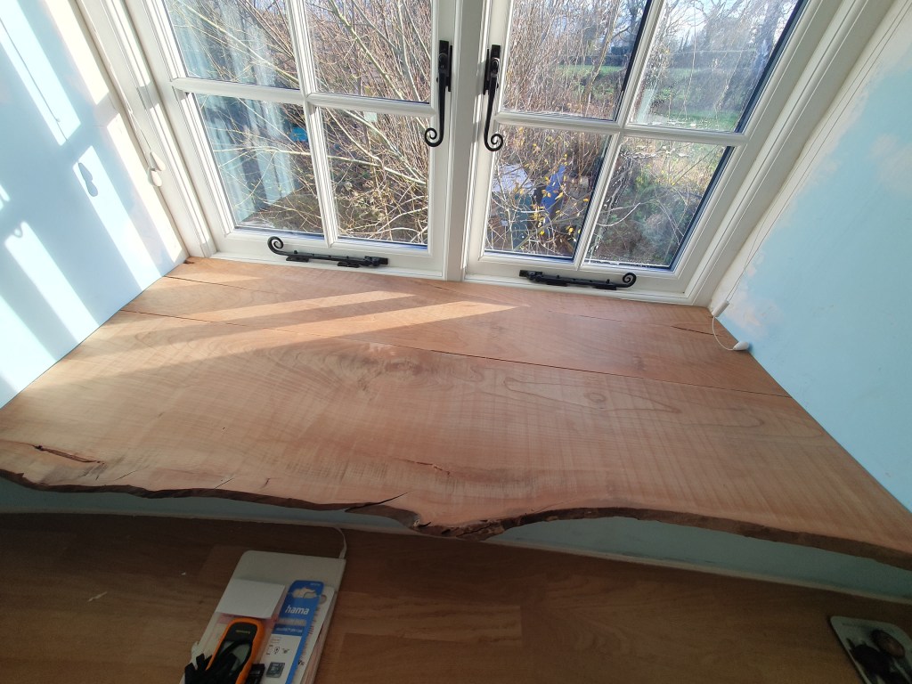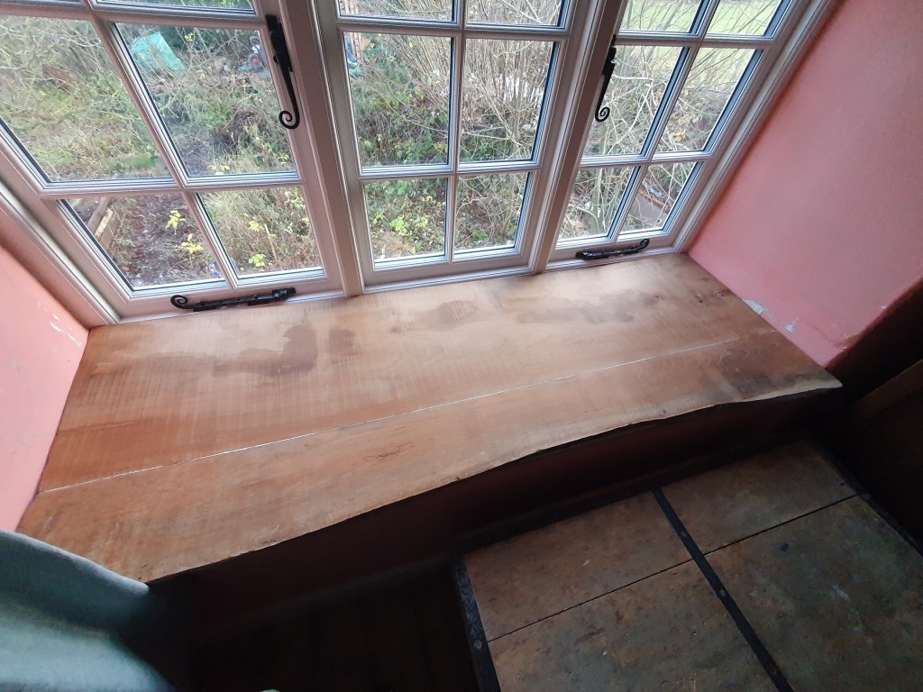 Having glued the planks for the study windowsills, I cut them to size. I needed Chris’s help to lift the bigger windowsill in and out of the alcove to try the fit.