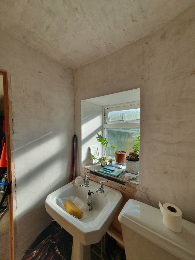 Having taped and PVAed the downstairs toilet walls, I set to work on plastering. I knew it would be a horrible job as it’s a small, awkward space, with lots of odd angles. What I didn’t realise when I started, was that the plaster was too old and had gone off. This meant that it went hard far too quickly, and was difficult to smooth out on the walls. I made do, making tiny batches at a time, not ideal.