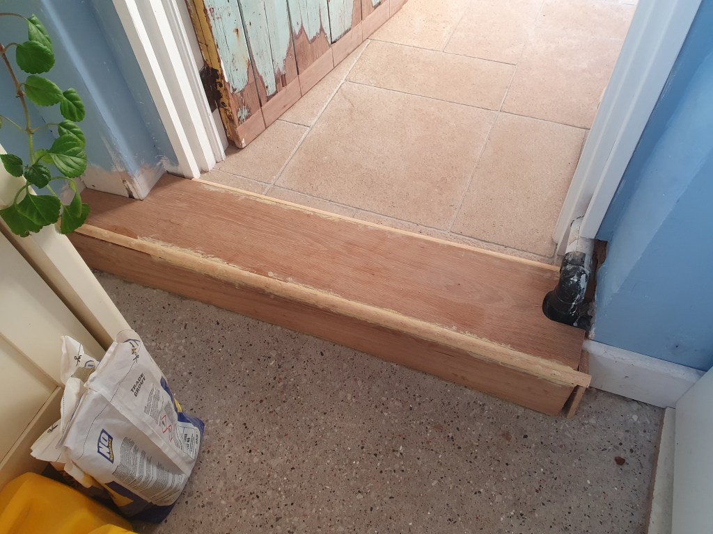 The kitchen step has been a puzzle for a long time. Because of the outflow pipe for the washing machine, we weren’t able to lay the utility slabs over the top at the same level as the rest of the floor.