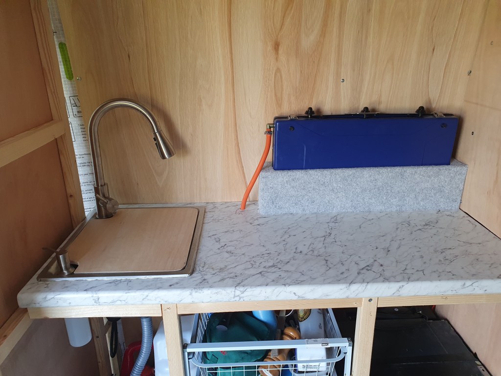 Chris cut out some spare pieces of plywood to create a top for the sink and draw bottoms. The sink top would allow us extra cooking space when the sink wasn’t in use, while the draw bottoms would stop smaller items dropping through.