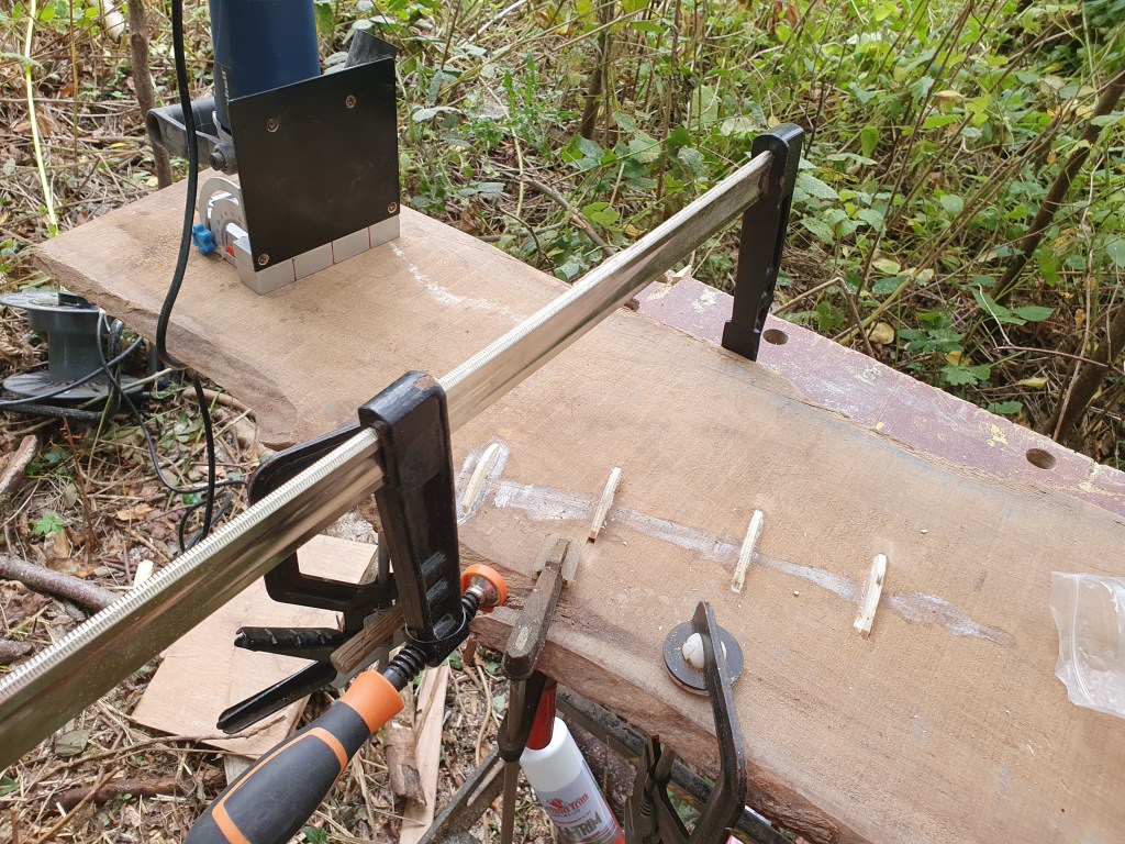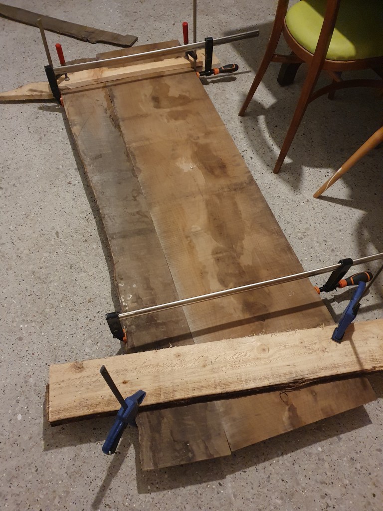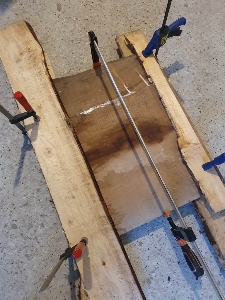 I didn’t have enough clamps to glue and clamp both windowsills so I did the smaller one, and can swap the clamps over once it’s dried. Then both will need to be cut to the template and sanded.