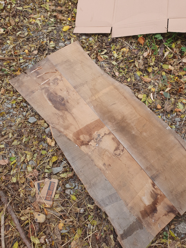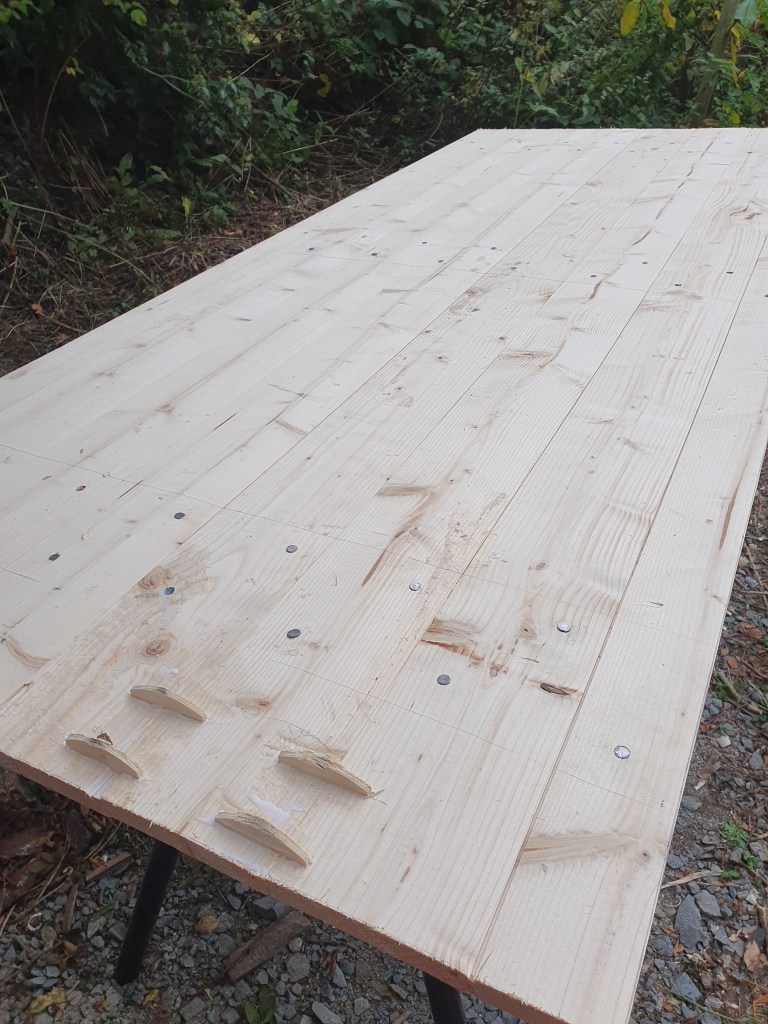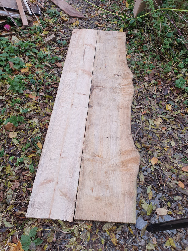 We are out of large pieces of elm so I cut down two pieces of the same spruce we used to clad the shed. I cut straight edges on both sides of one piece, and one straight edge on the second piece, leaving a wavy edge.