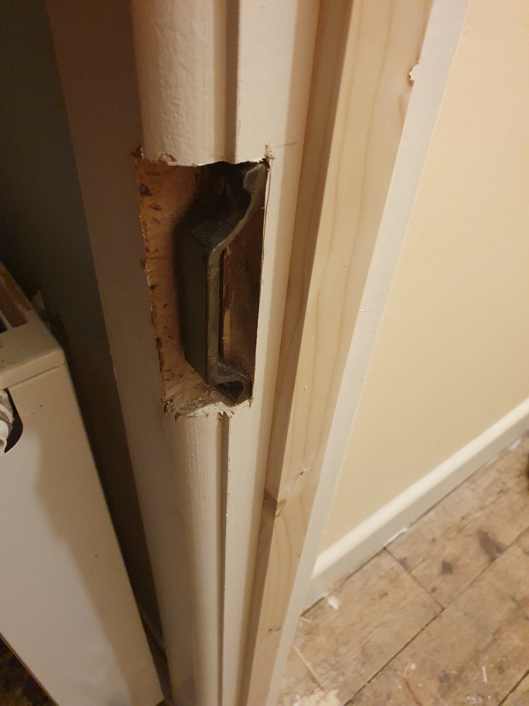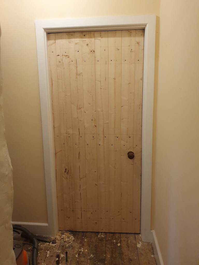 Having rested up, Chris got on with the job of trimming down and hanging the door he made. This was a little more complicated than it should have been as he realised, in order to use some old hinges we had laying around, he needed to remove the architrave we’d already attached. But it’s all up finally, with a handle and everything. Given this will be the babies room in 5 months time, a door is definitely a big plus.