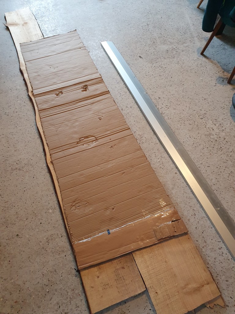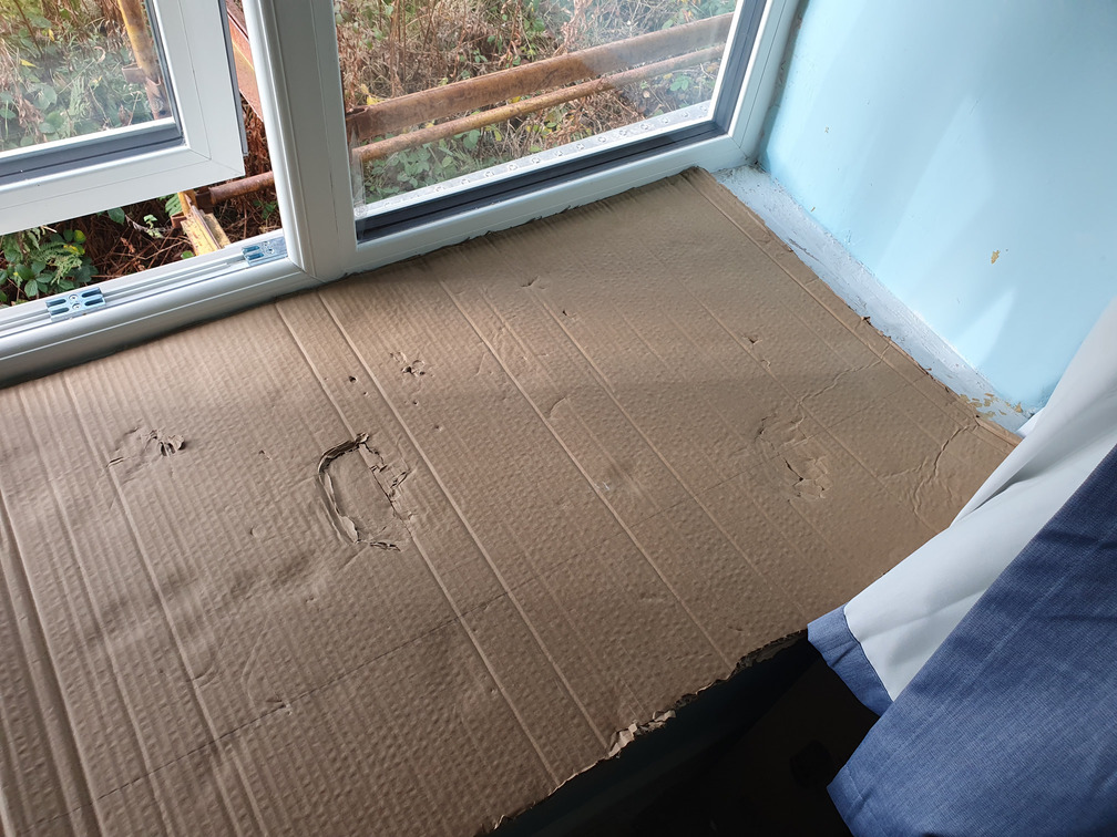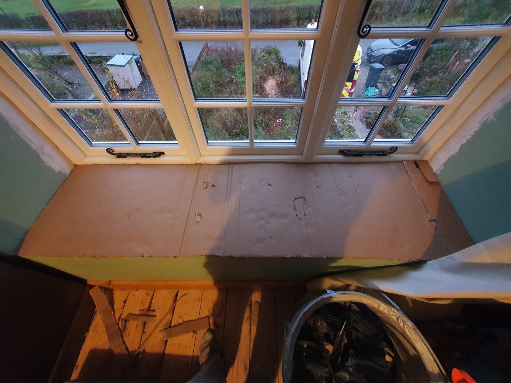 While everything dried out downstairs I cut a cardboard template for the final windowsill upstairs, ready to cut out the final pieces of wood another day.