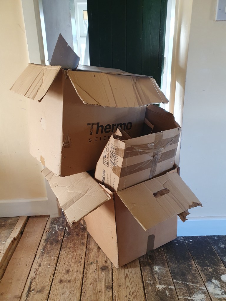 We spent half a day sorting through several moving boxes currently living in our study, trying to remember why we have so much stuff. By the end we managed to relocate many of the items to elsewhere in the house, or offer them up to charity. What remains is a box of pictures and another of photo albums, both of which won’t find homes till after the final coat of paint. While not the most exciting job, this gets us one step closer to carpeting the study, which will be the baby’s room, so worth a slow start to DIY this weekend.