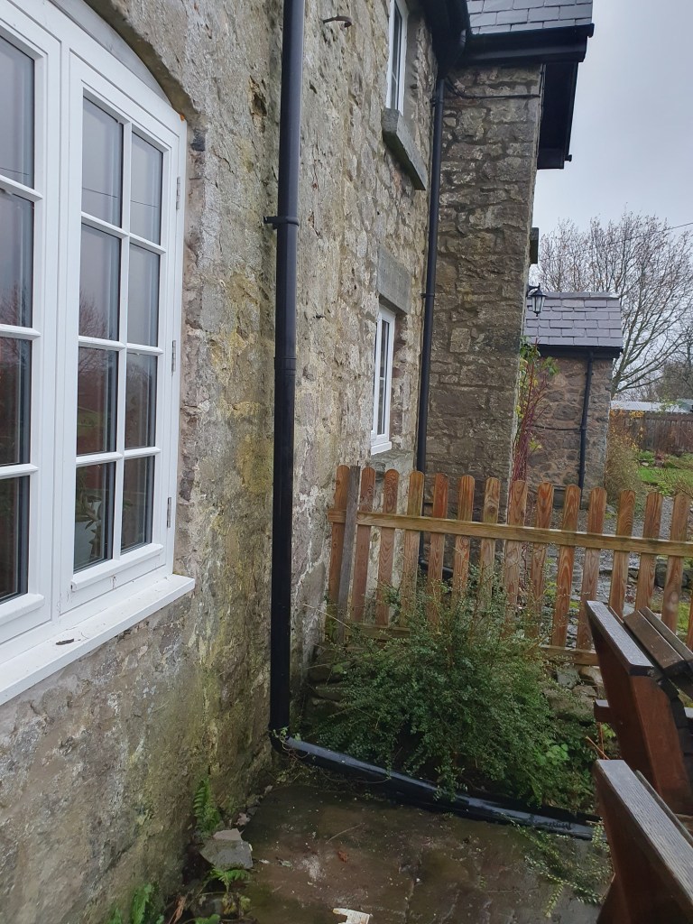 Finally, he spent some time reattaching a downspout at the front of the house, which had fallen off in a previous storm. By attaching an elbow to it we can direct the water away from the house and into the flowerbeds, better for the house and the garden.