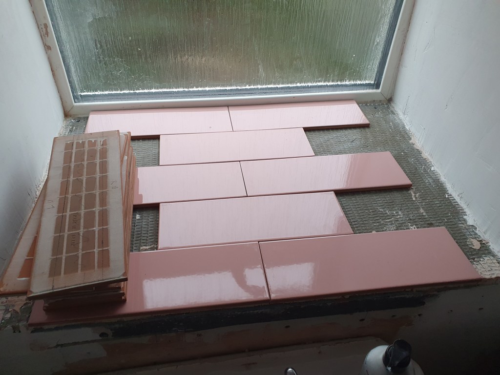 After umming and ahhing and ordering so many different tile samples the tile company rang me up, we finally settled on a pink for the downstairs toilet windowsill. I’ve marked them ready to cut, we just need to dig out the tile cutter.