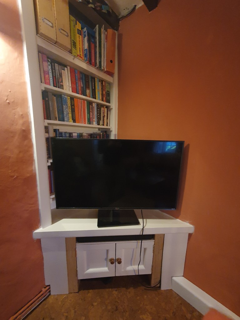 In the lounge, the much better quality cream heritage paint covered in two coats, and the TV unit is finally finished.