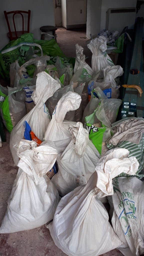 Our old plaster, broken and ruined as it is will now go on to a new life, largely heading back into the construction industry, reincarnated into new buildings, roads or other projects. All 60 bags of it.