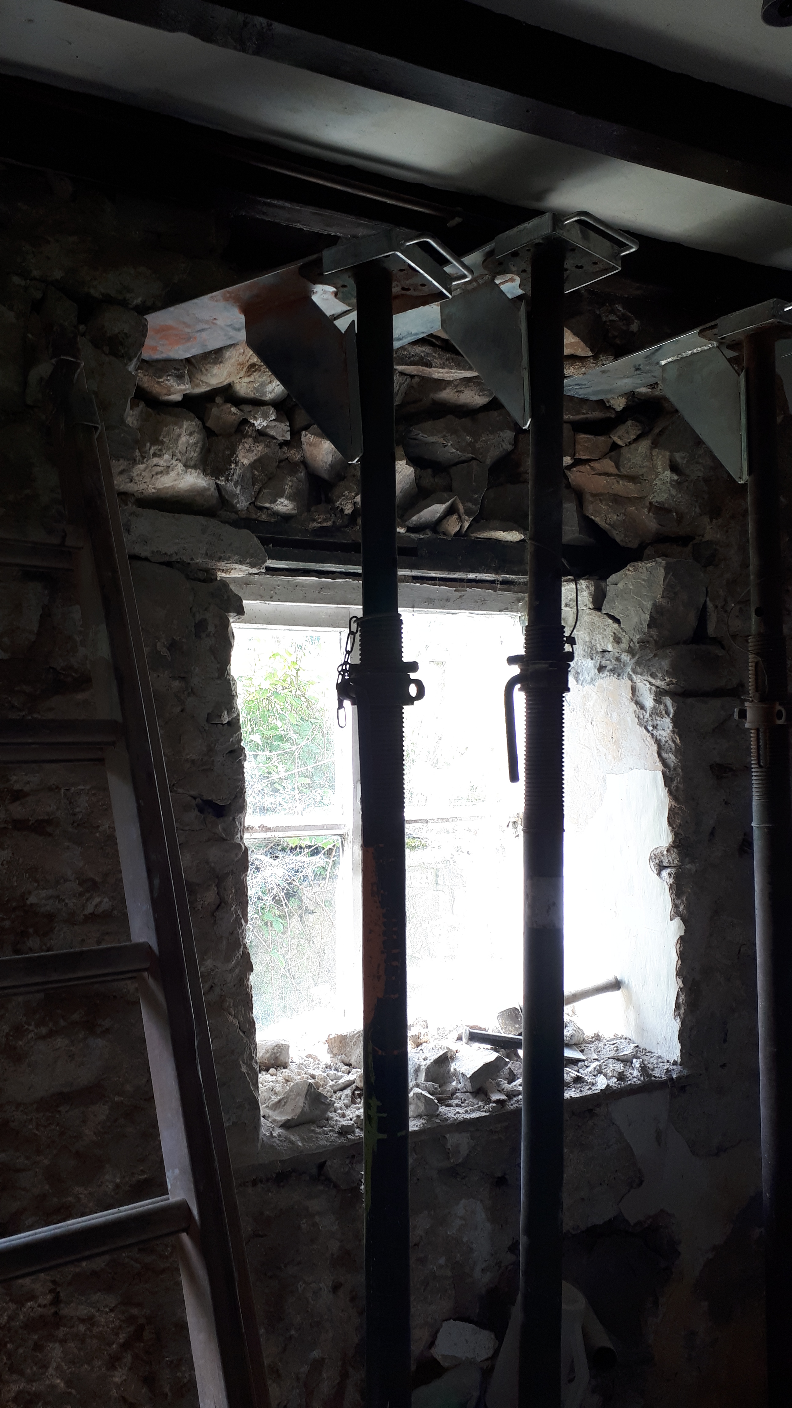 One of our slightly fiddly jobs this week has been to start installing the structural supports, in order to stop the walls from falling outwards (so fairly important). Though it’s hard to imagine our metre thick walls ever budging an inch, large tell-tale cracks emerged from under the plaster, reminding us that this isn’t a job to be left undone.