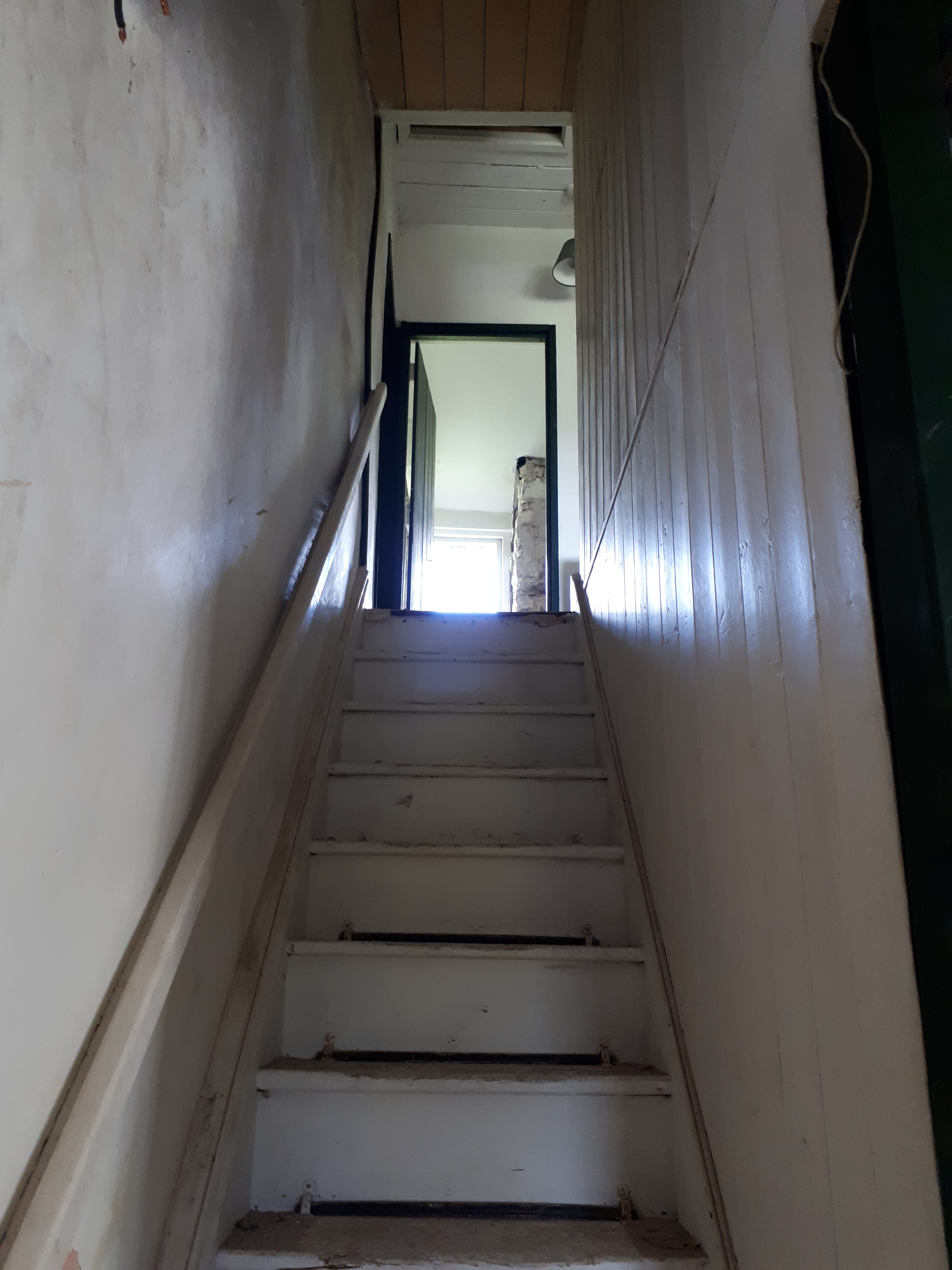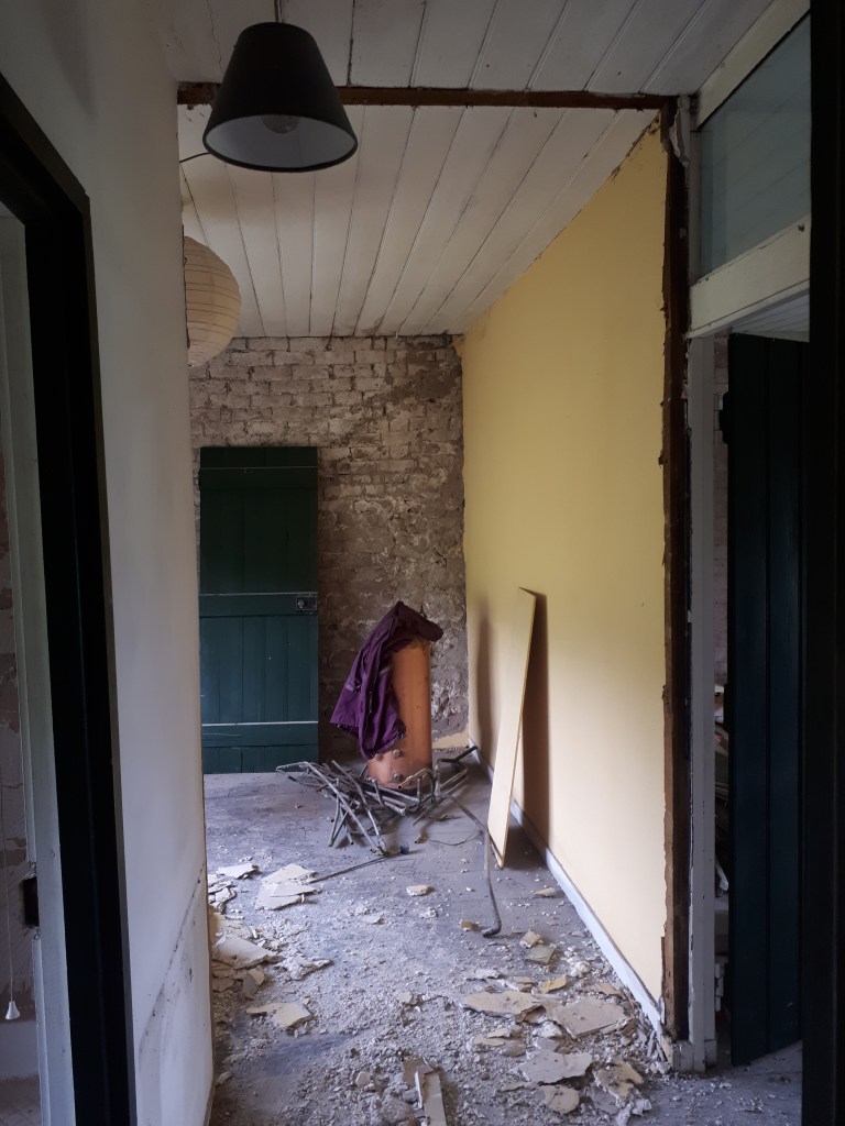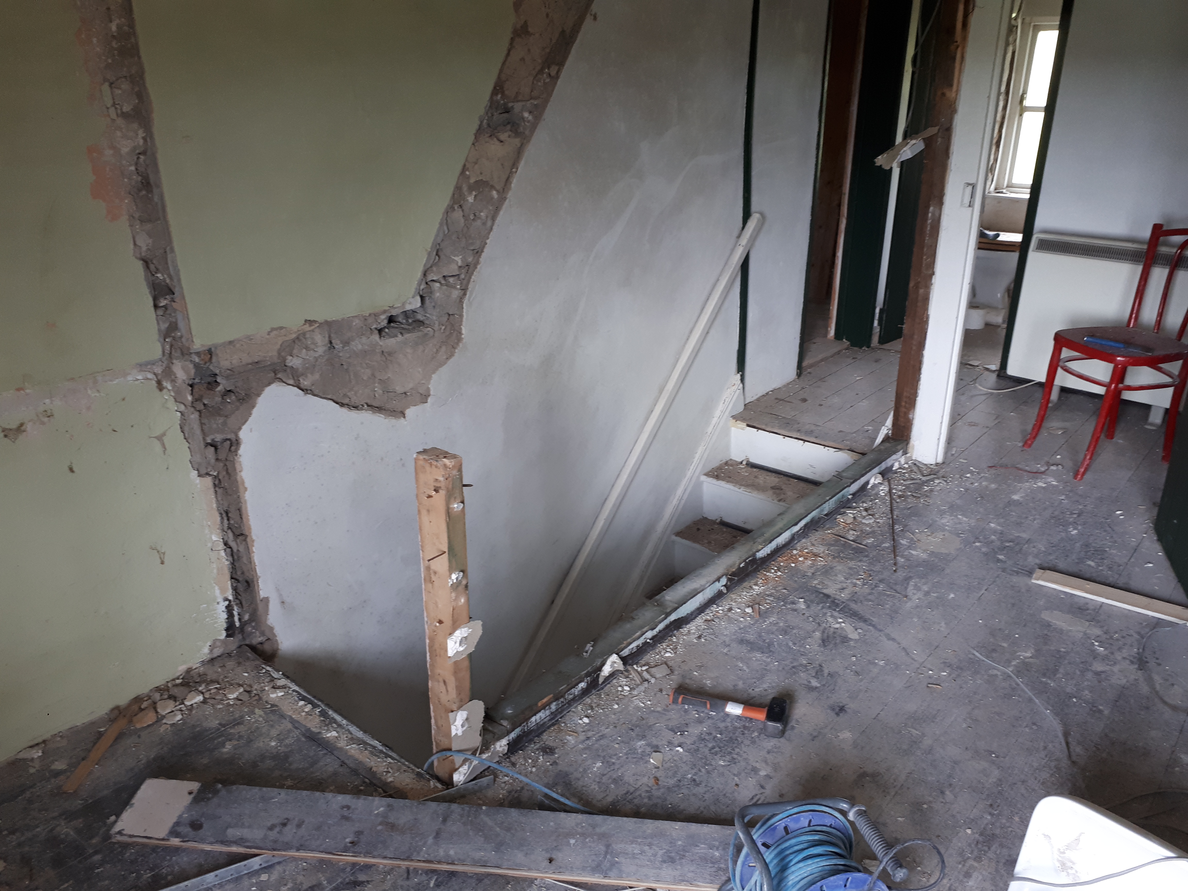 Following on with the same theme, the wall between our future bathroom and the hall has been removed in order to build it again a foot further back. This will allow the bedroom doorway to move likewise, in order to allow room for the wider staircase. As always, one job leads to another, and another, and another.