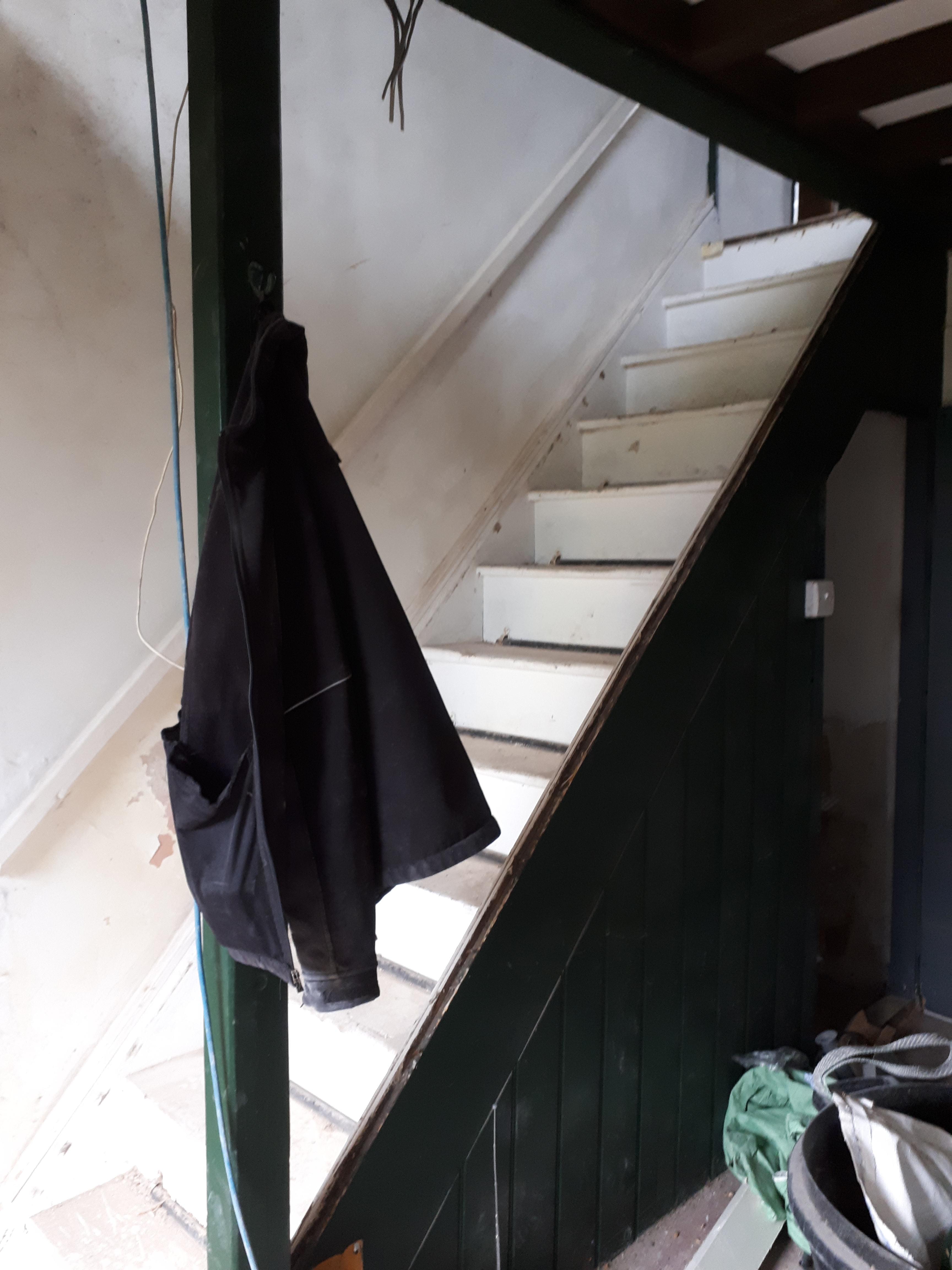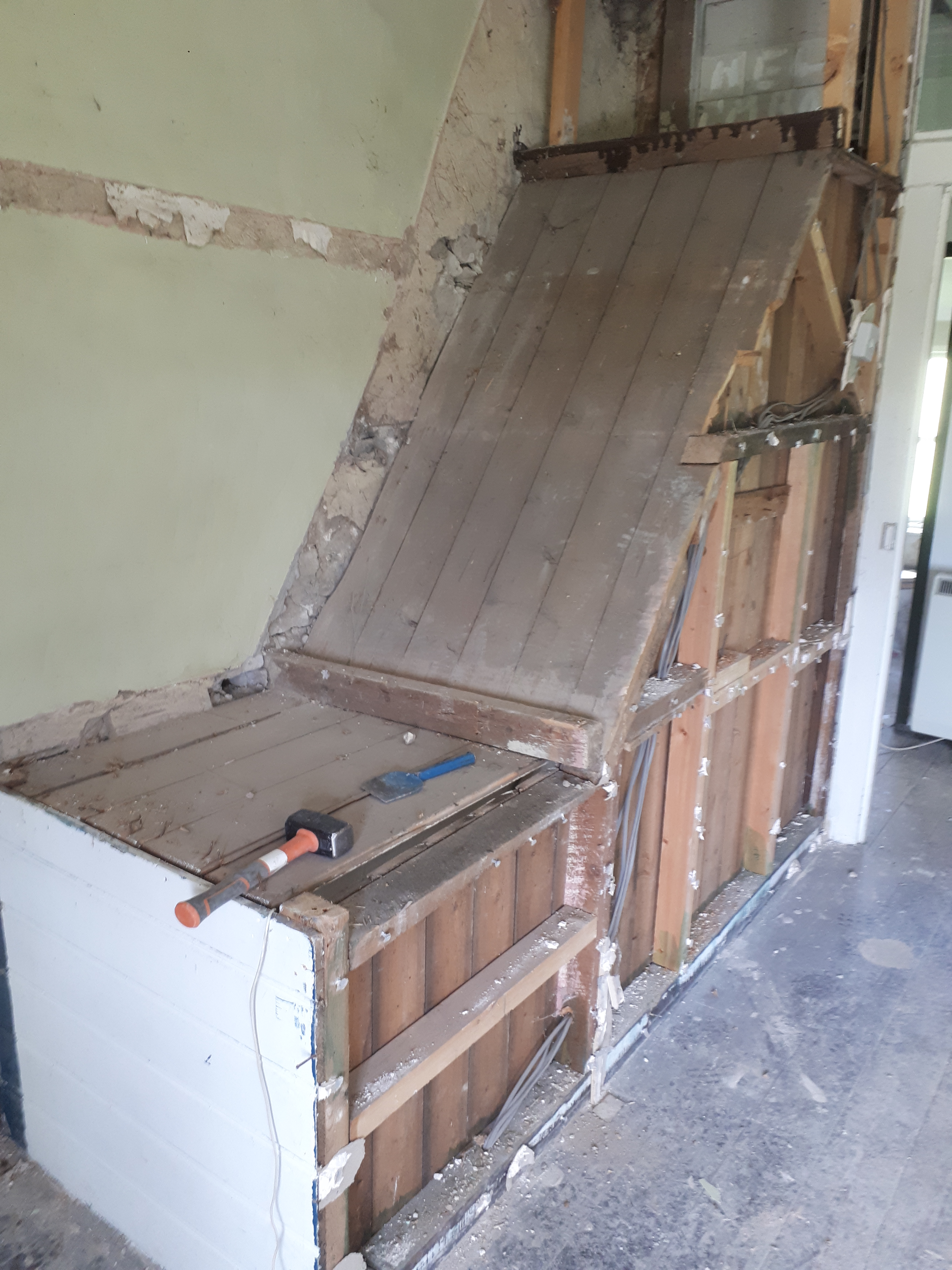 Staircase dismantling continues, with the wooden frames finally removed from both. While one staircase is set to be removed entirely once we have new joists to reinforce the floor, the other will be replaced with a slightly wider, more open version, to make both the staircase and the lounge feel larger and brighter.