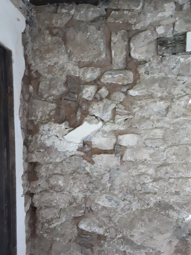 The majority of the mortar on the walls is still in good condition, with only the odd holes needing filling here in there. However, in some areas large cracks had formed, due to the walls having moved out. These cracks need to be cleared of loose stones, and filled with new stones of the right size. This work, while satisfying, is amazingly slow. At one point I noted I had been working on one meter of wall for two hours. Most of the hold up is finding stones of the right size, like trying to get the right jigsaw piece when someone has emptied several jigaws into one box.