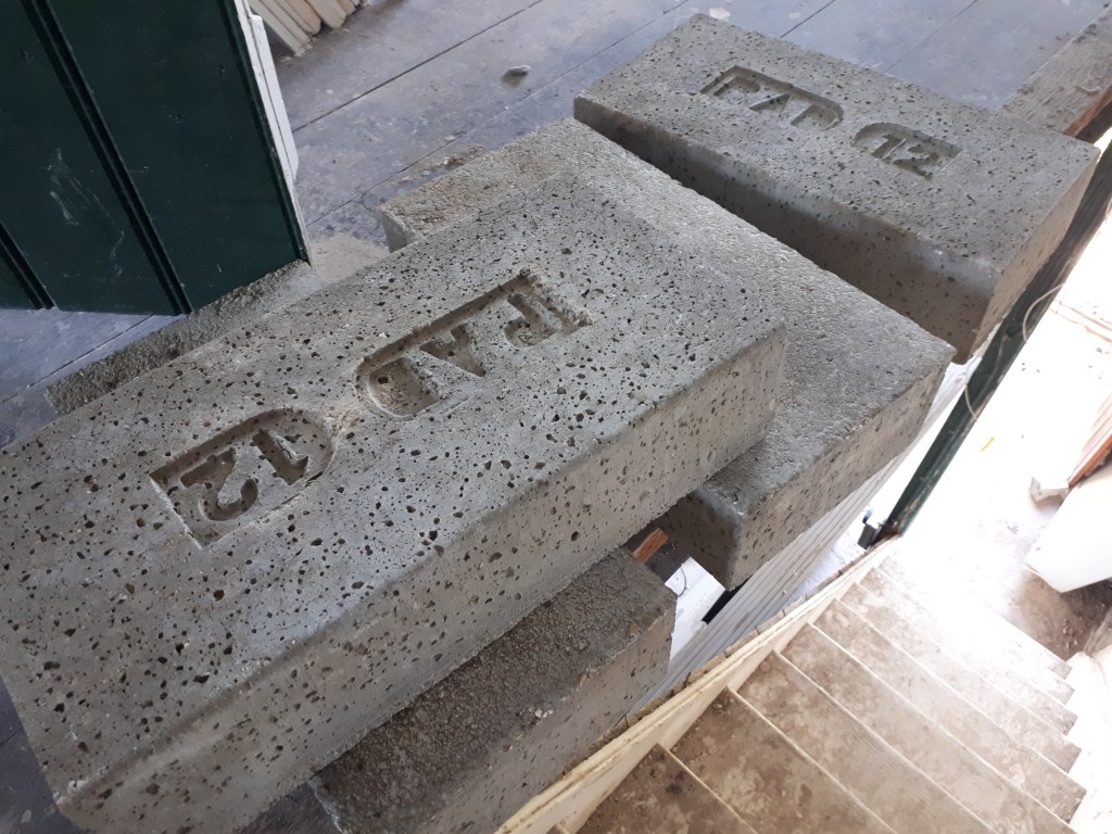 Once in place the beams will sit supported at either end on two walls, our boundary wall and what was once the boundary wall between our two, now combined, houses. Rather than sit the purlins directly on the walls our structural engineer recommended padstones of a particular size. These will help to spread the load of the heavy steel beams, and add structural integrity.