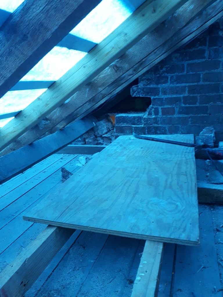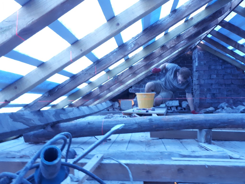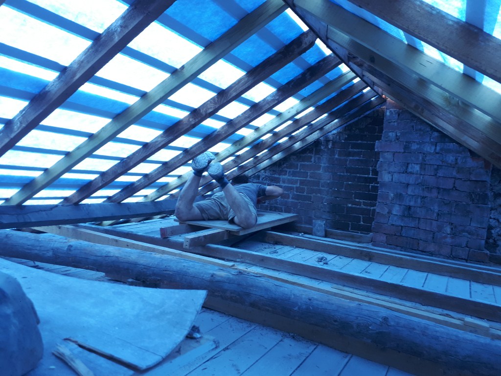Luckily for us, Helen, who lives next door, has herself had experience of home renovation and restoration, and she was quick to reassure us that it wasn’t a big problem, and could easily be resolved after the purlins were in place. So, with her blessing, we continued to make a bigger hole in her upstairs landing, ready for the fourth padstone to be put in place.