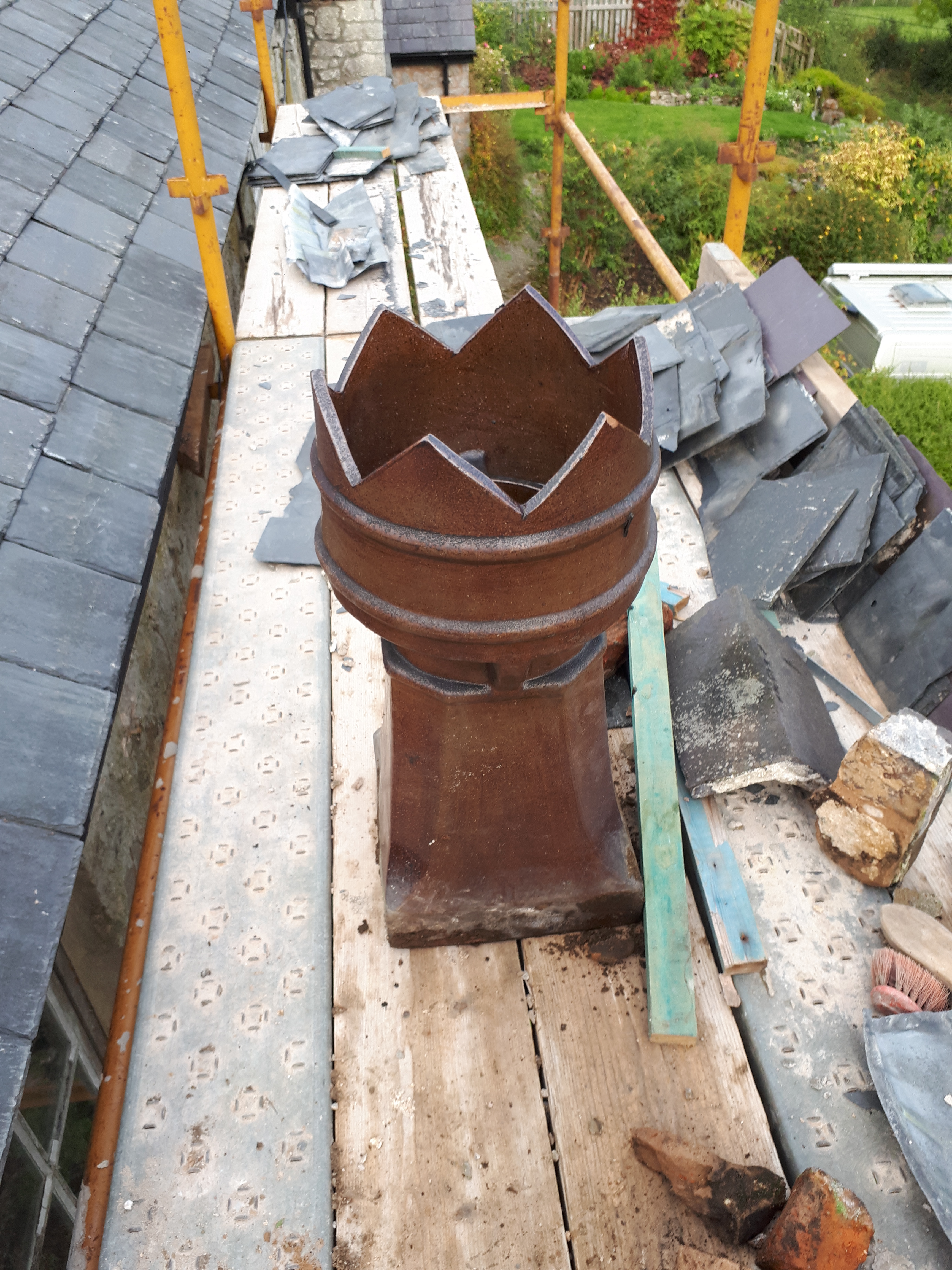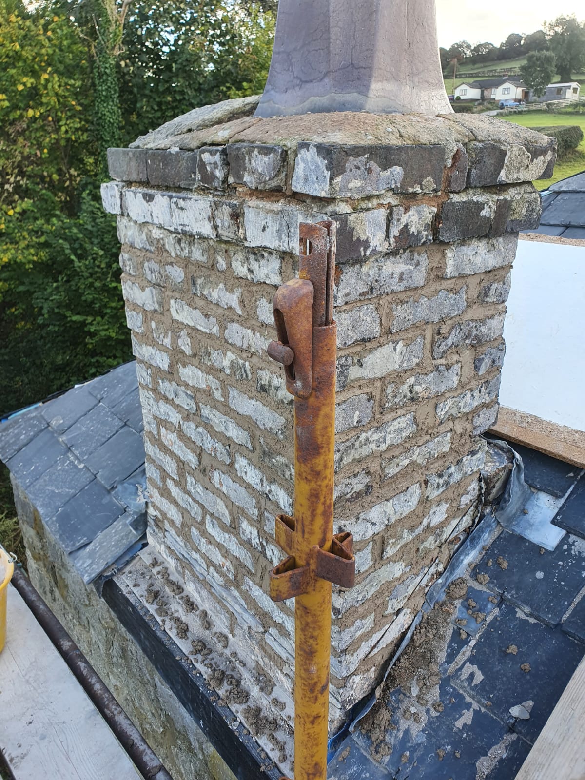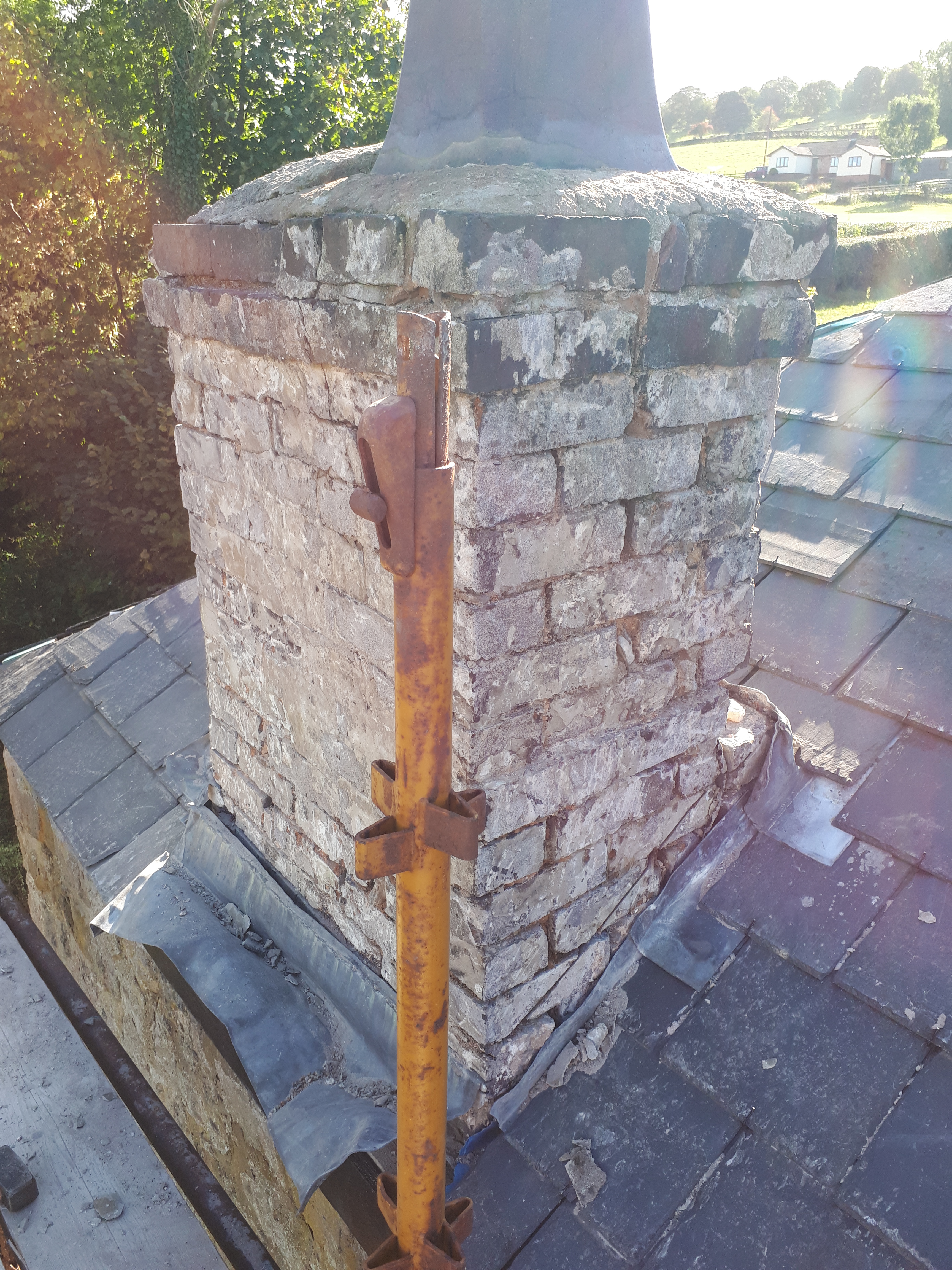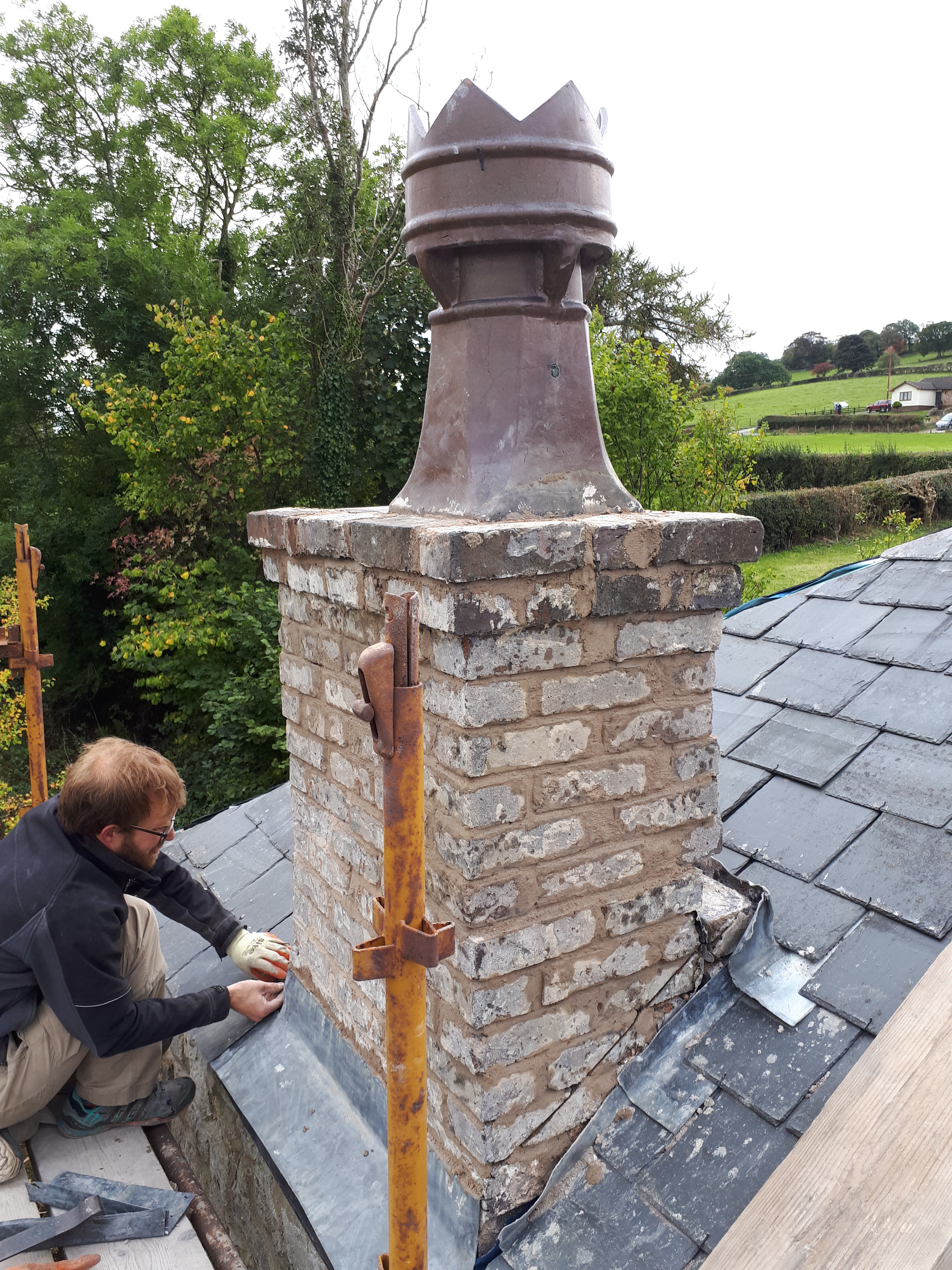 Whilst I was busy with all this Chris used the camera we had brought to check the drainage, to inspect the chimney flue, finding it unsurprisingly full of old nesting materials, which he was luckily able to remove. He then spent a frustrating hour wrestling with the lead flashing. Unfortunately we had attached the slates before correctly installing the flashing, so he had to break several slates in order to get it in the right place.