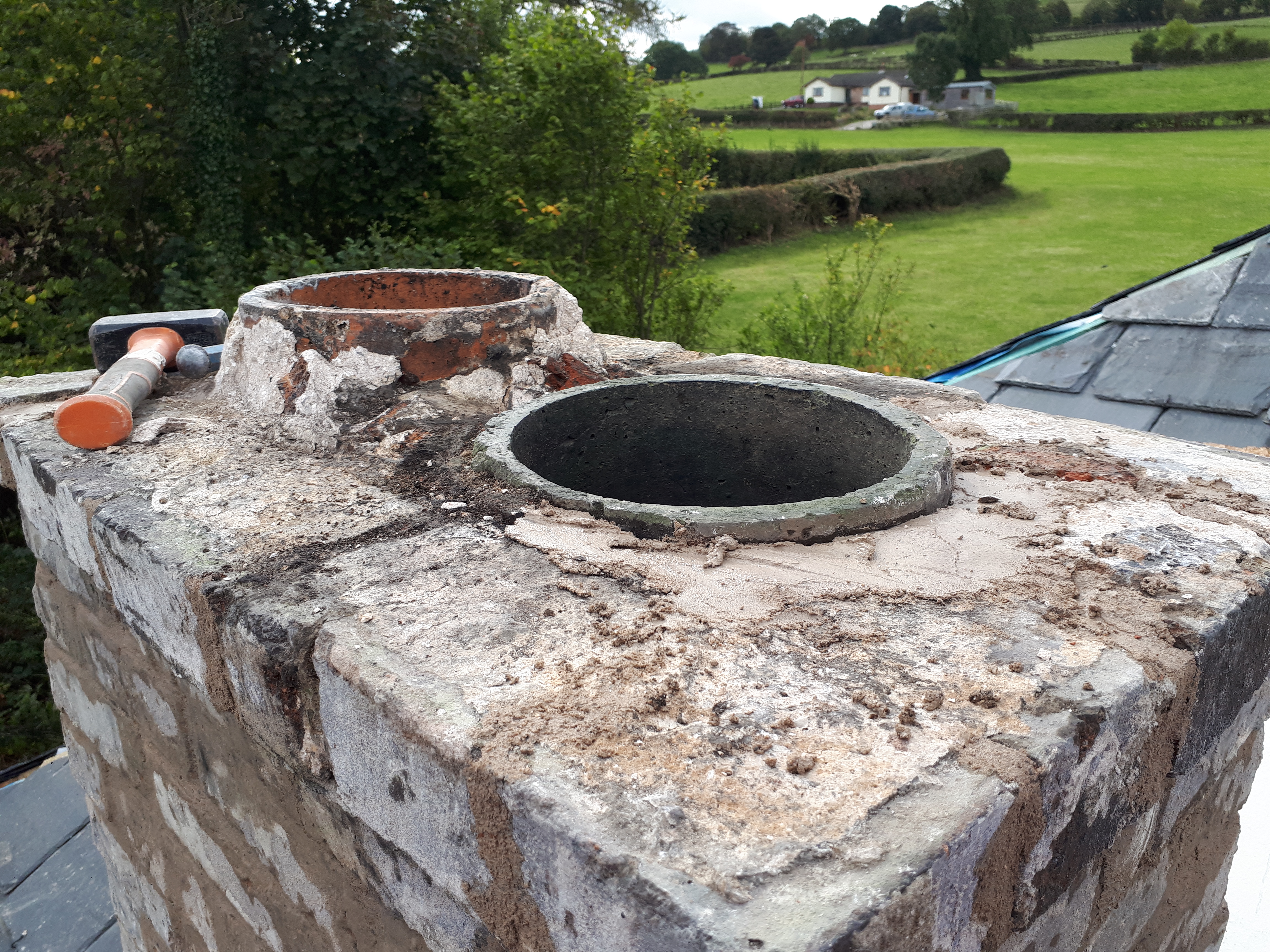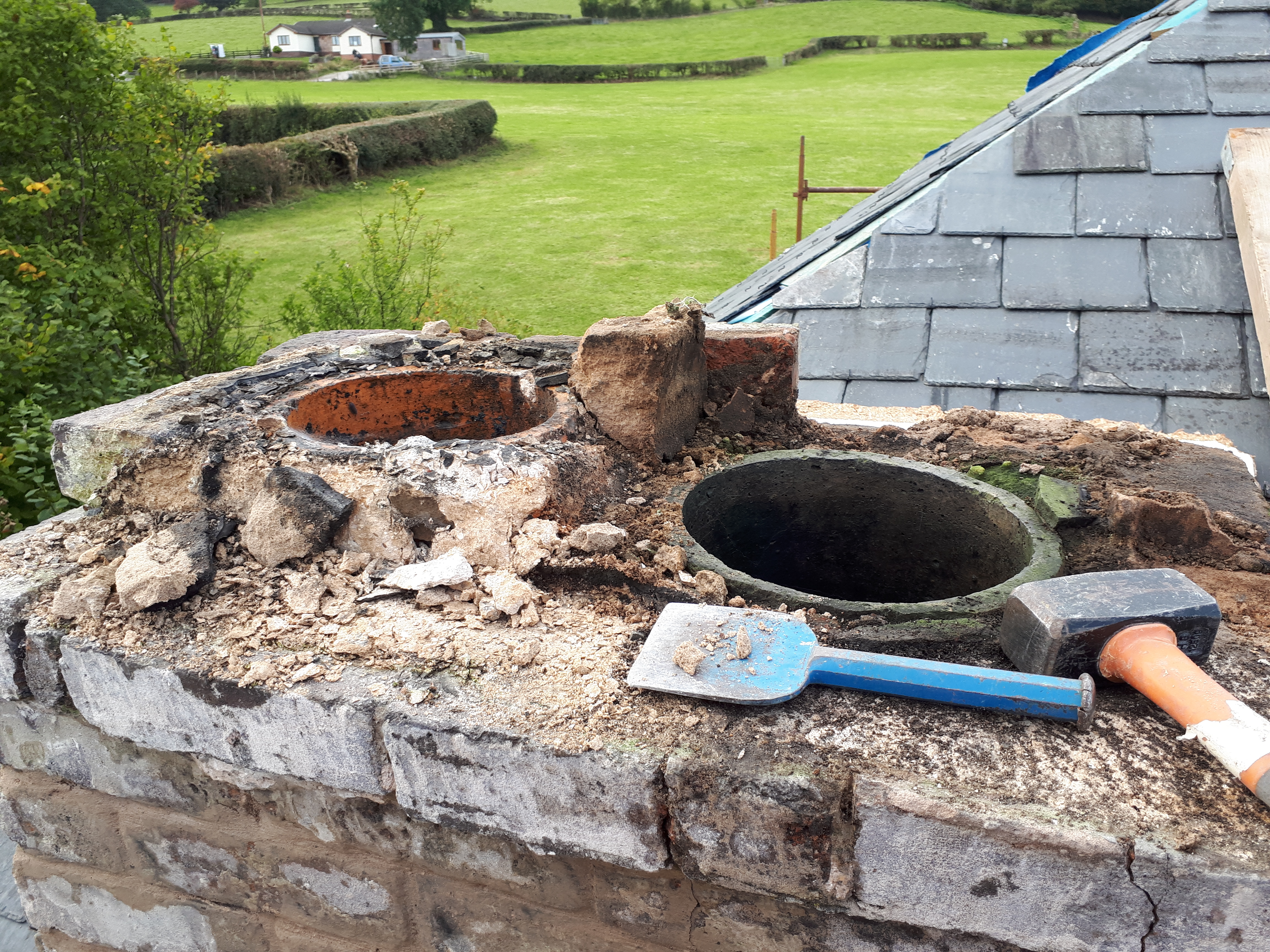 For me, I spent the whole weekend focused on our foremost chimney. Having started taking the render off, I continued to chip away, clearing out the soft mortar. The bricks were in surprisingly good condition, and for the majority of the chimney repointing was enough to make it watertight again.
