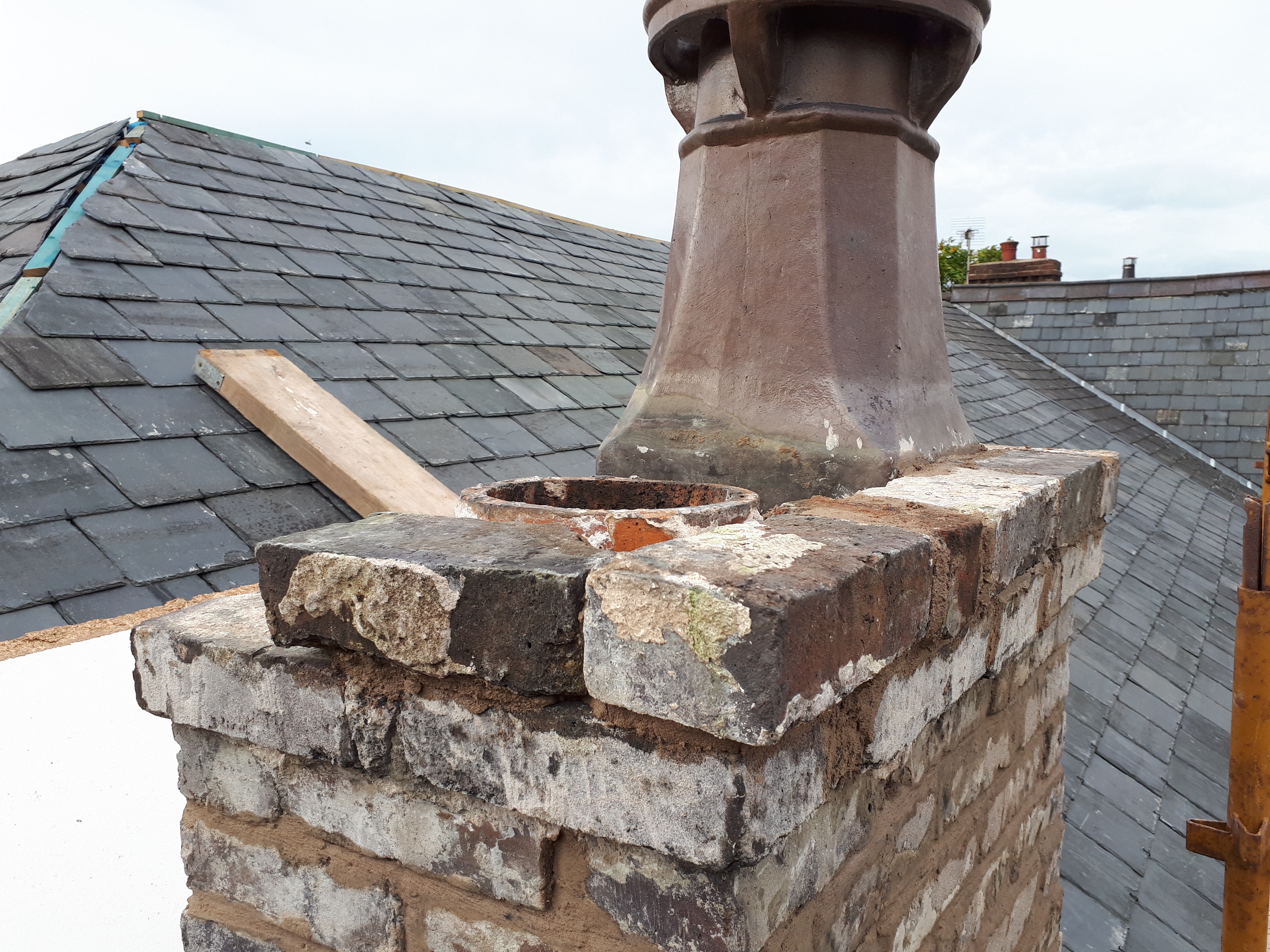 When it came to the top two rows, several of the bricks were loose, so I had to remove them in order to reset them in new mortar. However, having removed a few bricks, it became apparent the chimney pot itself wasn’t stood on anything other than old crumbling mortar. With Chris’s help to lift the pot down I could properly clear off all the old mortar before one again rebuilding everything.
