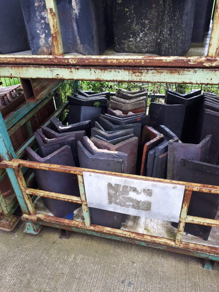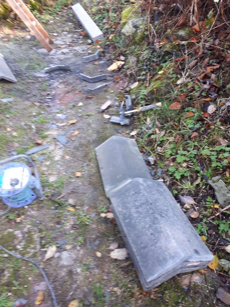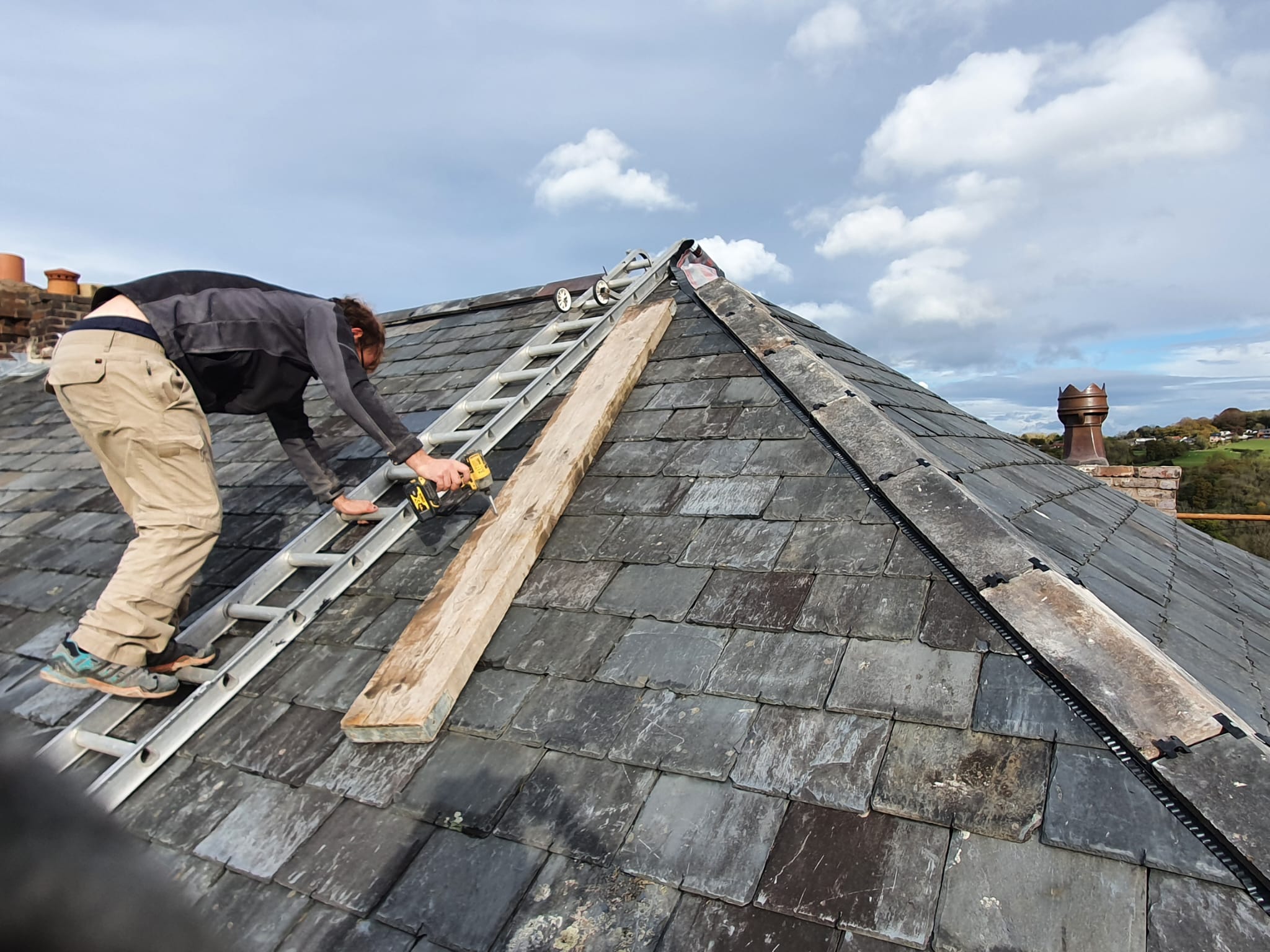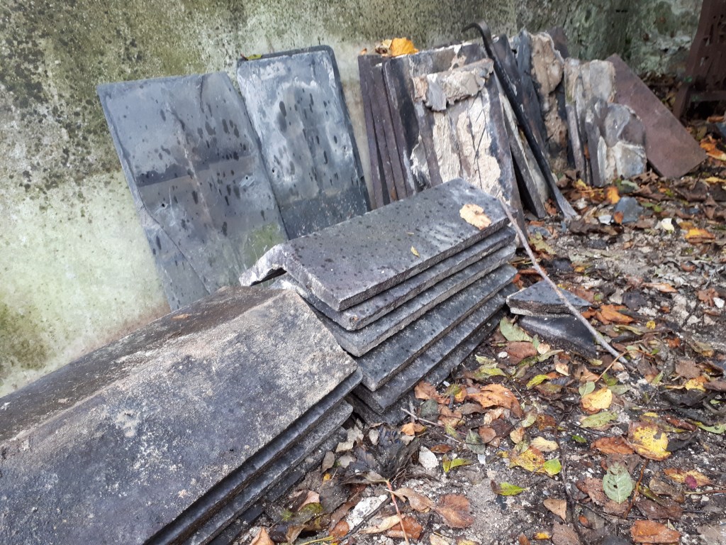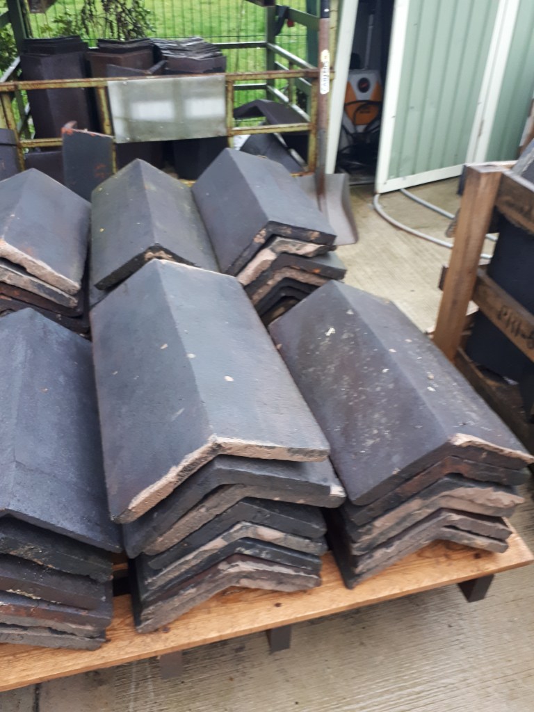 Our first job was to finish installing our run of ridge tiles. The ridge tiles that we took down when disassembling the roof had been caked in cement, which needed to be chipped off before we could reinstall them. Getting the cement off was slow and back-breaking work, and unfortunately not all of the tiles survived the process. These broken tiles, plus those that broke when we took them off the roof, were surprisingly difficult to replace. Having searched through all the usual channels, we ended up at a roofing reclaimation yard. Even then the closest we could find was a similar shape and colour, but with a raised edge at one end, where it was supposed to overlap the next tile. Our only solution was to use an angle grinder to cut off this offending edge, making the tiles just similar enough to fit in with the remaining ones we had.