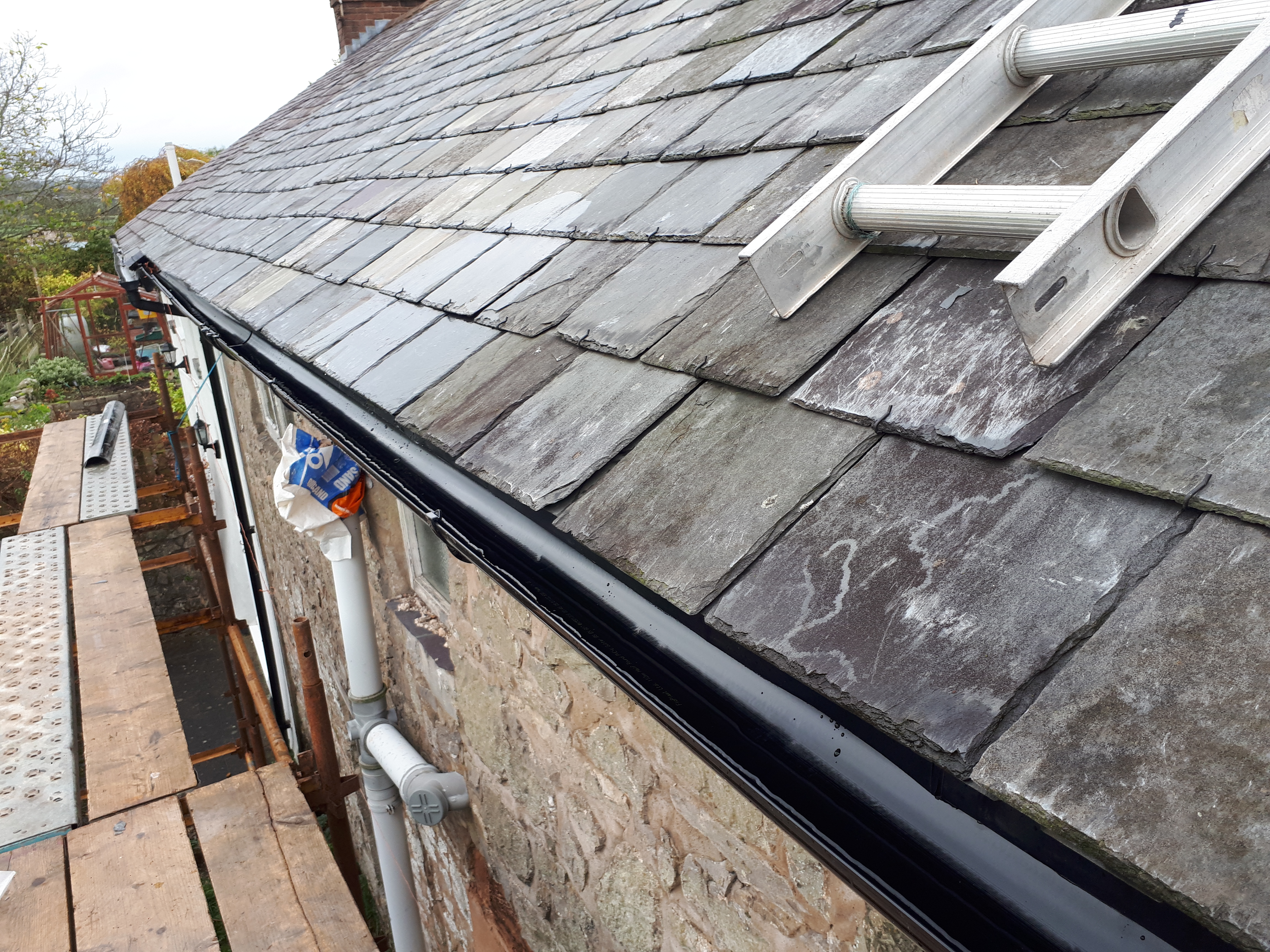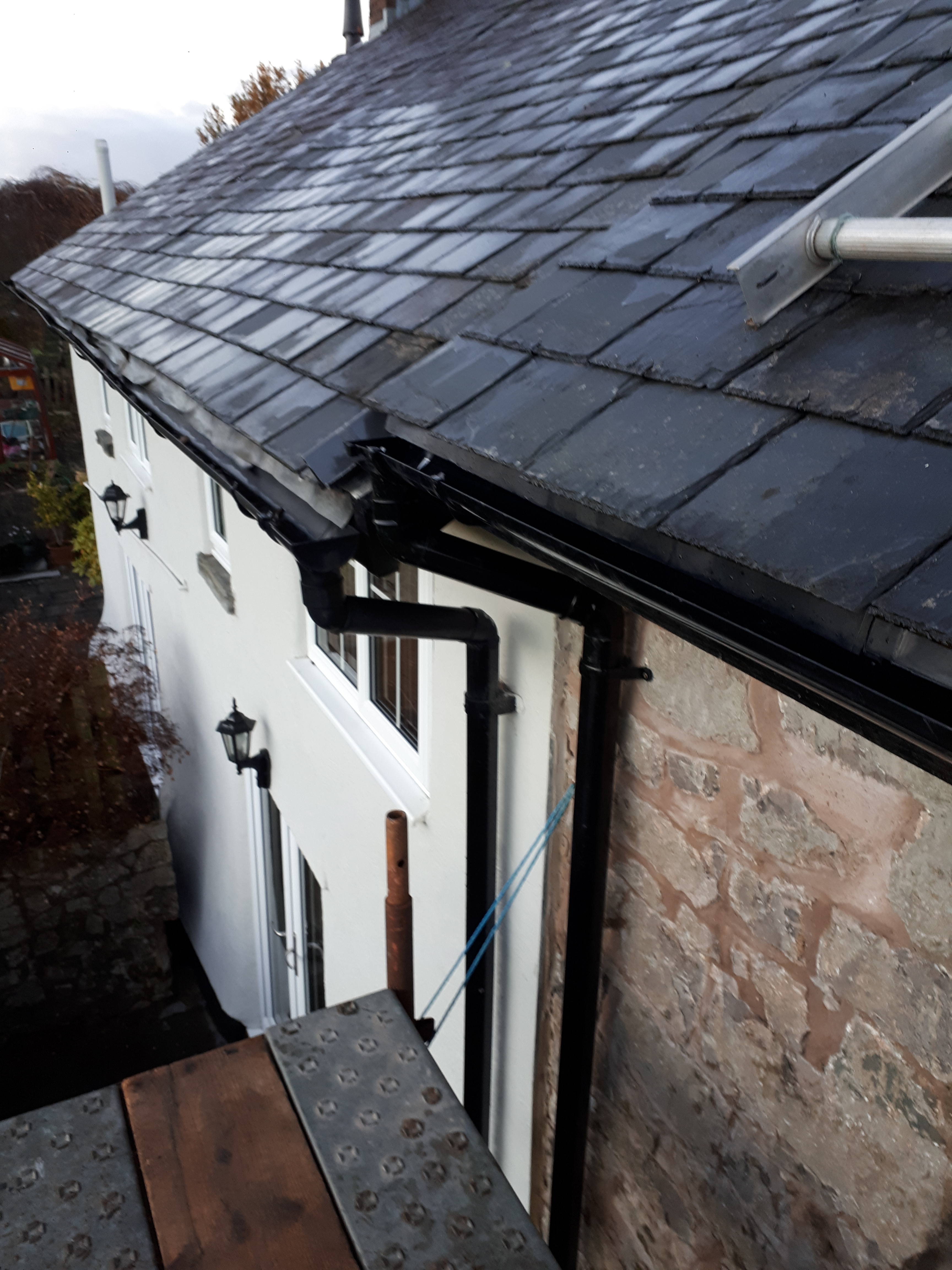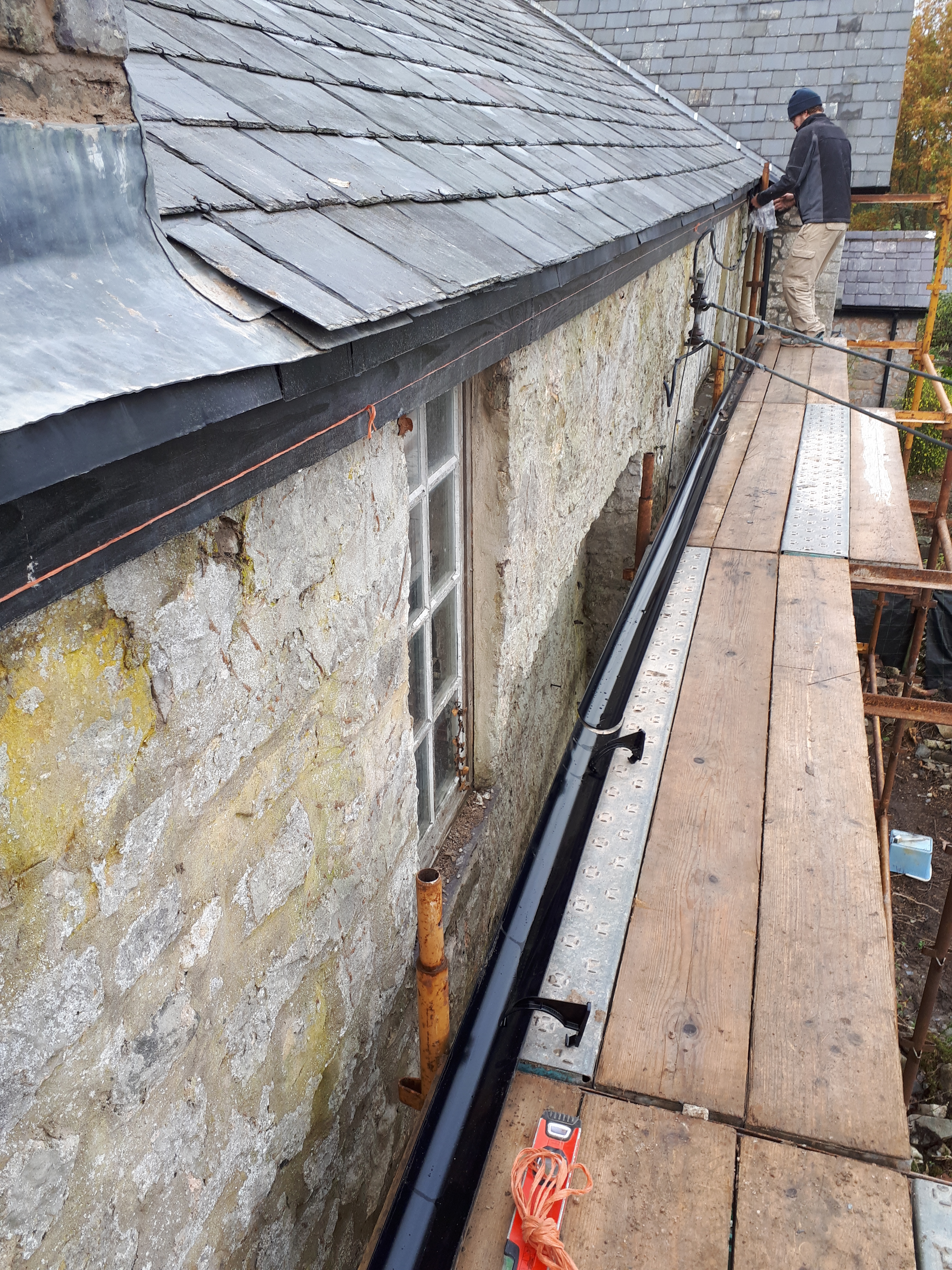 Having finished the ridge tiles, our next job was to install the guttering. At the back of the house there hadn’t been any guttering for a long time, and this had caused some serious issues with a iron support in the back wall, causing it to rust and swell. This, we believe, is the cause of many of the cracks we’ve found in the back wall.