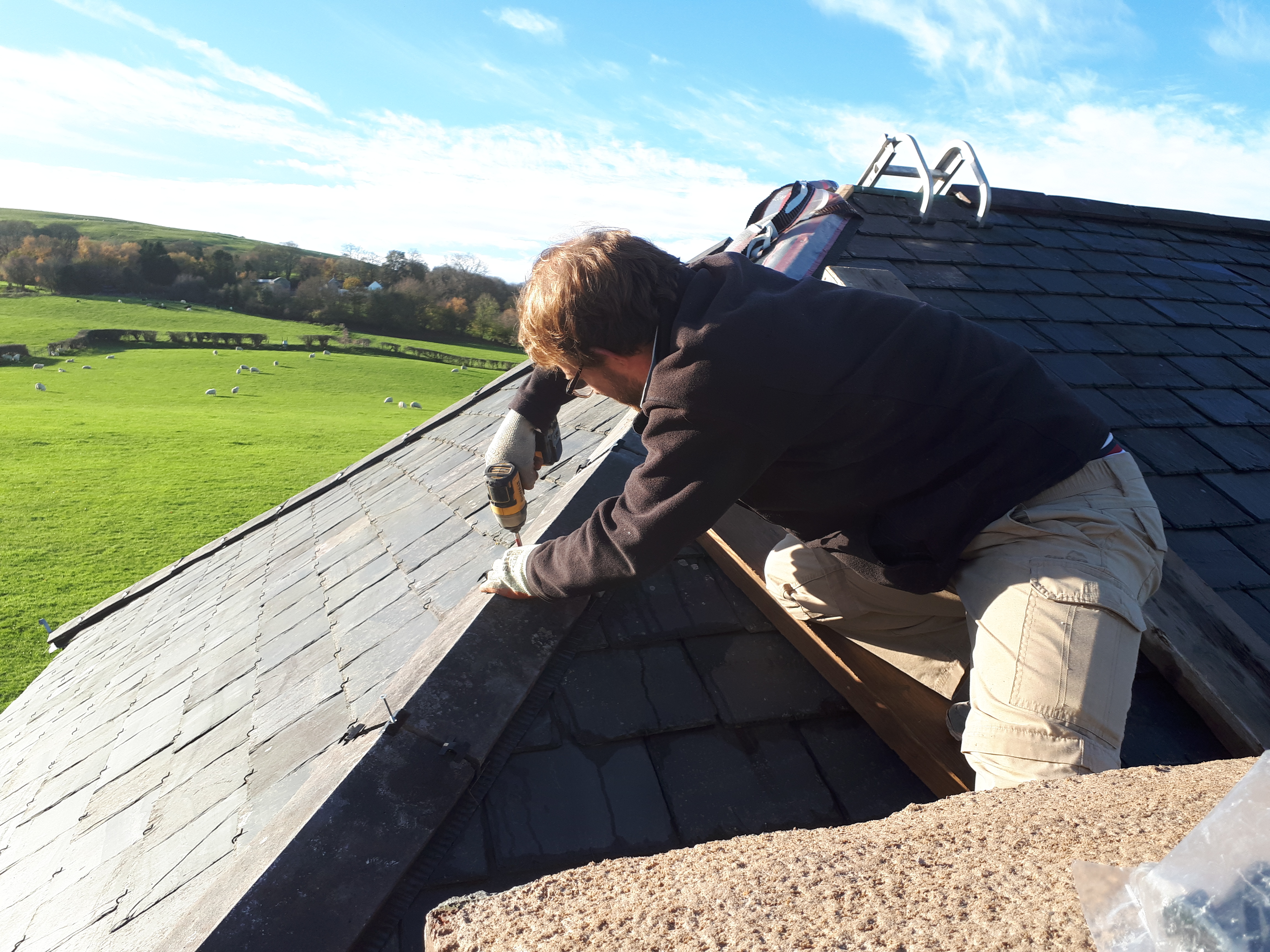 Fixing the ridge tiles in place was fairly simple. We stuck a breathable membrane along the edge of the ridge, which would allow moisture to escape from the attic. Chris had opted for a dry-fix system for attaching the ridge tiles. This involved securing them into place with a series of plastic clips, not overly difficult except for scrambling up and down scaffold boards to get the tiles in place.