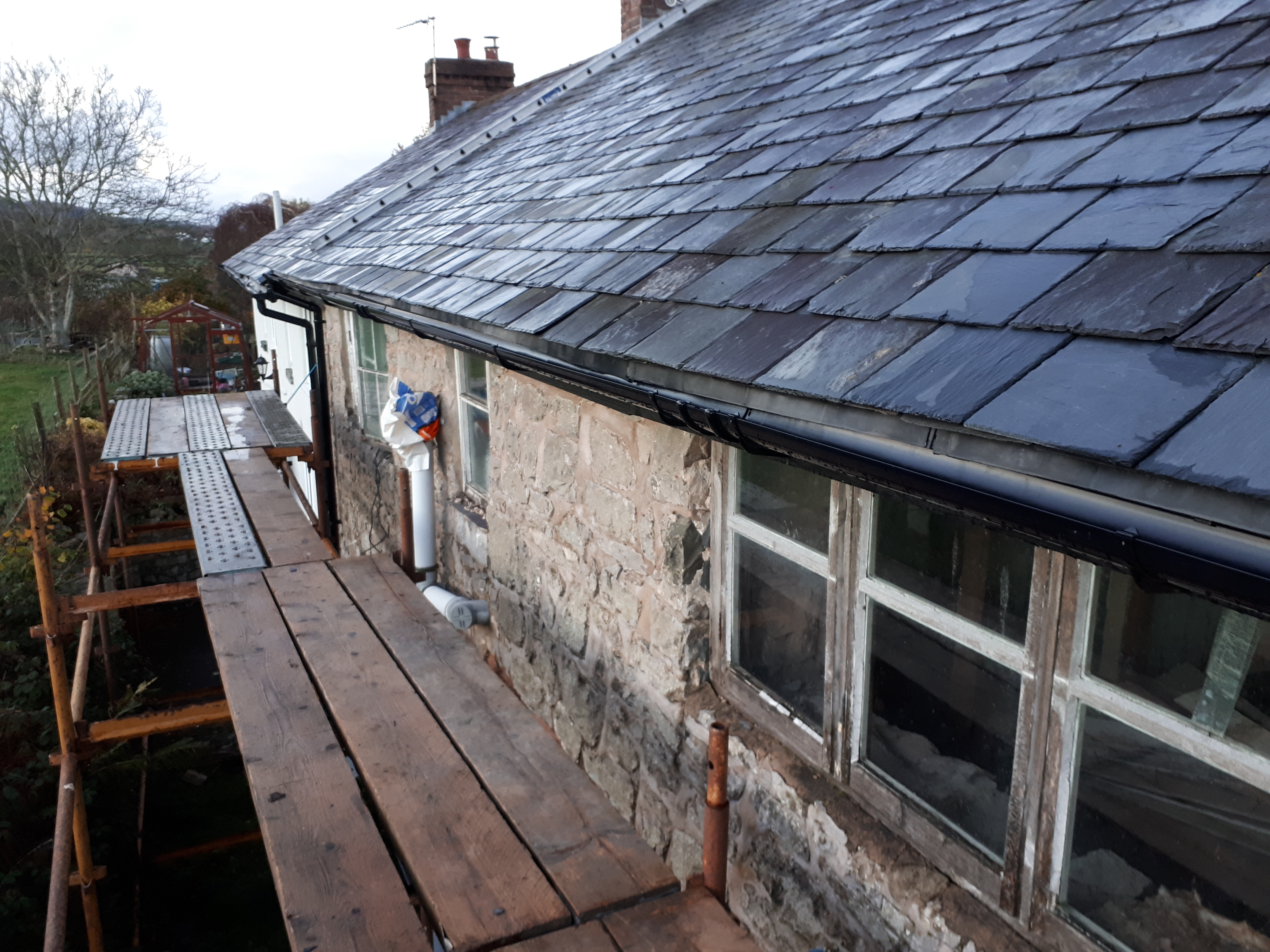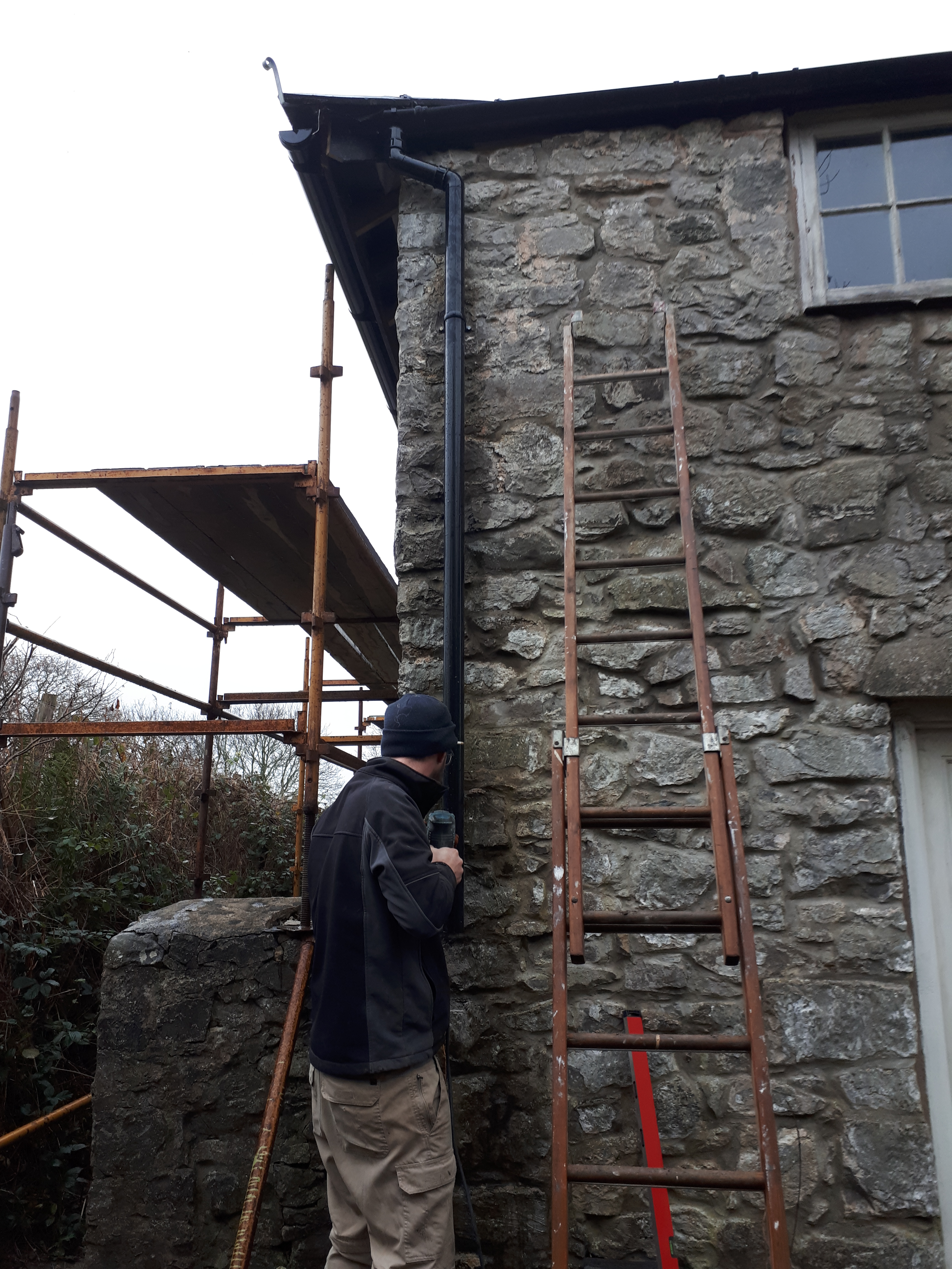 Our final task before taking down the scaffolding was to finish the last of the guttering. Rather than move the scaffolding yet again, we opted for installation via ladder on the side of the house. This was the straightest and best bit of guttering we installed, either showing we had significantly improved our skill level, or because this side of the house is the least wobbly (I think the latter).