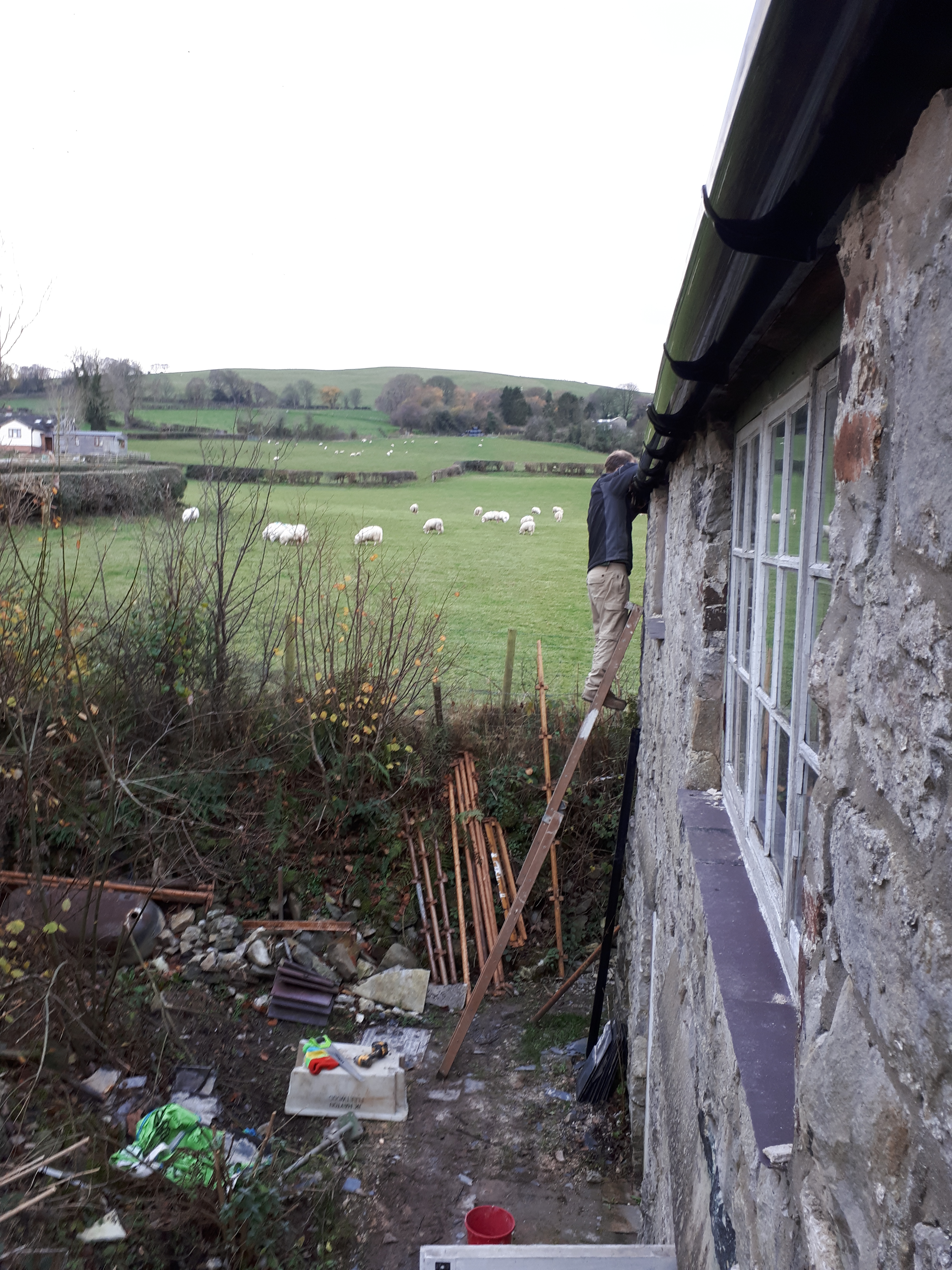 Putting on the downpipe didn’t take too long, however we left the final section, as the plan is to dig a soakaway for the rainwater, so it can seep into the front garden. This will save digging drainage in front of the house. While the downpipe at the back of the house runs into an existing drain, we will need to dig a drain for the one at the side of the house. This will be part of our work with a mini digger to establish the rainwater drains at the back and side of the house. Currently, the existing pipe is crushed, and during heavy rains the water backs up and floods our neighbours kitchen. So top priority before winter truly sets in.