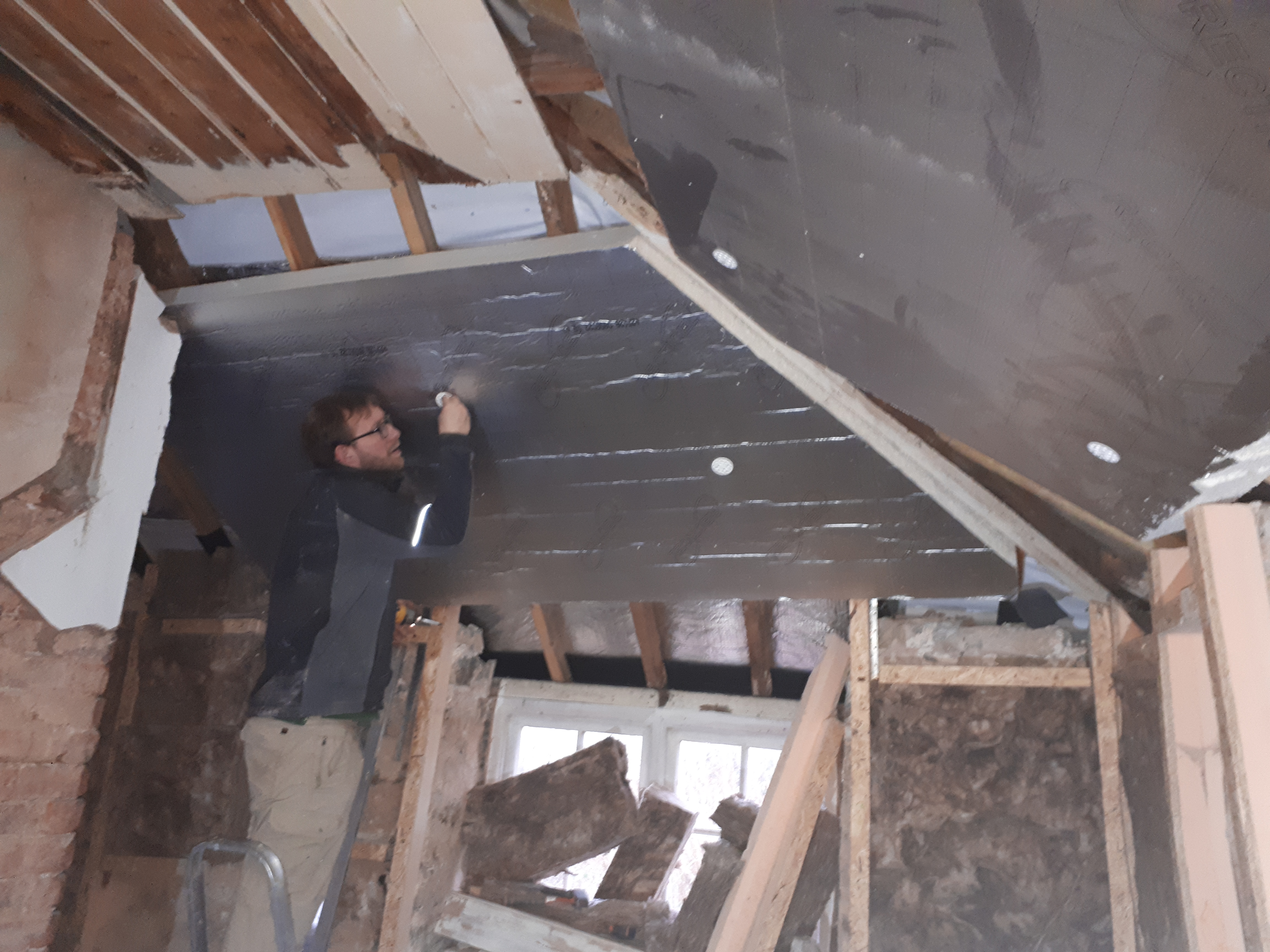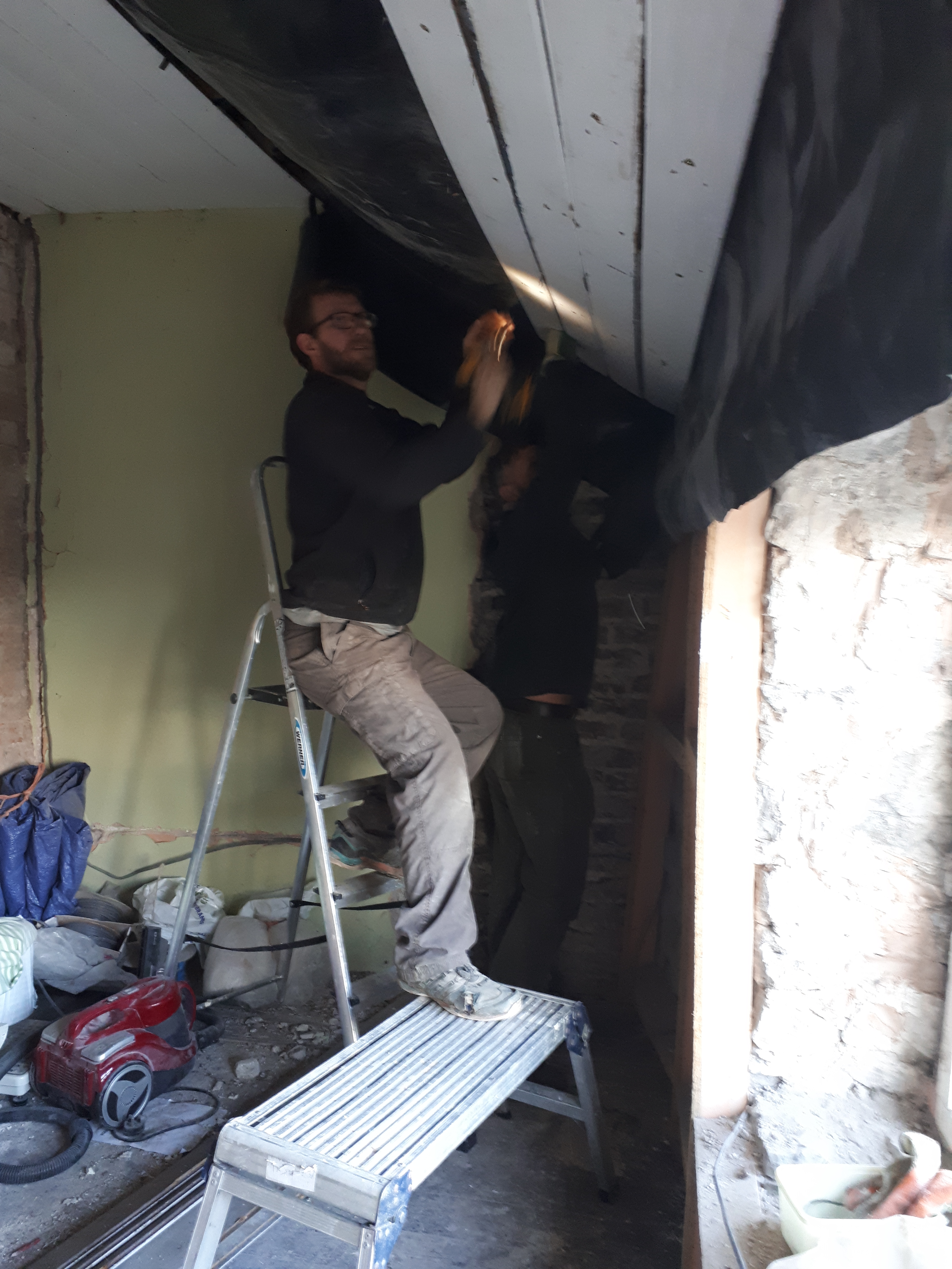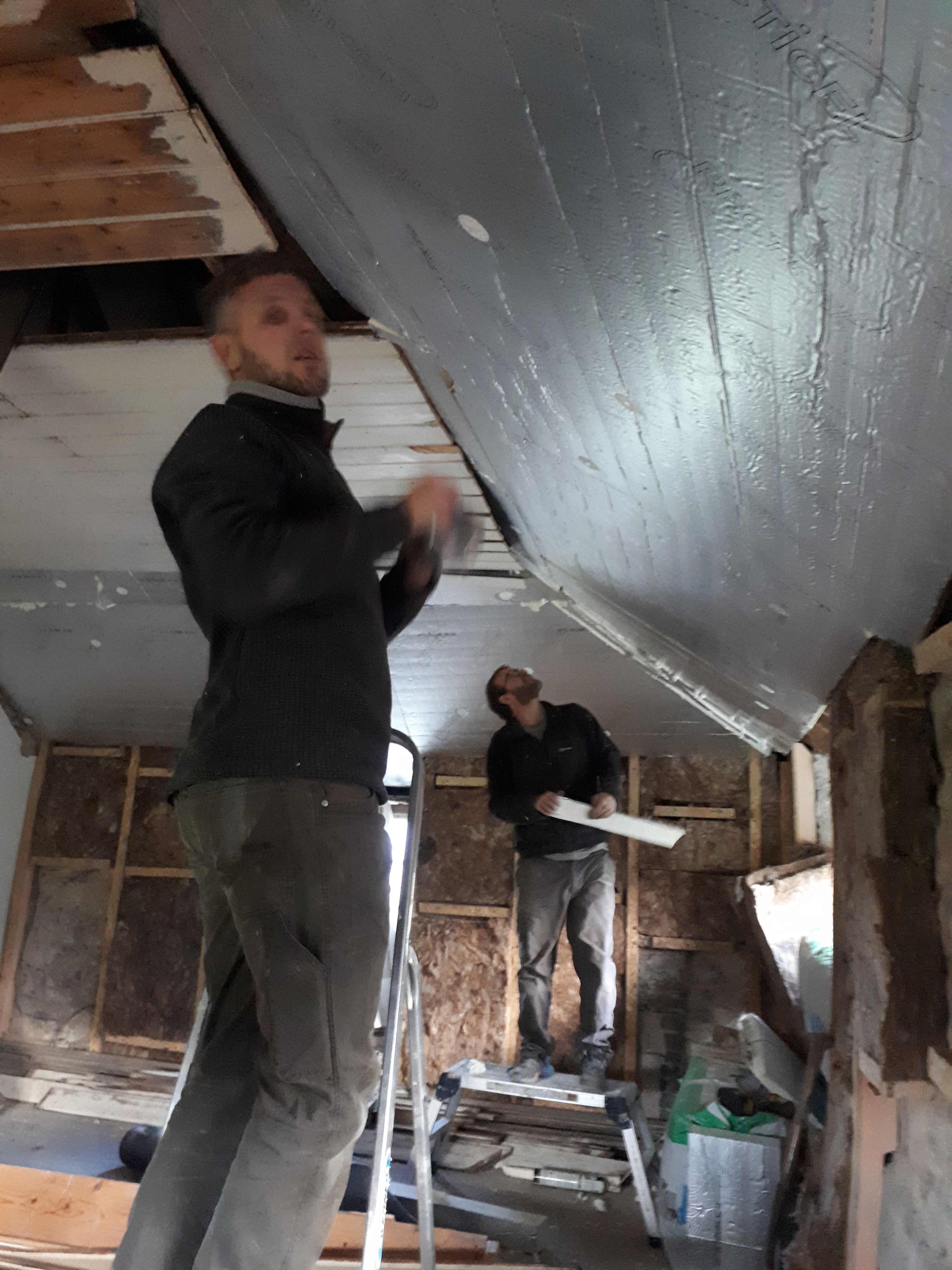 On our final day we started a completely new task, for good measure, starting to replace the wooden ceiling slats. To do this we needed to first cover the insulation with a vapour membrane. This was an awkward job, involving at least three pairs of hands, luckily Chris’s friend Jay (and his dog Rosie) joined us, making an impossible task much easier. Once the joins in the insulation were sealed with aluminium tape, and the vapour membrane semi-attached, we began to attach the old ceiling boards. Having spent time marking where the rafters were onto the insulation boards, we then realised we couldn’t see the markings with the black plastic in the way. A little guesswork was therefore required to place the screws. I was quite pleased with the finished result. There’s definitely lots of filling and sanding on the horizon, but considering how old and brittle they are they went back up really nicely. With one room done, and two ready for boards to go up, it was a good end to our time off.