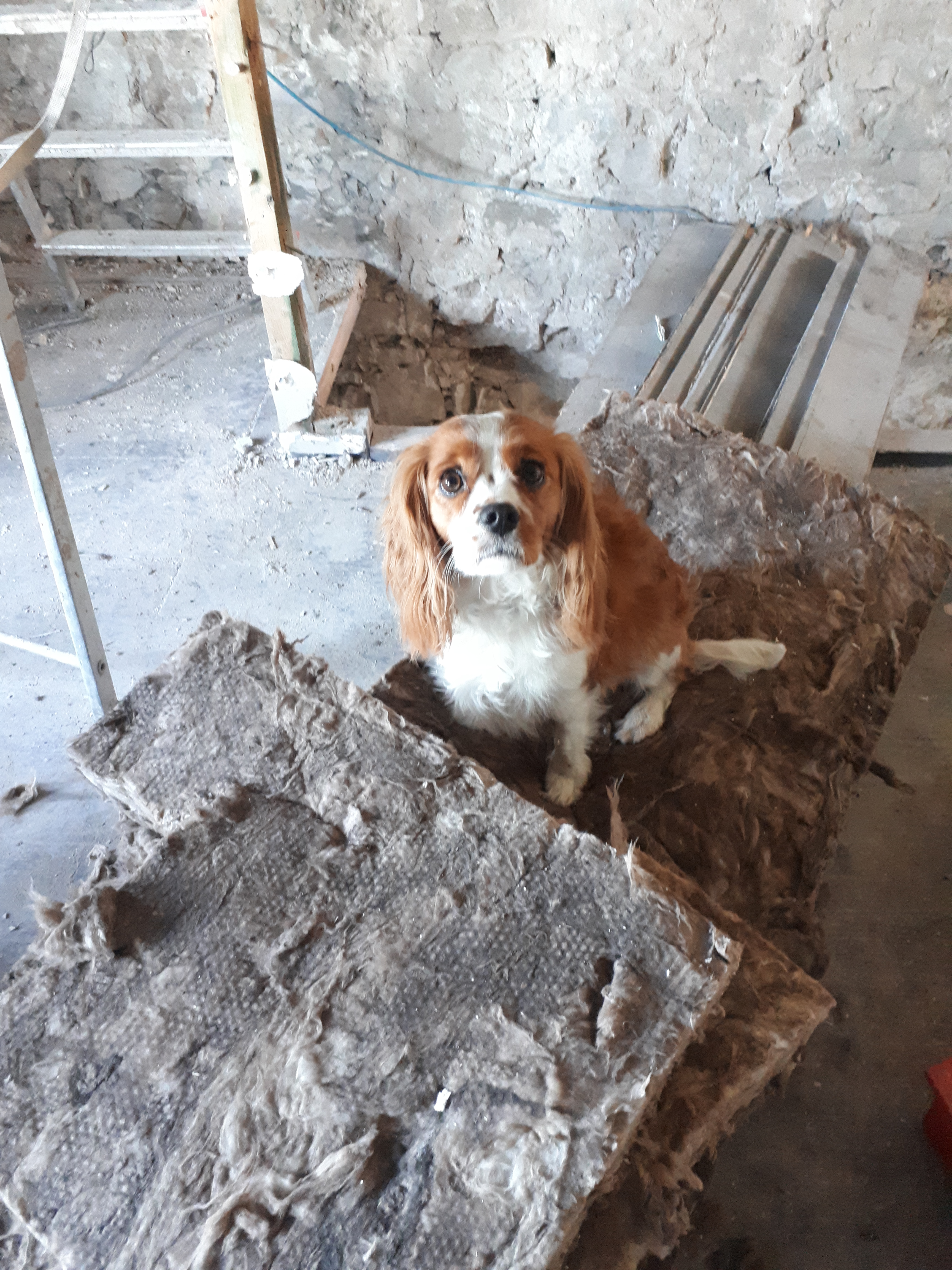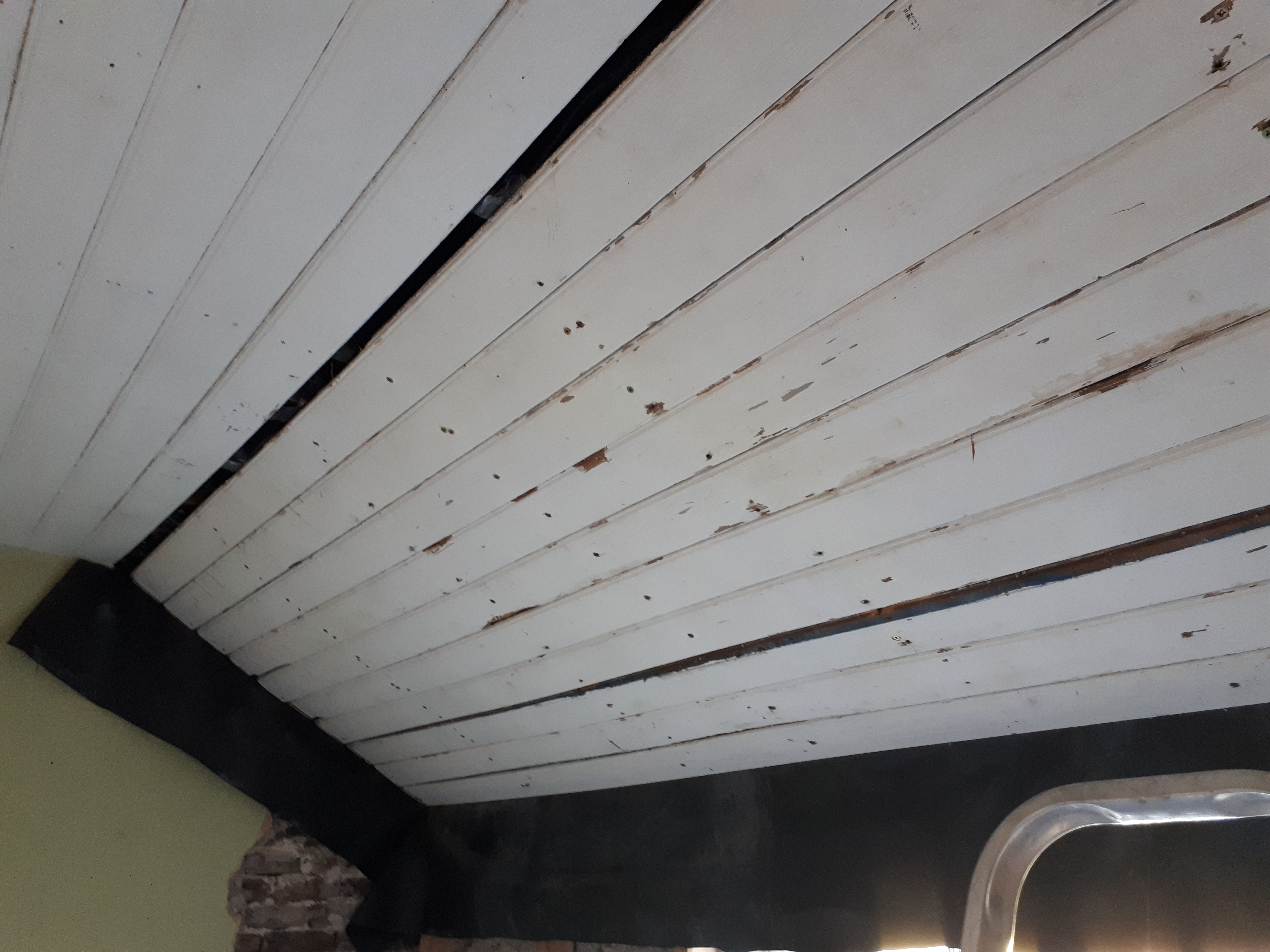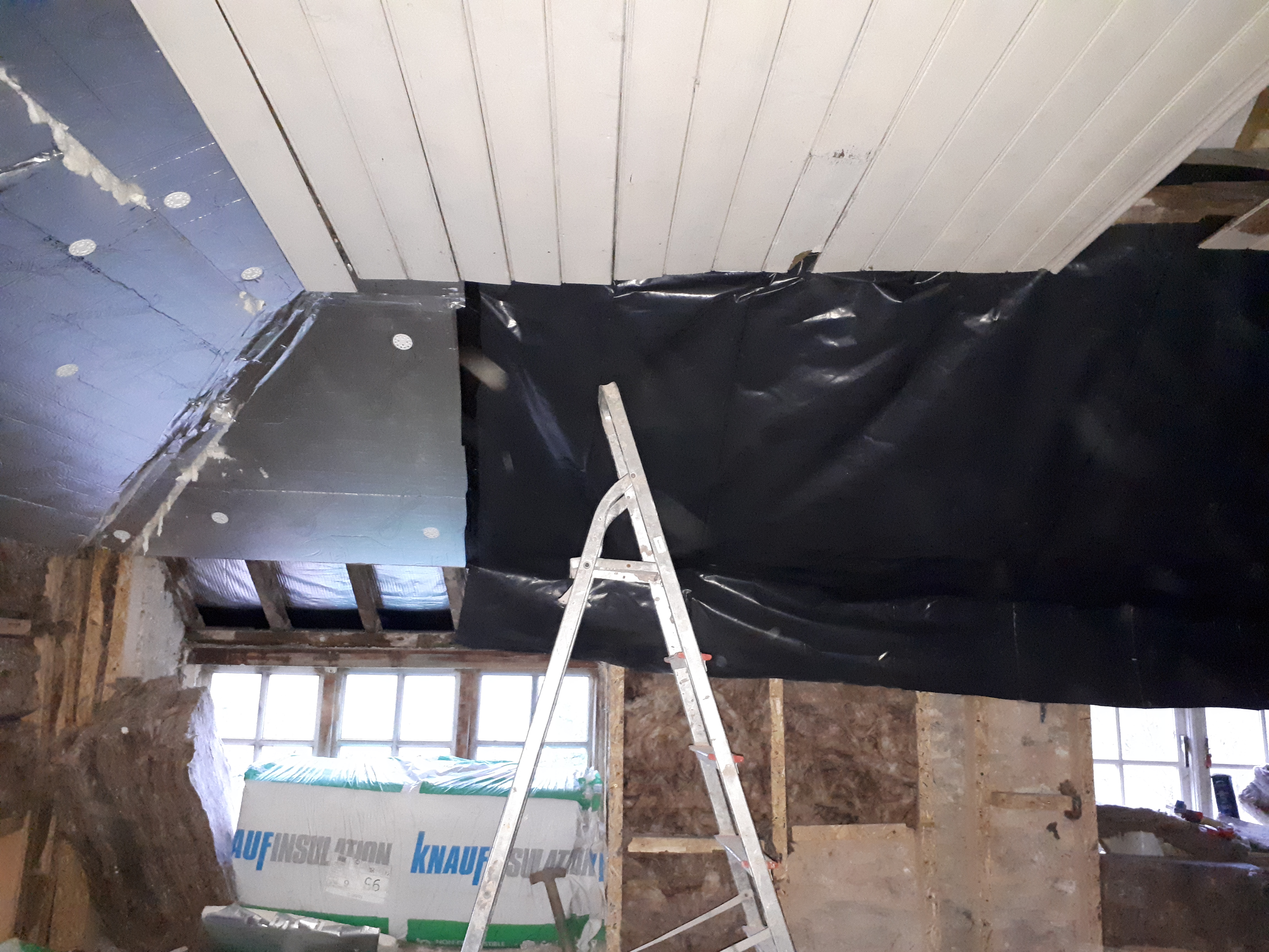 On our final day we started a completely new task, for good measure, starting to replace the wooden ceiling slats. To do this we needed to first cover the insulation with a vapour membrane. This was an awkward job, involving at least three pairs of hands, luckily Chris’s friend Jay (and his dog Rosie) joined us, making an impossible task much easier. Once the joins in the insulation were sealed with aluminium tape, and the vapour membrane semi-attached, we began to attach the old ceiling boards. Having spent time marking where the rafters were onto the insulation boards, we then realised we couldn’t see the markings with the black plastic in the way. A little guesswork was therefore required to place the screws. I was quite pleased with the finished result. There’s definitely lots of filling and sanding on the horizon, but considering how old and brittle they are they went back up really nicely. With one room done, and two ready for boards to go up, it was a good end to our time off.