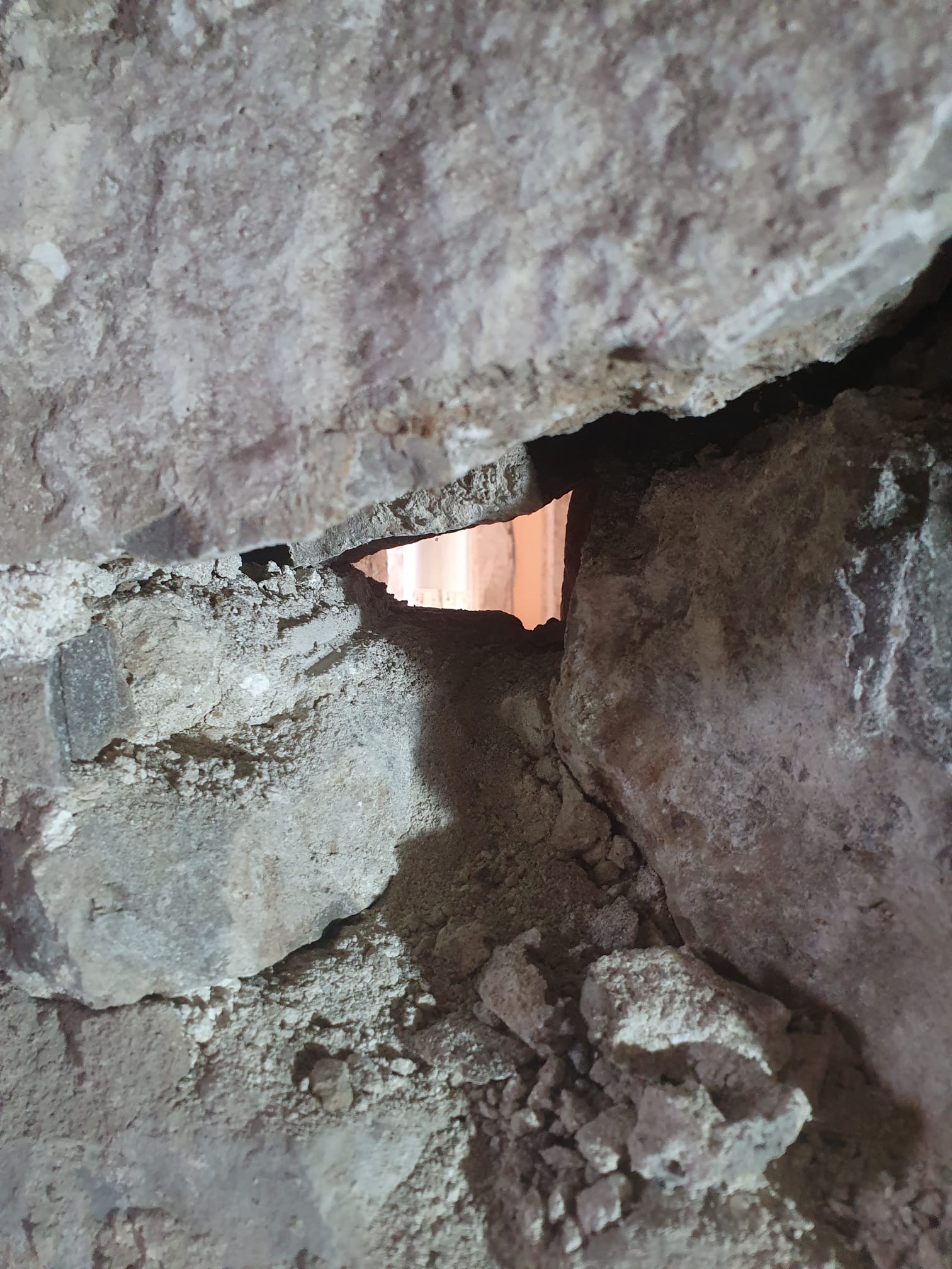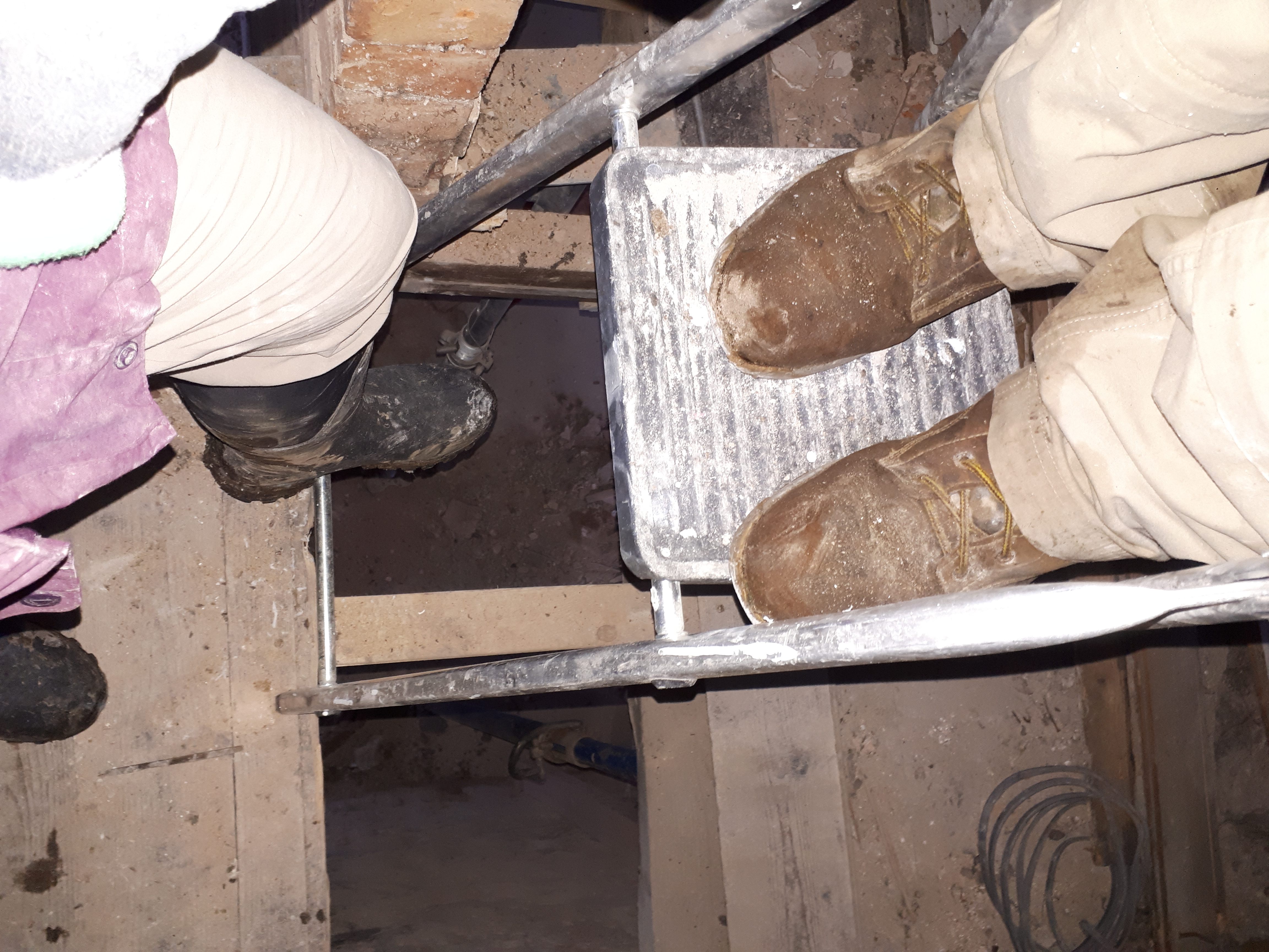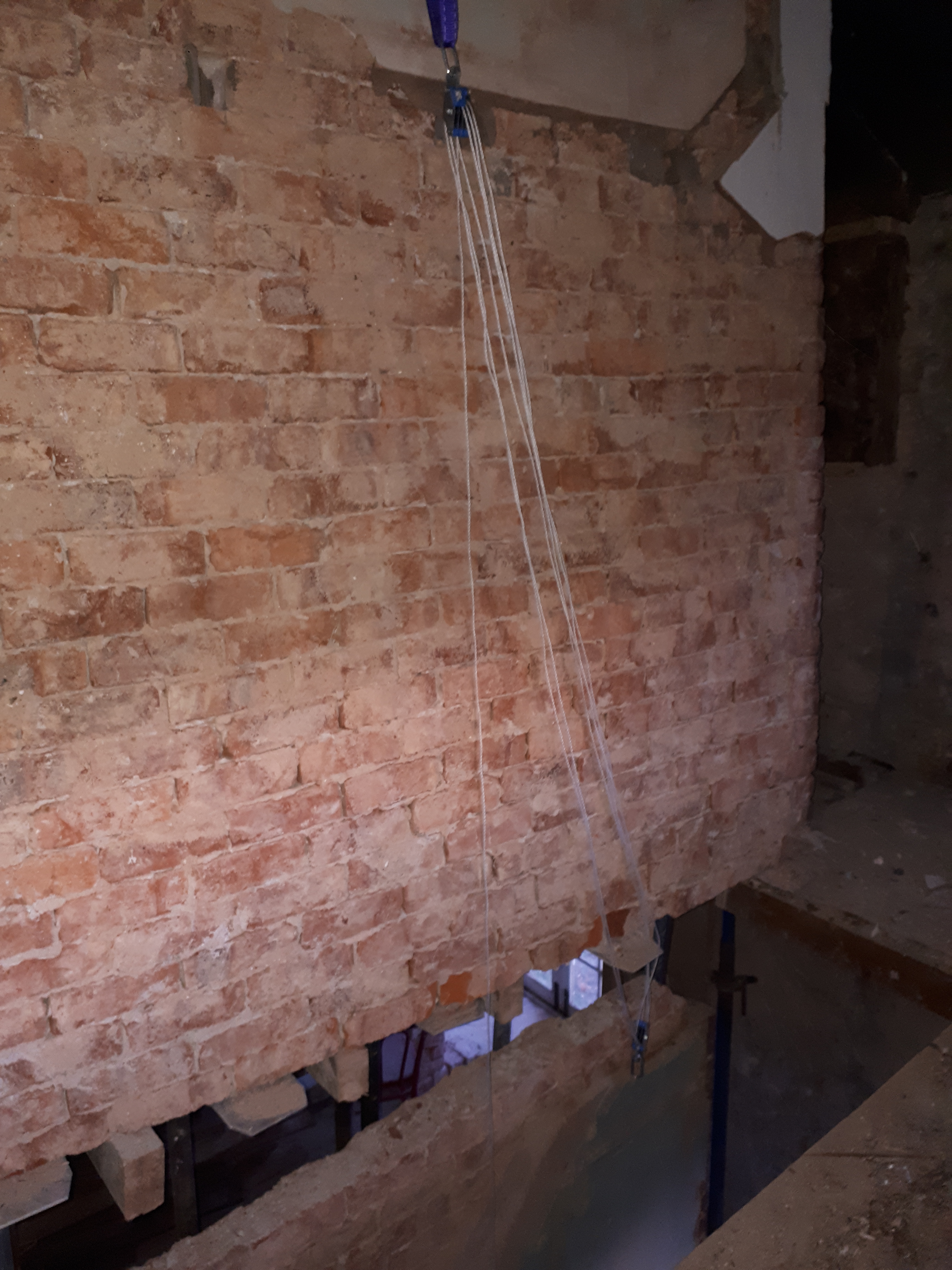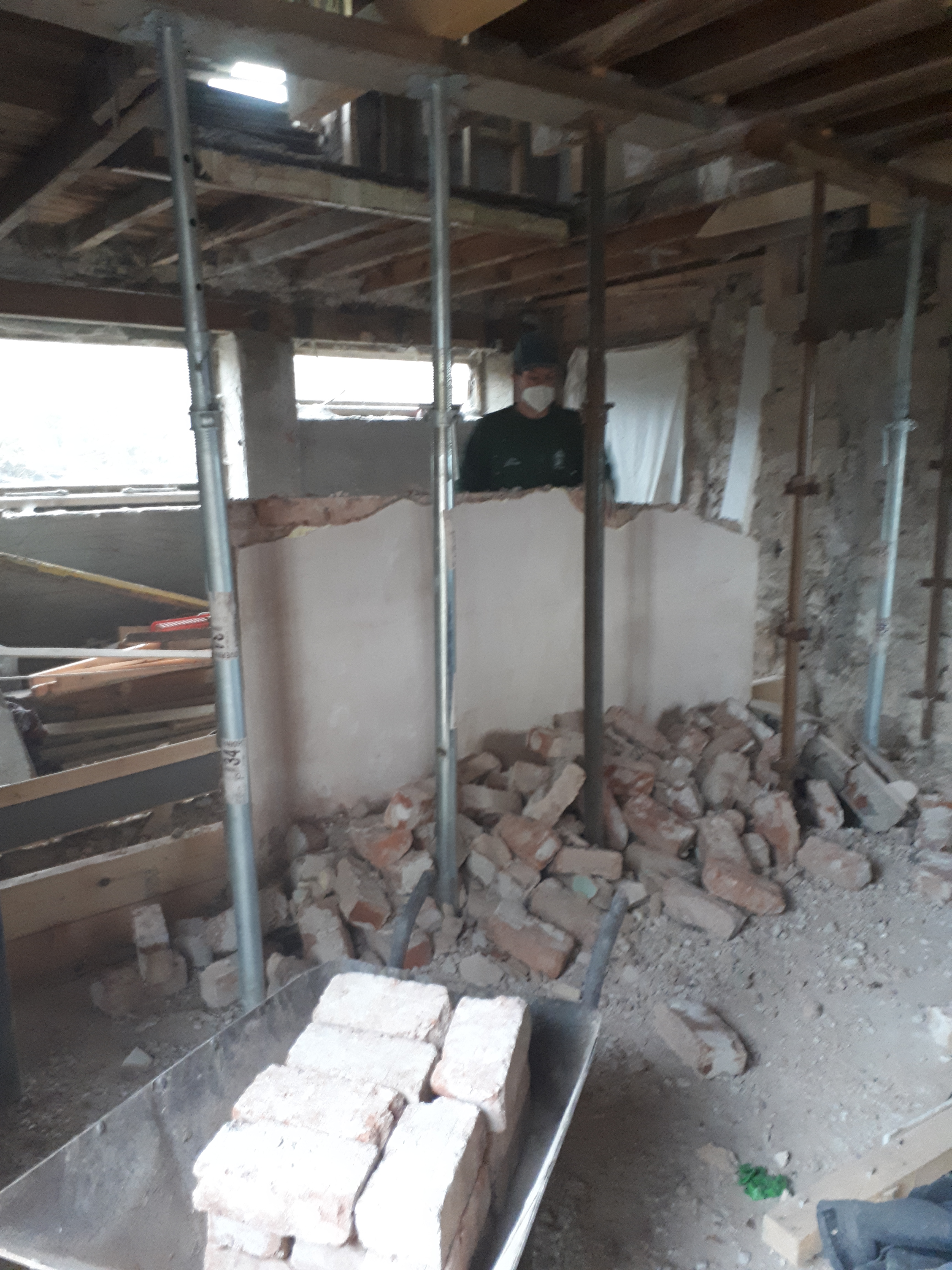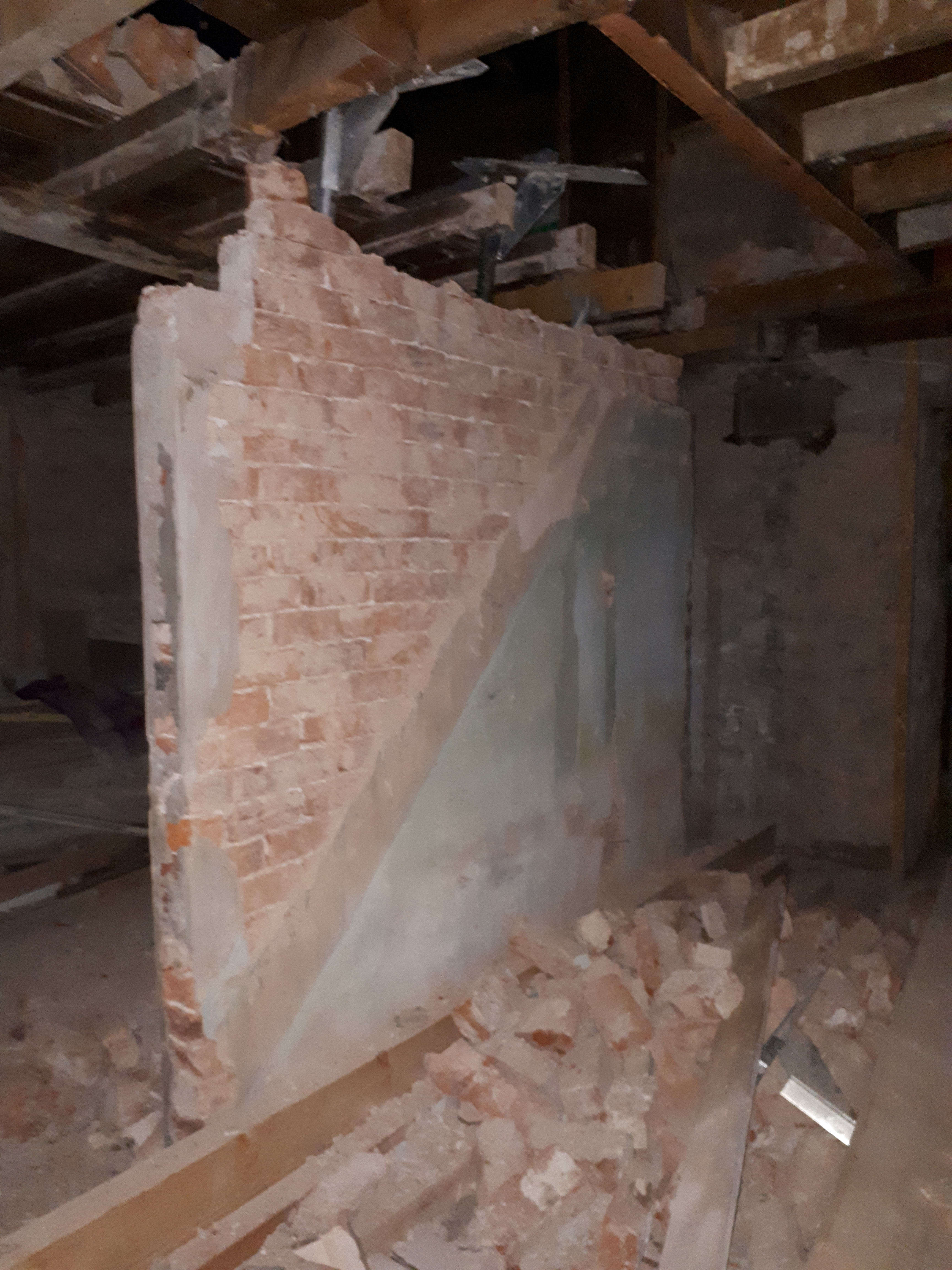 While Chris busied himself trimming down the large timbers to fit in the side of the steel, I began taking out the bricks below the acro props. I took the first brick out gingerly, worried more would instantly fall from above. Yet the wall remained strong. With each brick I removed I felt more and more confident the plan was going to work. Yet… as I made to remove the last brick I looked up to notice a bulge in the wall. The wall was faltering, unable to support itself.
