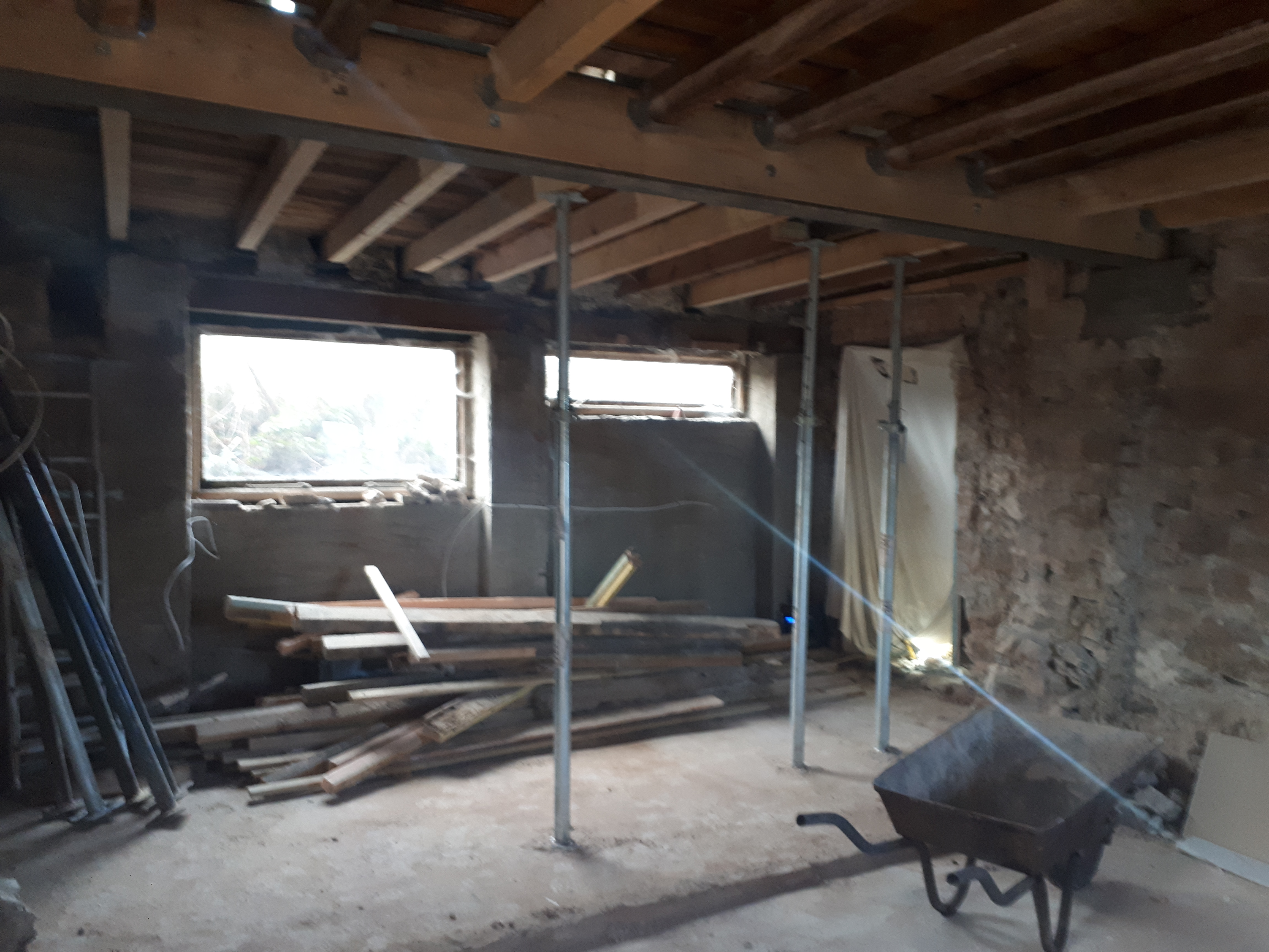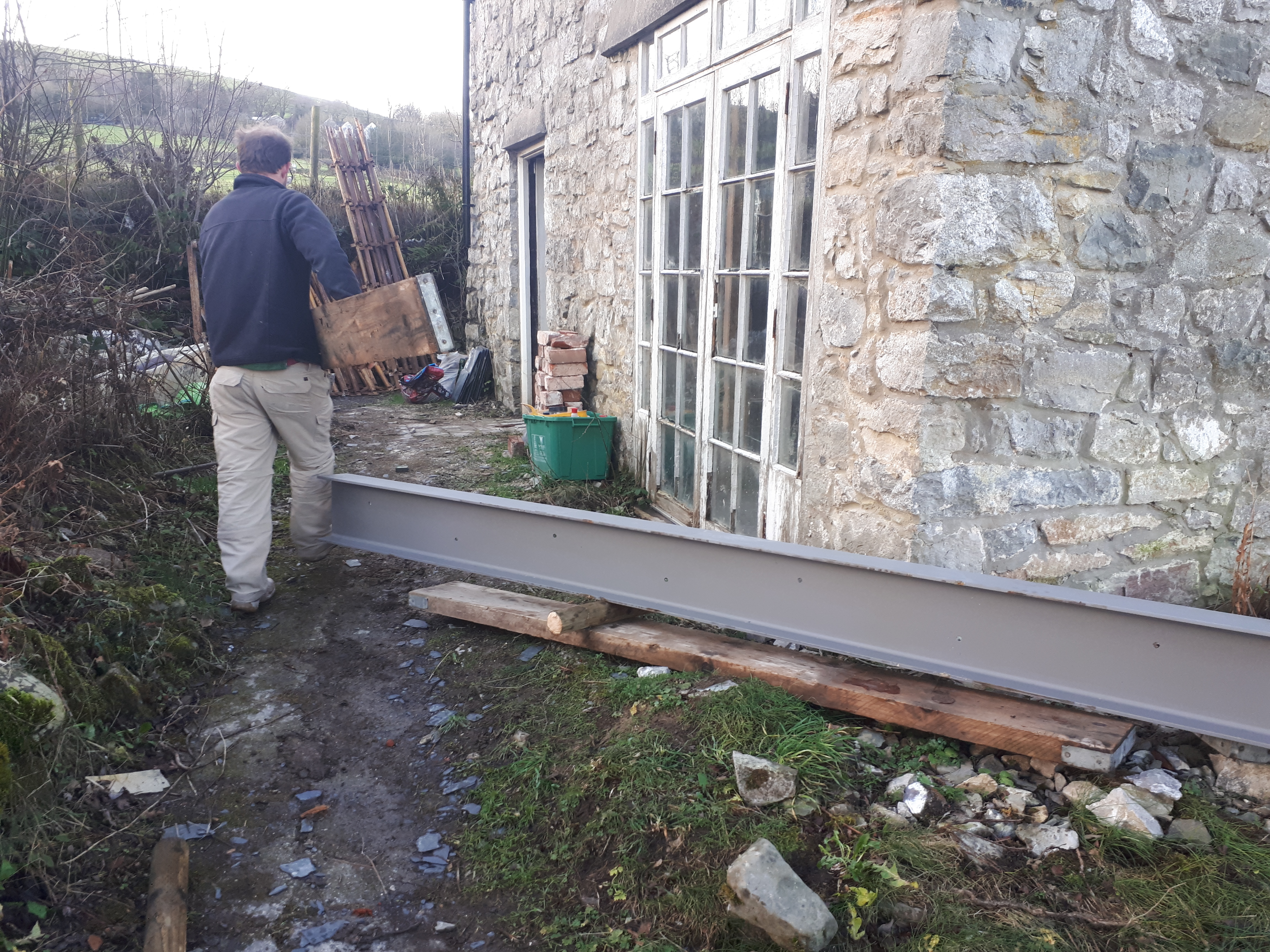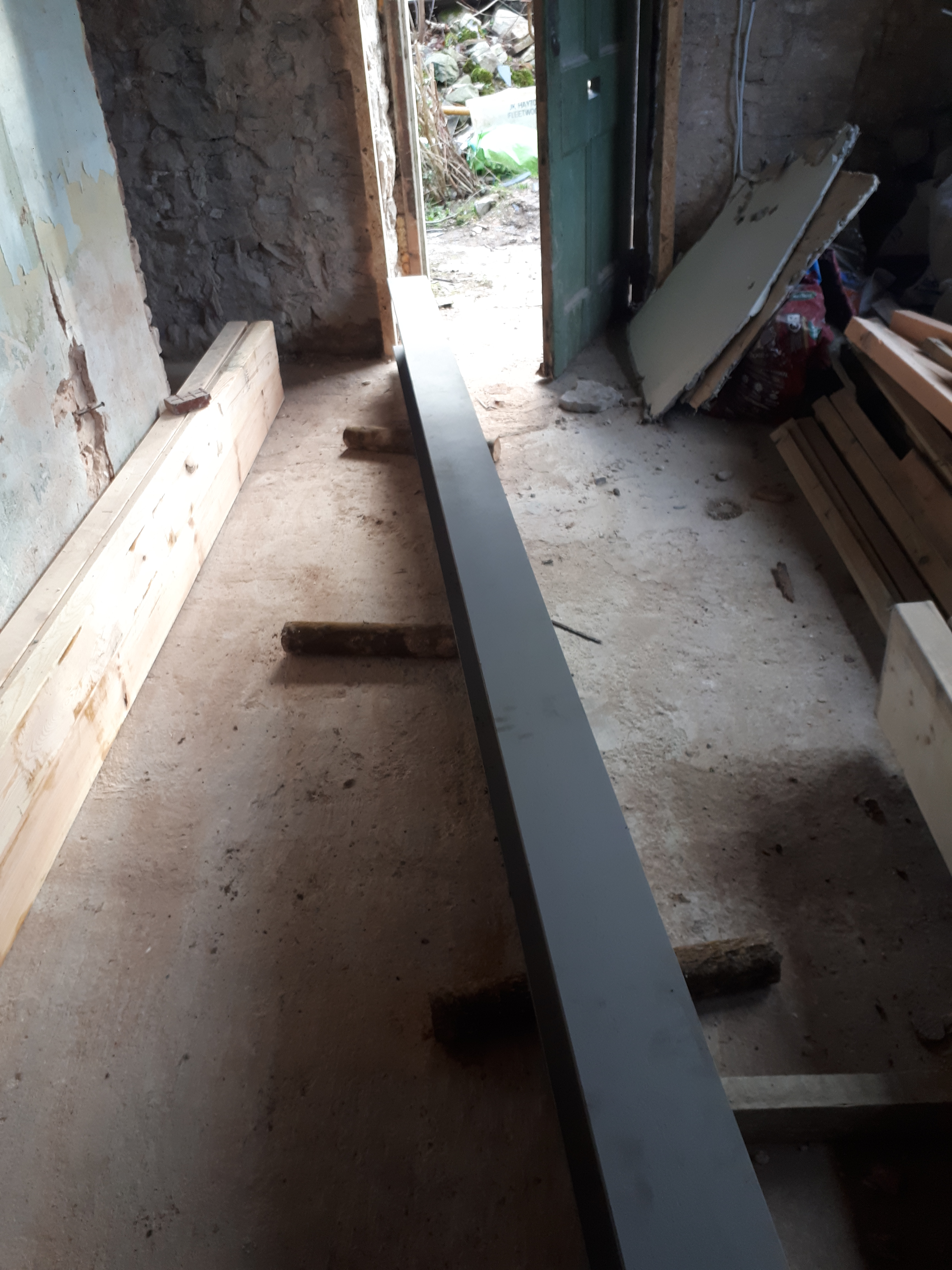 With the steel work completed we moved on to another new structure of the kitchen/diner; a new doorway connecting the lounge and dining room. With the thick wall between, what was once two houses, it won’t be an easy task, involving the installation on three lintels. For now the mortar needs to set around the first lintel, before we can risk removing more stones.