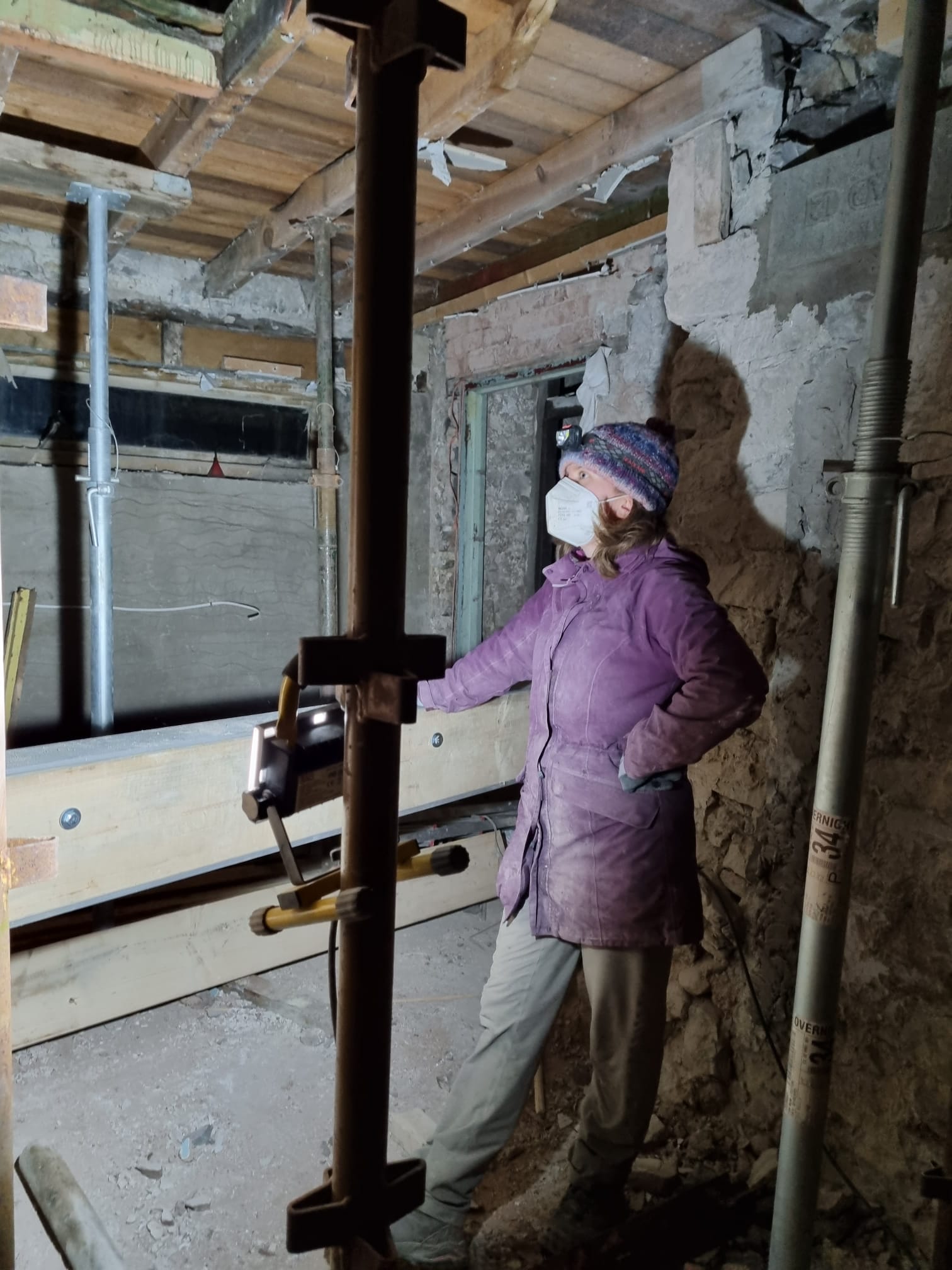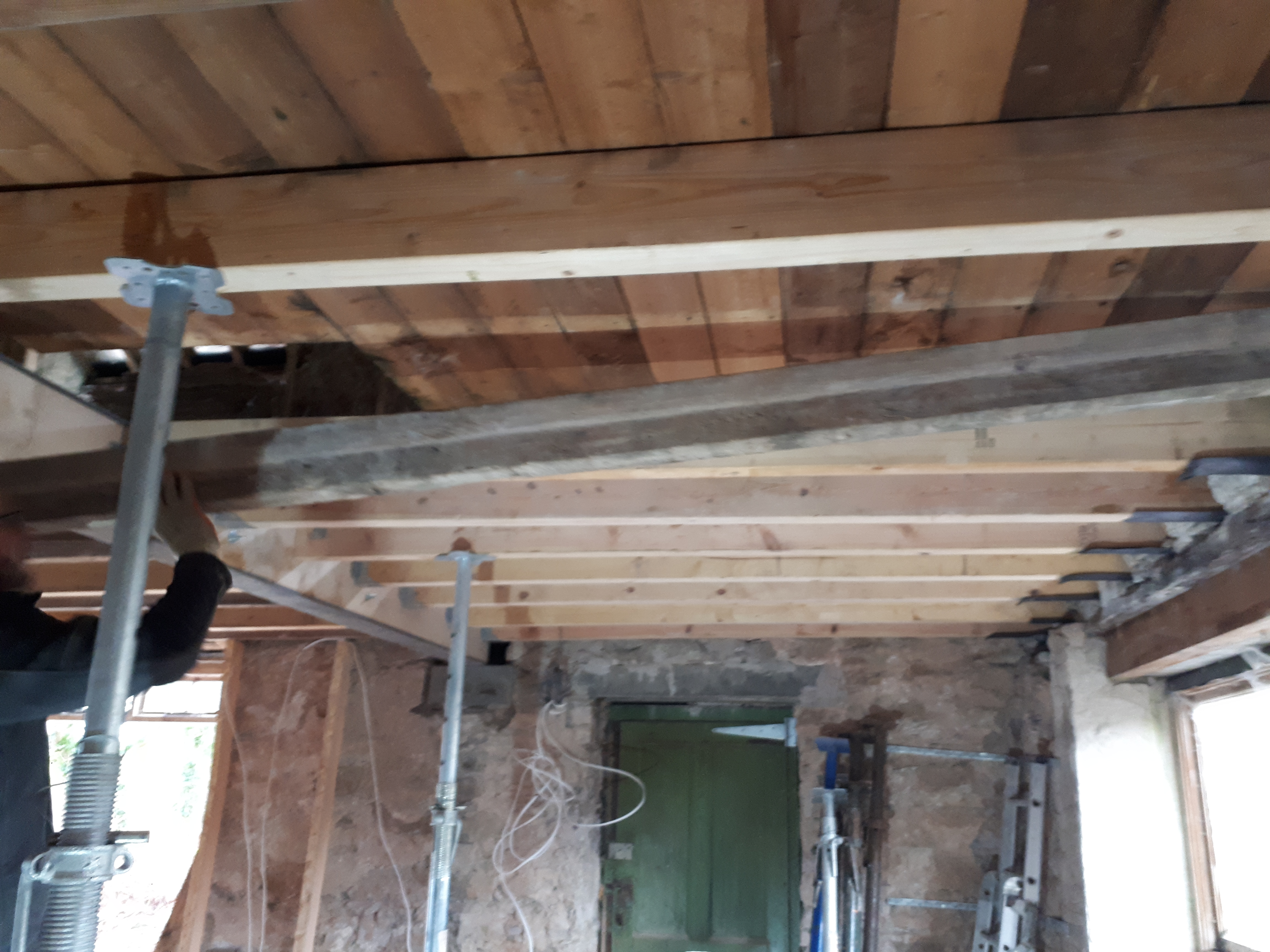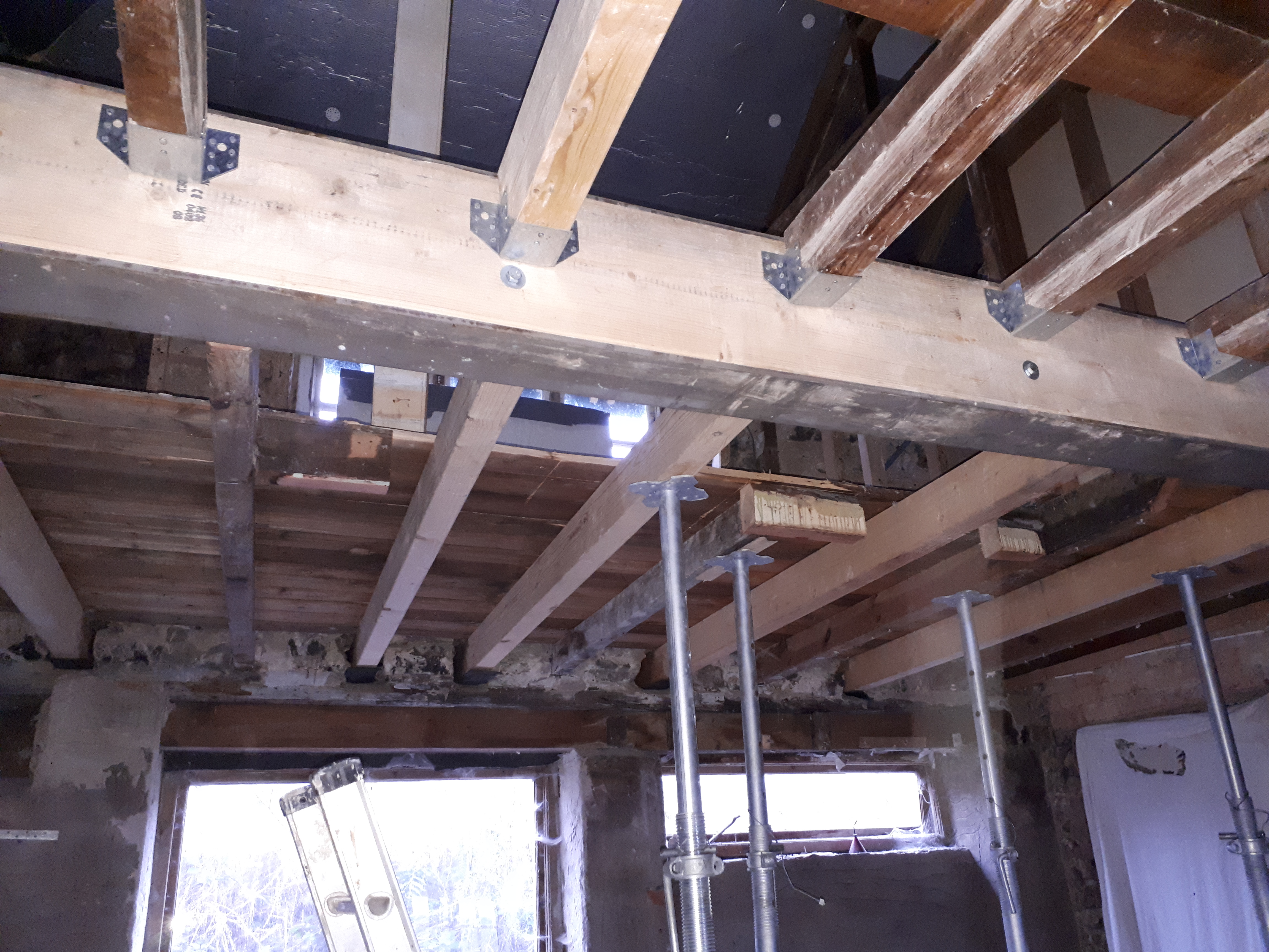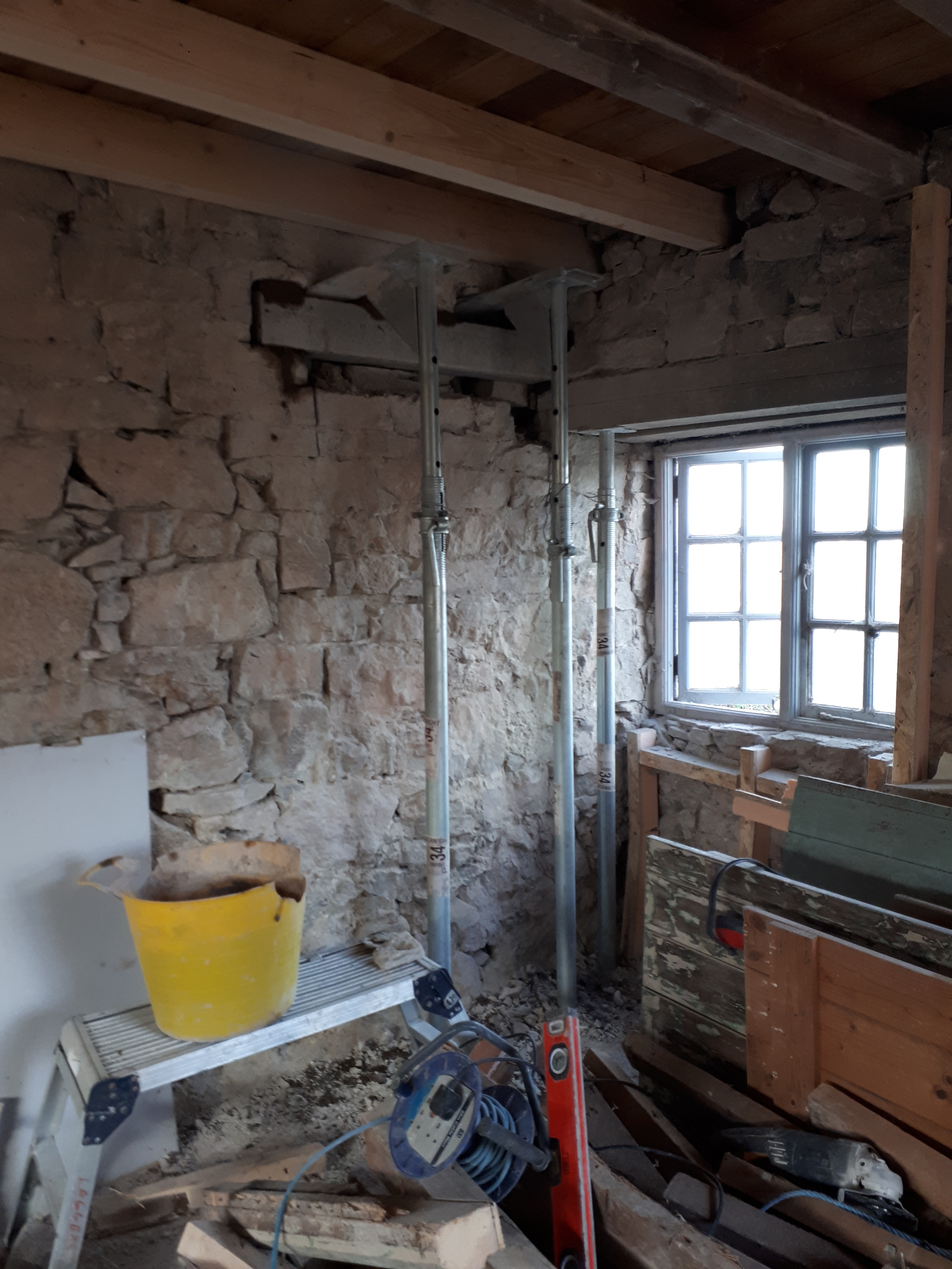 With the steel work completed we moved on to another new structure of the kitchen/diner; a new doorway connecting the lounge and dining room. With the thick wall between, what was once two houses, it won’t be an easy task, involving the installation on three lintels. For now the mortar needs to set around the first lintel, before we can risk removing more stones.