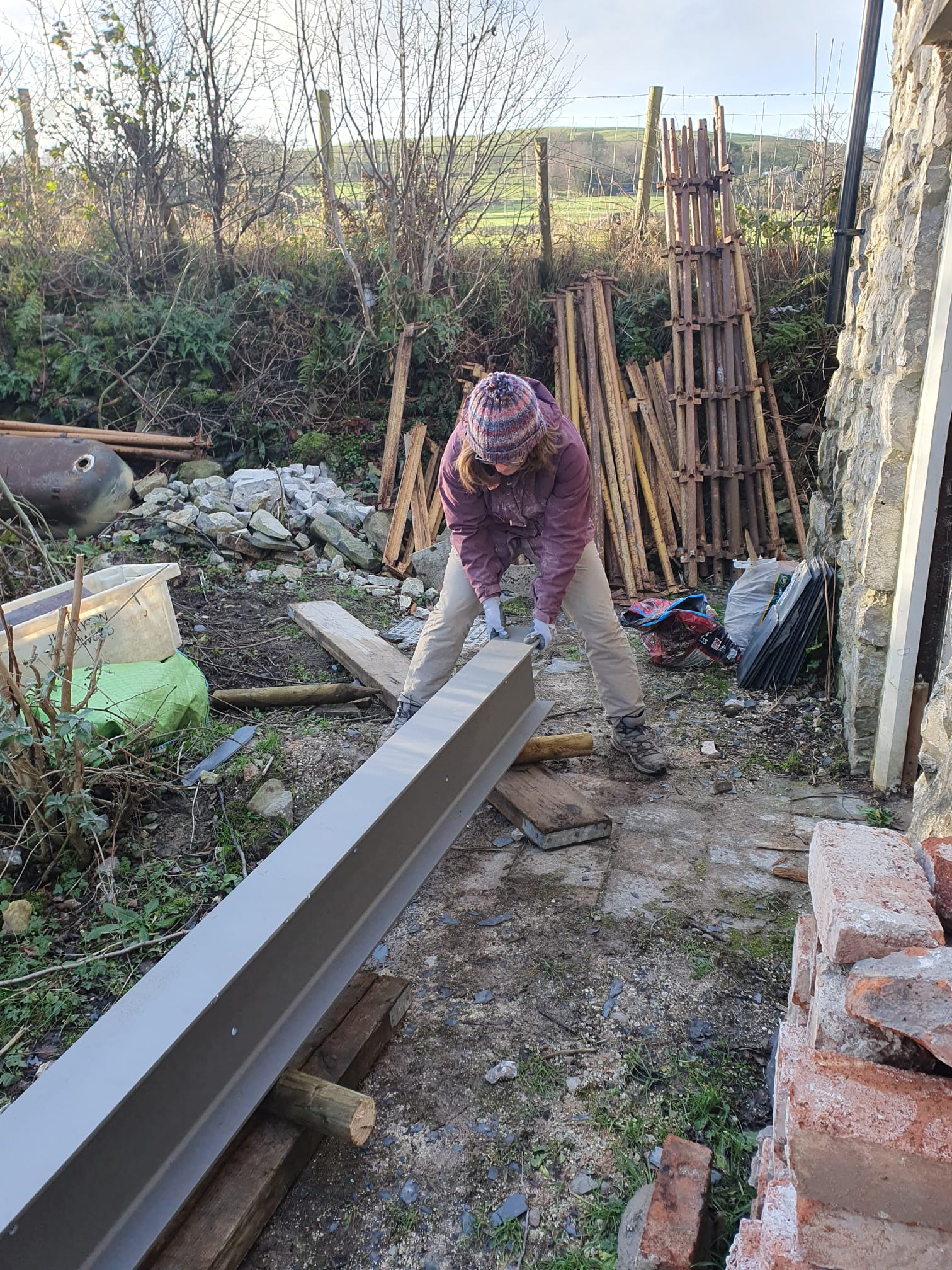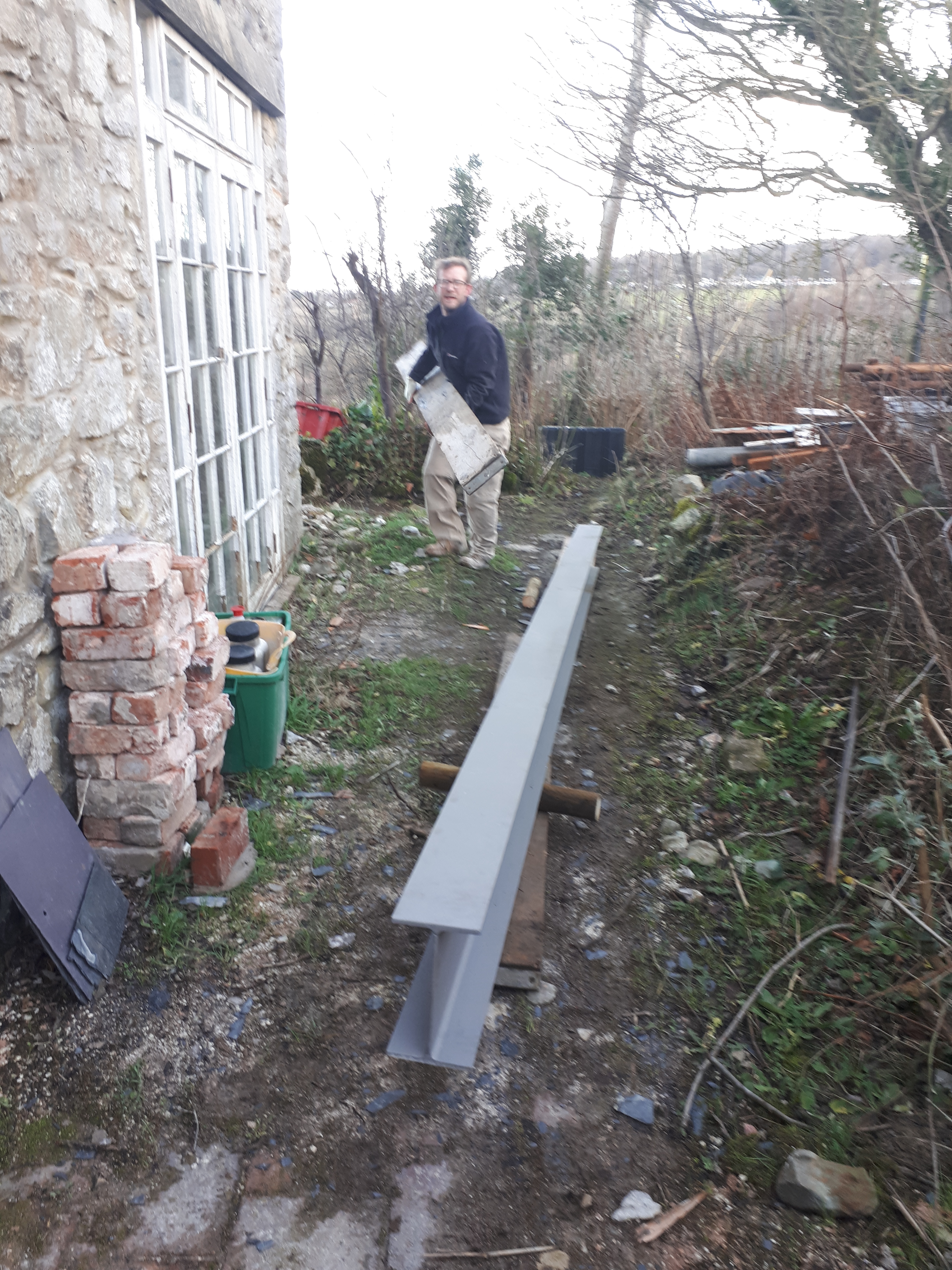The large steel, that had been delivered a few weeks earlier, needed to be moved into the house in order to fit in the timbers that would slot into either side. We used fence posts to roll and swivel the heavy beam, as we weren’t able to lift it between us.