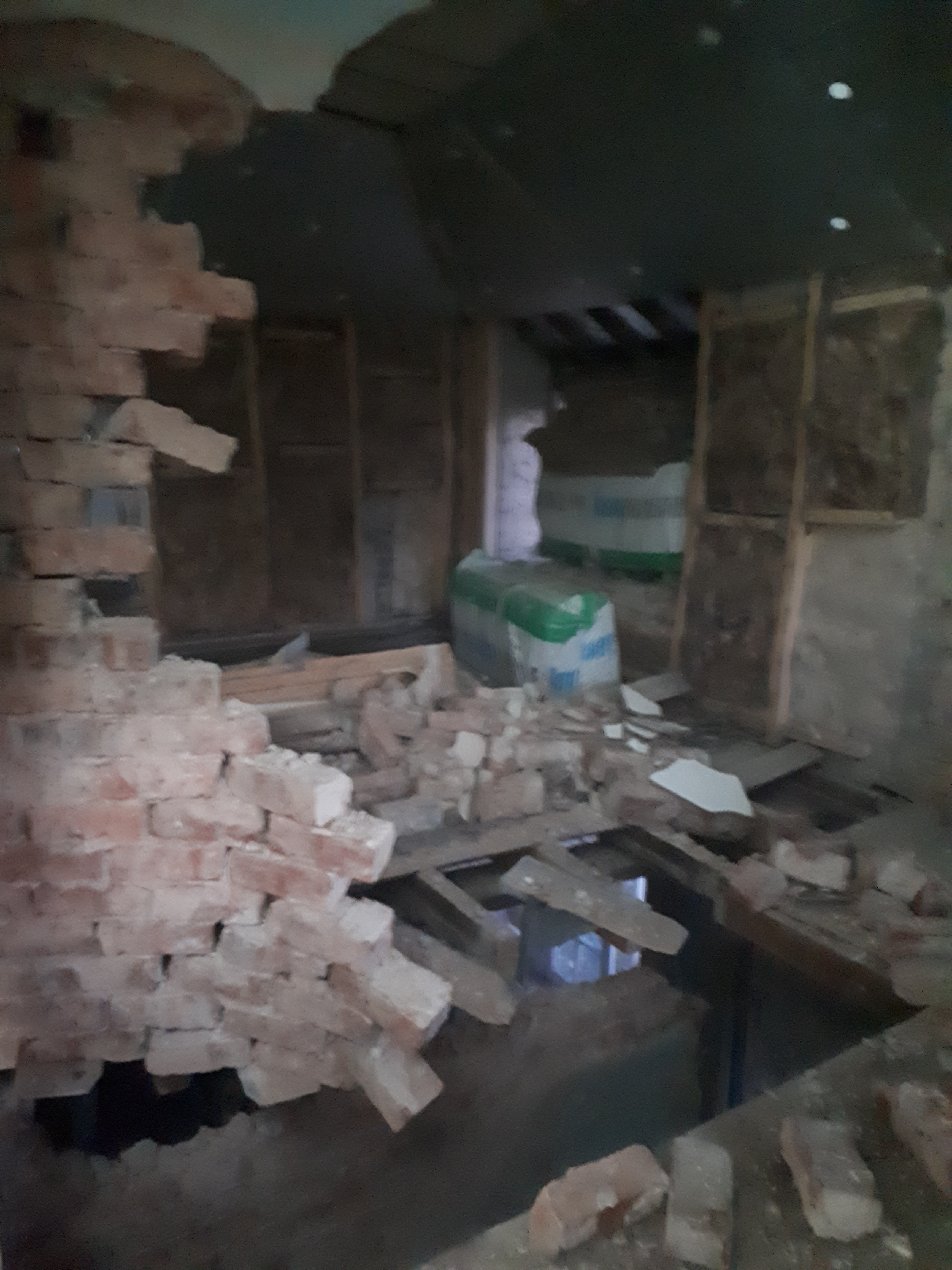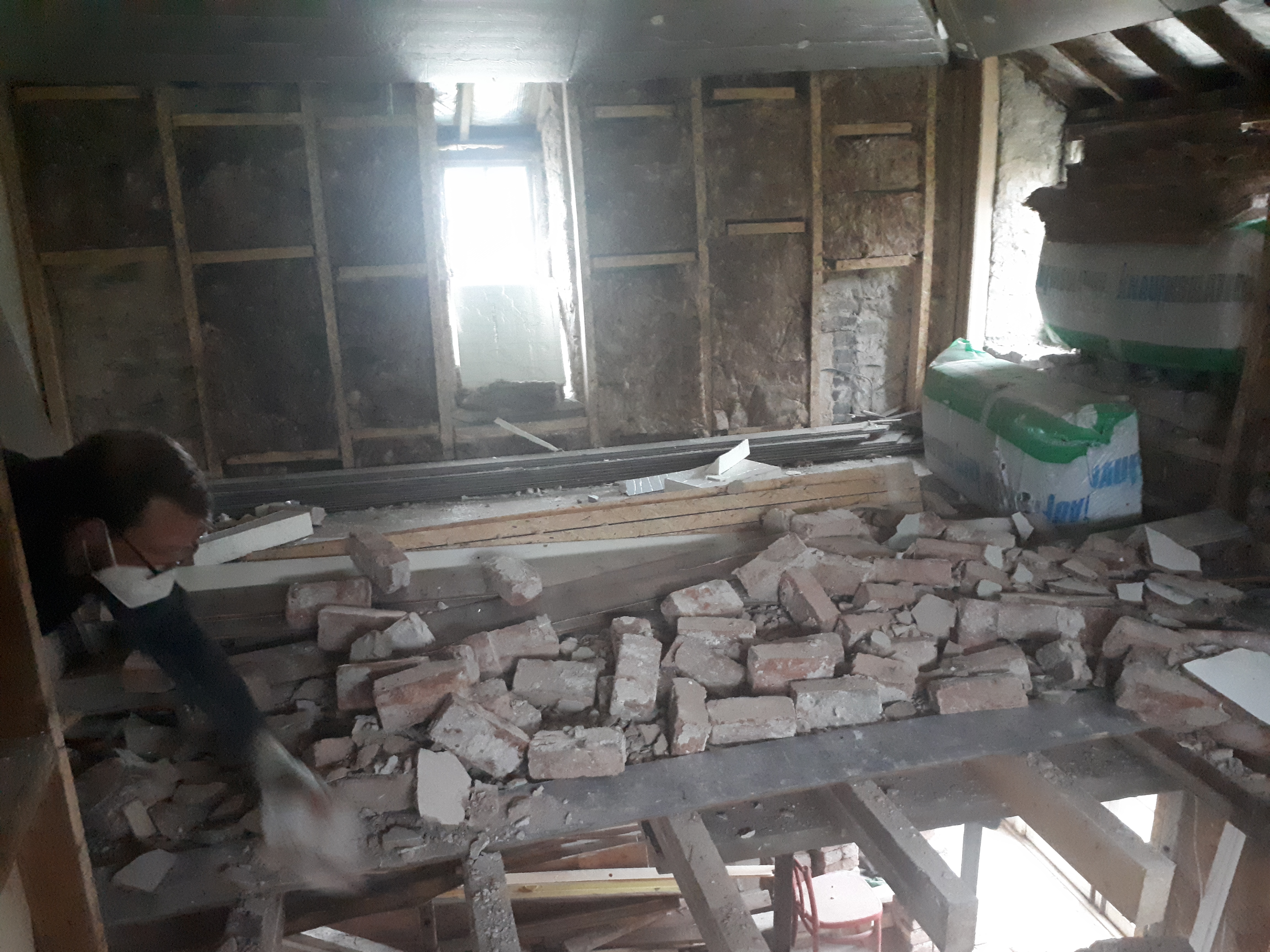 Chris climbed into the attic and began passing down bricks, in an attempt to deconstruct the wall safely. However, with every brick he removed the wall became more unstable. Eventually we decided to tie a rope around one of the acro props and step outside the house, pulling it out from under the wall at a safe distance. A big crash and a cloud of dust followed.