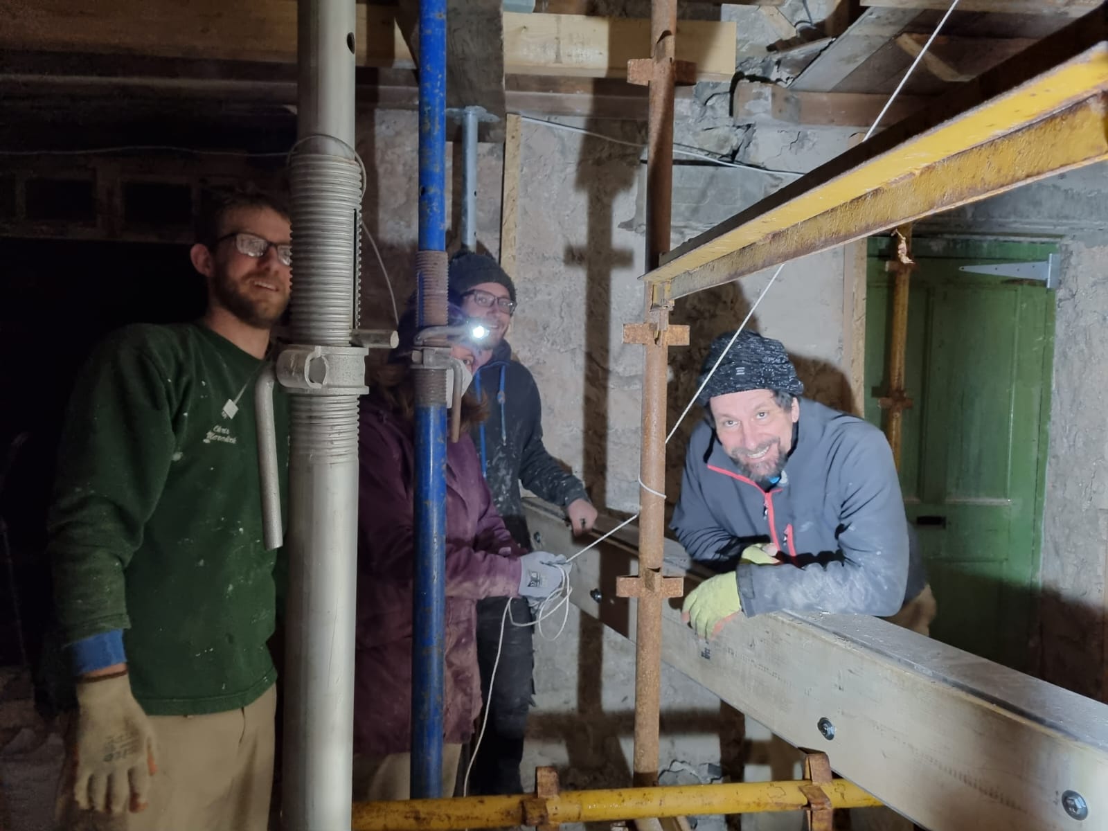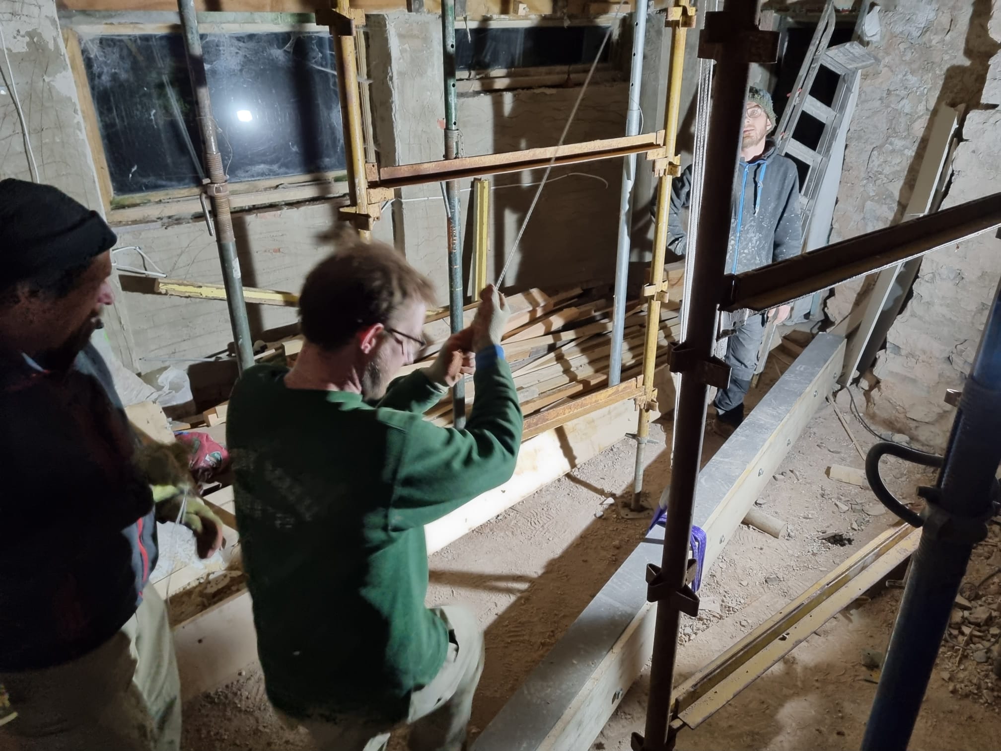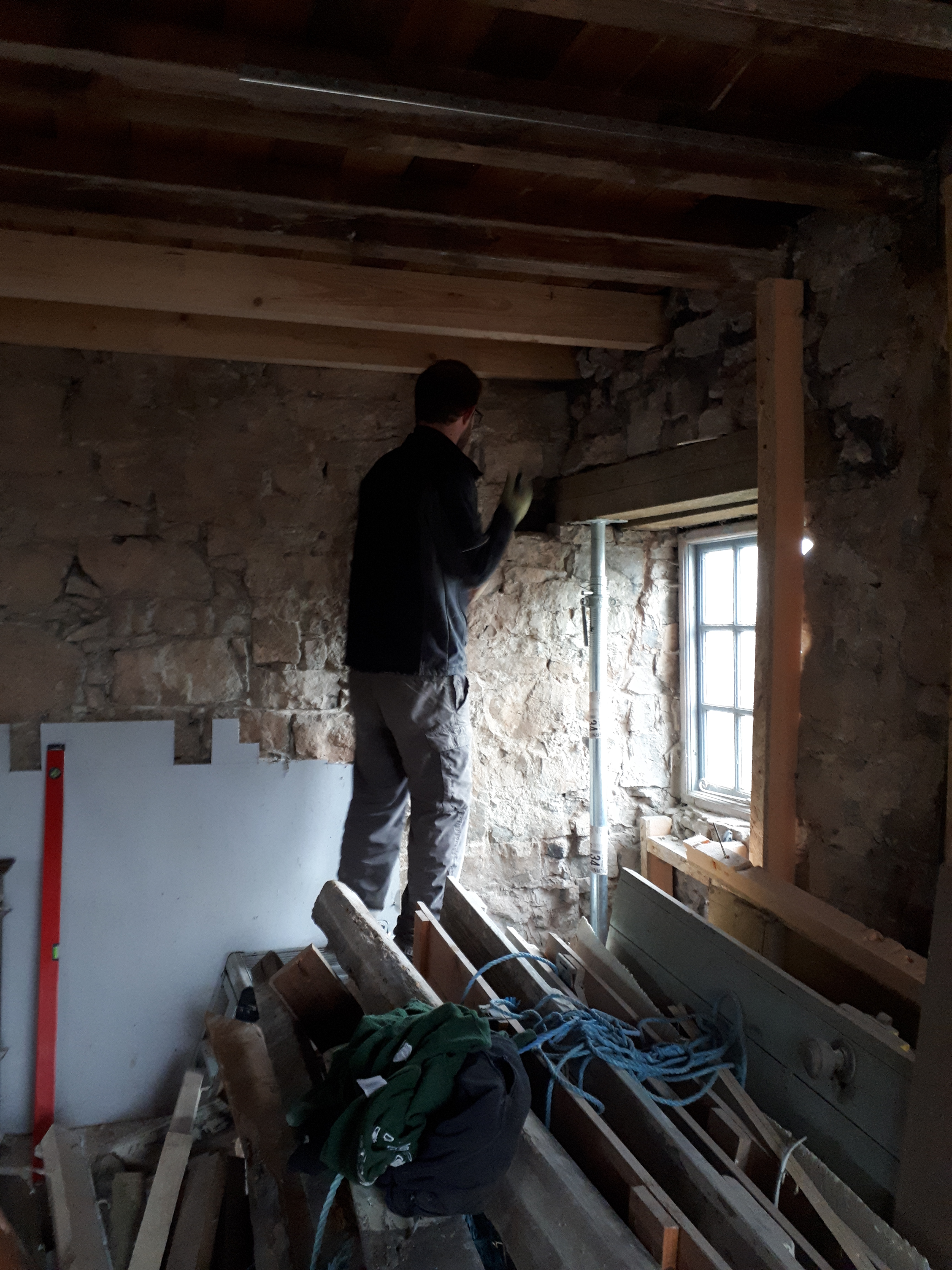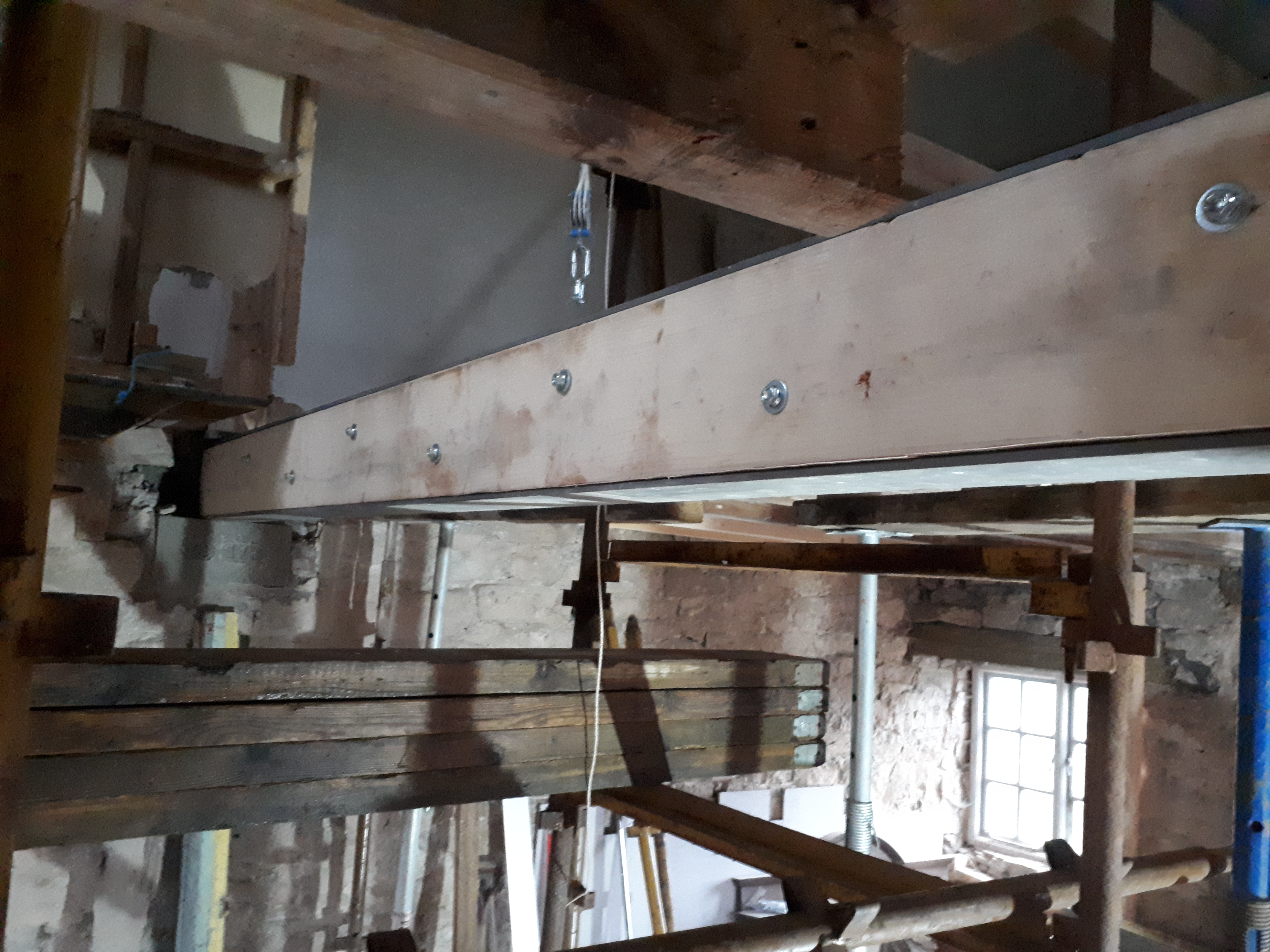 Raising the steel was without a doubt the most nerve-wracking part of our restoration works so far. It involved constructing a scaffold tower inside the house and setting up a pulley system. The pulley was designed for 180 kilos, with the steel being 160 plus the addition of the timbers. However, made of a thin white string, no thicker than a shoelace, it in not way looked up to the job. Not only this but the pulley wasn’t designed to hold the weight of the item once you had pulled it up, relying entirely on human input to stop the steel from crashing to the ground.
