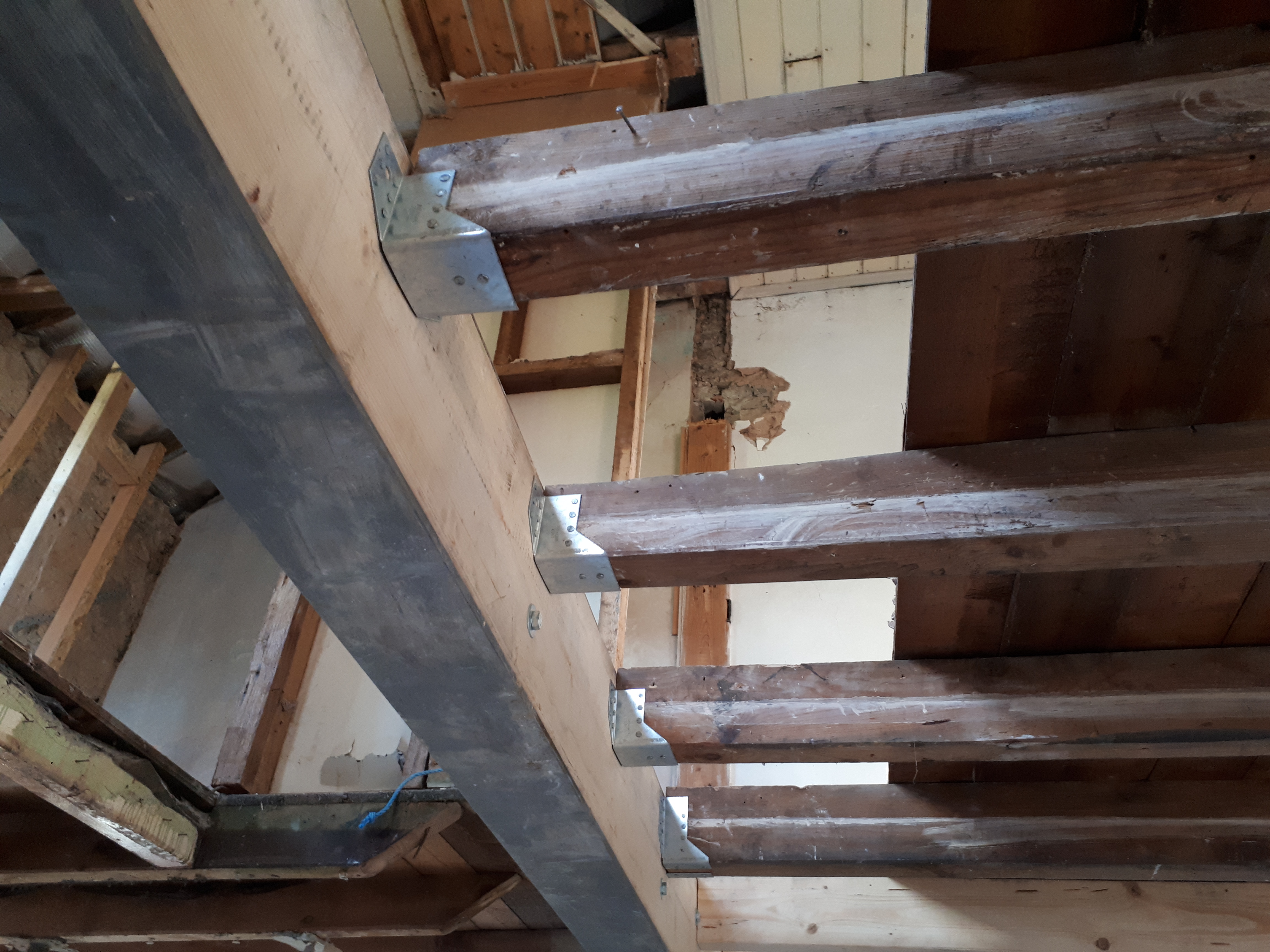 With the steel in place it was time to attach the beams. The beams on one side of the room had carefully been cut to the right size to butt up to the steel, and only needed brackets attaching to secure them in place. On the other side of the room we had the opening where there staircase once was. The other beams had been cut to allow the steel through. We therefore needed to remove and replace all the beams.