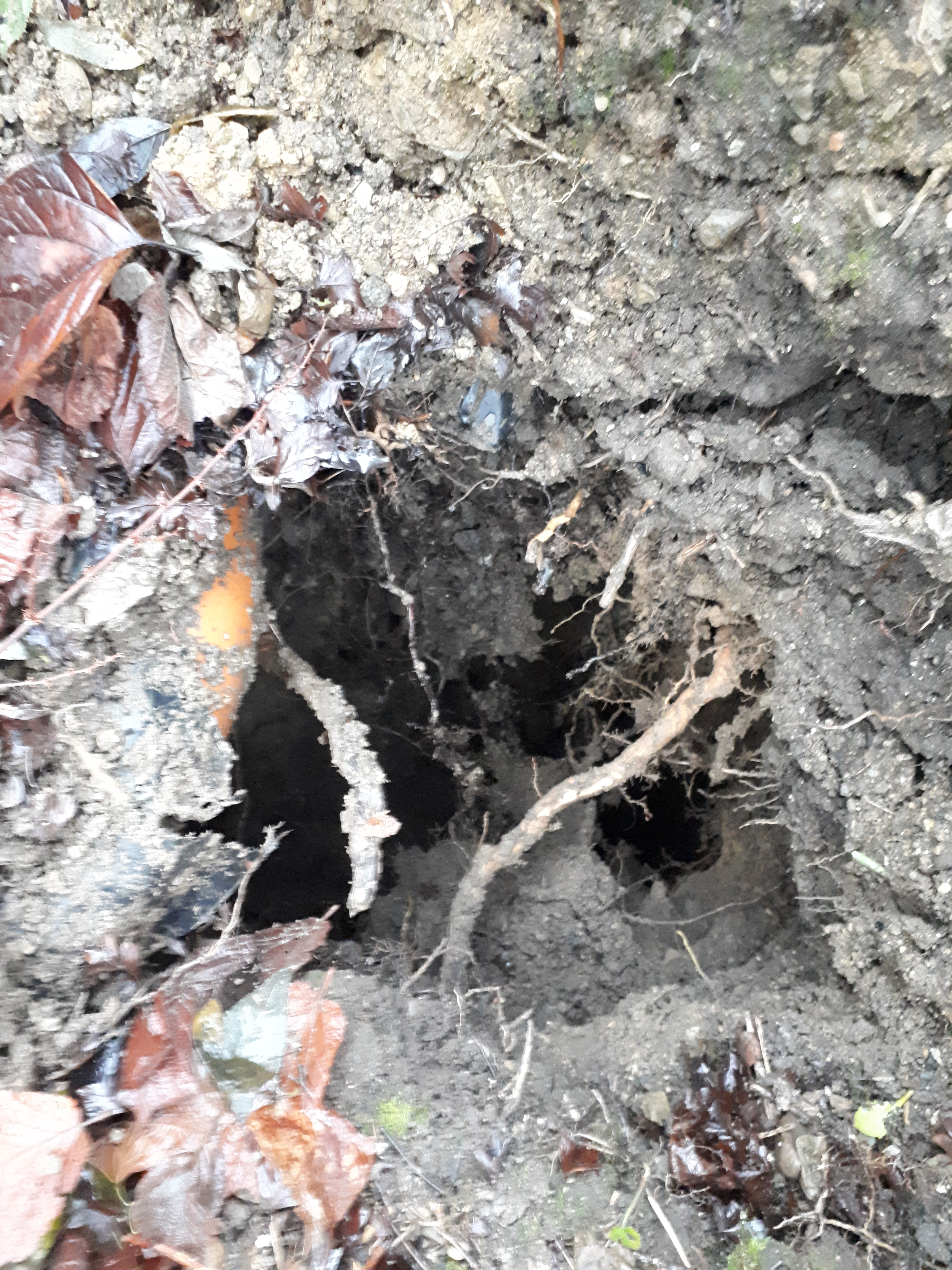 During one of the days where I had been working on something inside on my own, Chris began digging around in the garden to try and work out the drainage. There was a strange area within the garden, close to a telegraph pole, where the ground seemed to bounce beneath our feet. Having spent a bit of time digging in this spot, while looking for the outflow of our drainage, Chris was amazed to see a hole open up beneath him. Sticking a rod down to assess the depth, he found it went down some 2m. The bouncing ground was where the tree roots were suspended over empty space.