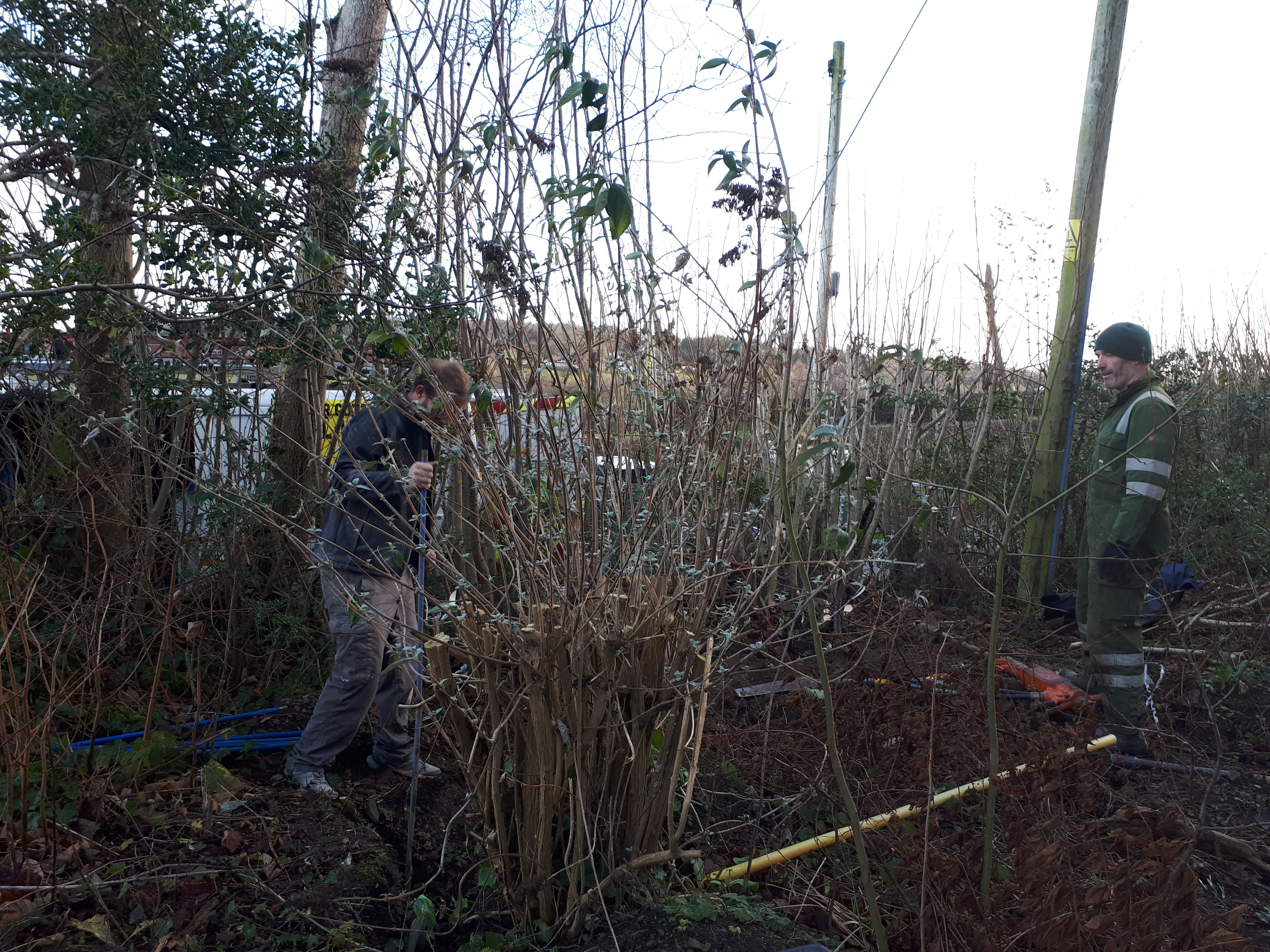 As the hole was so close to the telegraph pole we called Scottish power to assess the situation. They agreed they would need to move the cable supporting the pole. Having dug a hole to see if the ground would be suitable, they found the hole went further than expected. Eventually, they managed to find a suitable spot, and we now know of a massive hole at the bottom of our garden. It is likely to have been caused by our broken drainage, washing away the soil beneath our trees. Due to the lack of soil the Scottish power team decided an ash tree next to the power line was too unstable to leave standing. As our plan is eventually to lay the hedge beside the road, we requested the ash tree be coppiced so we could lay any new growth into the hedge.