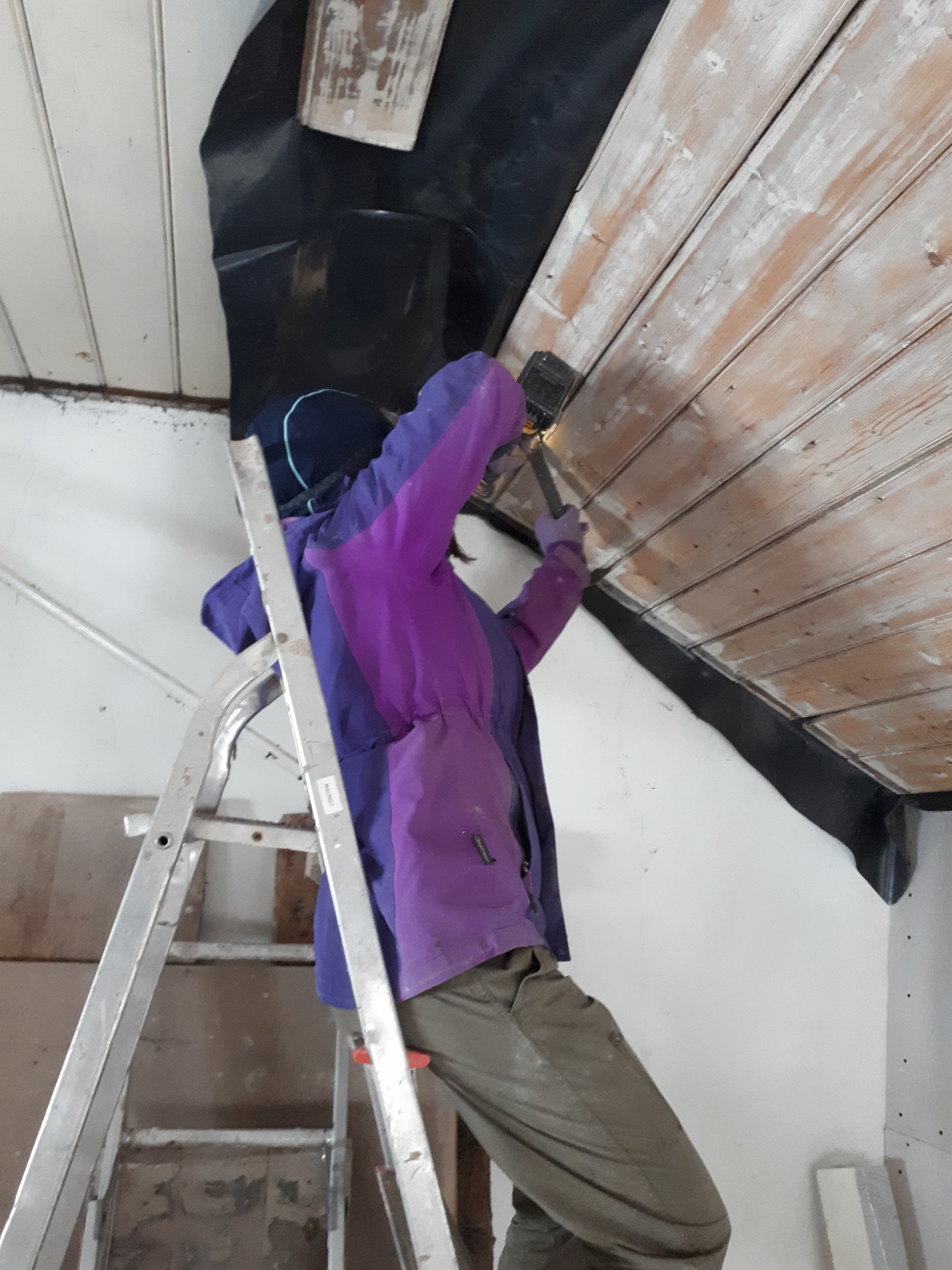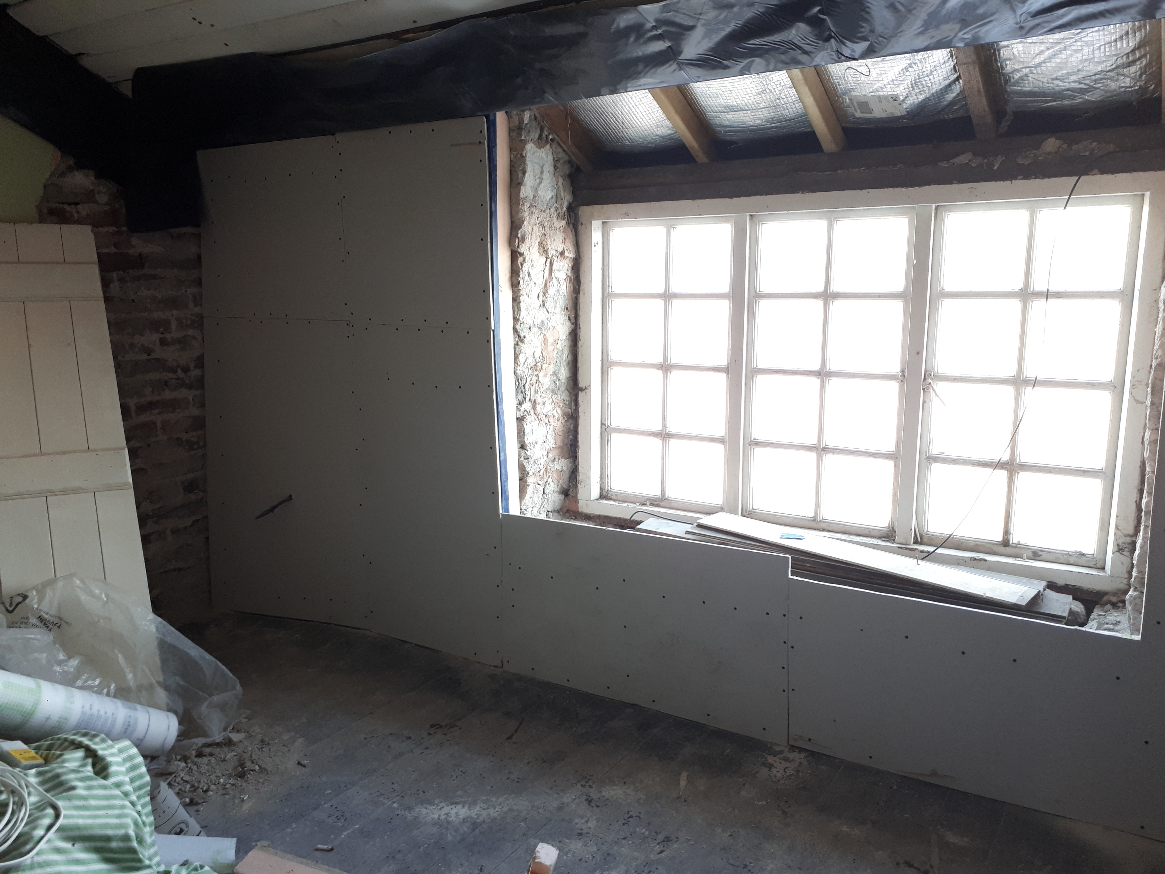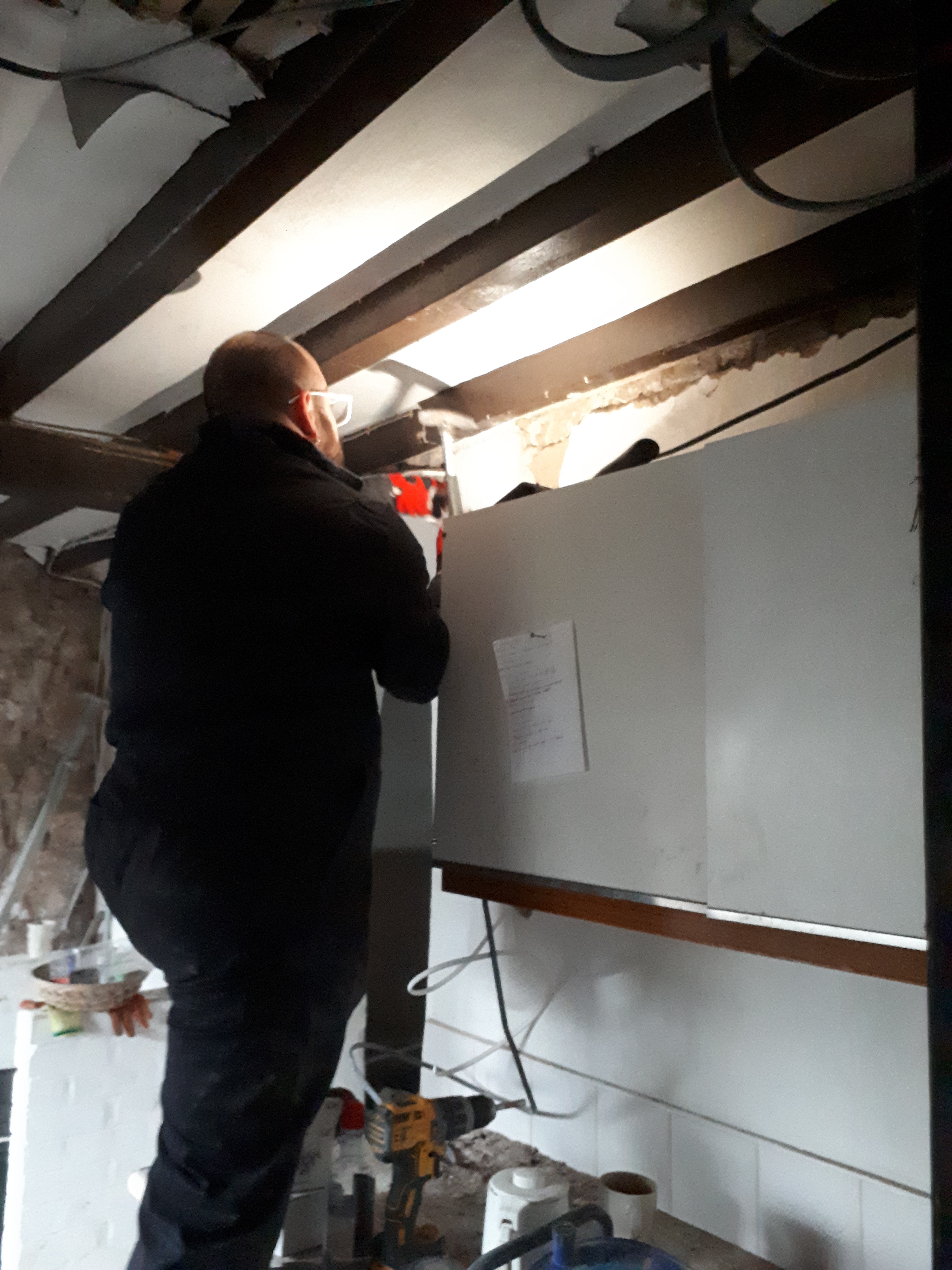 Myself and Anna meanwhile cracked on with the ceiling. Somehow we came aground on several attempts, unable to find the rafters below with our screws. Nothing a bit of filler can’t fix though.