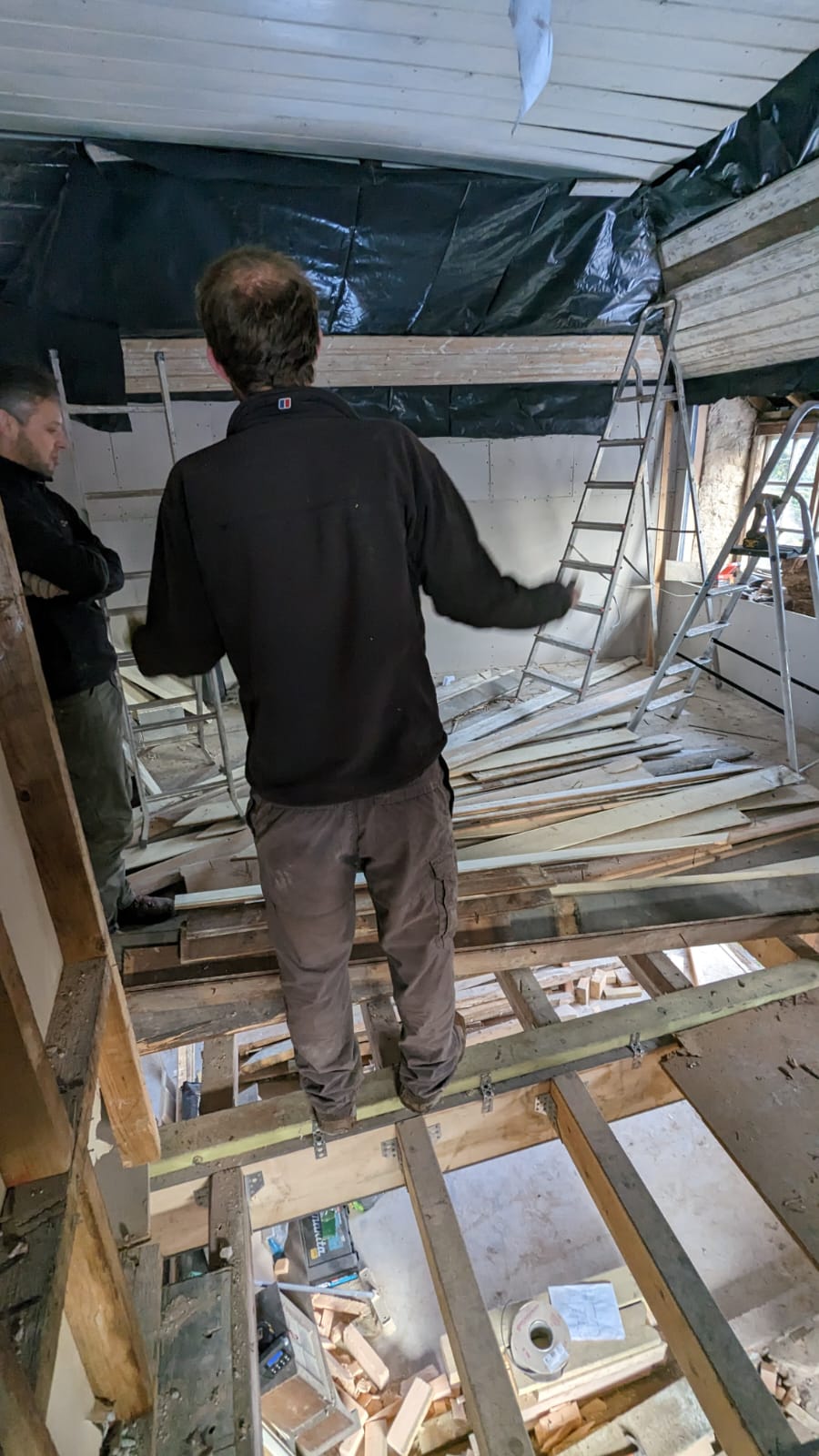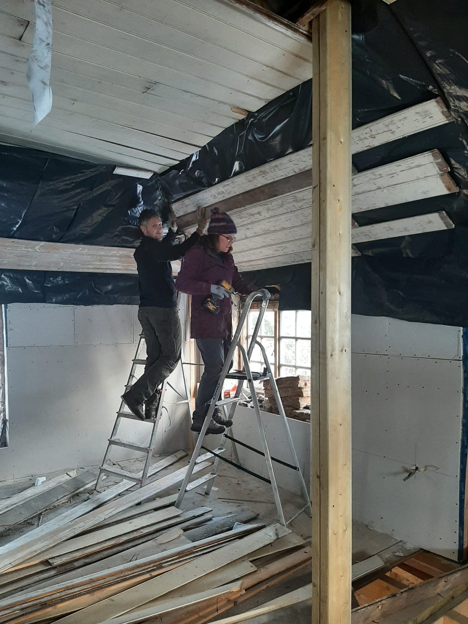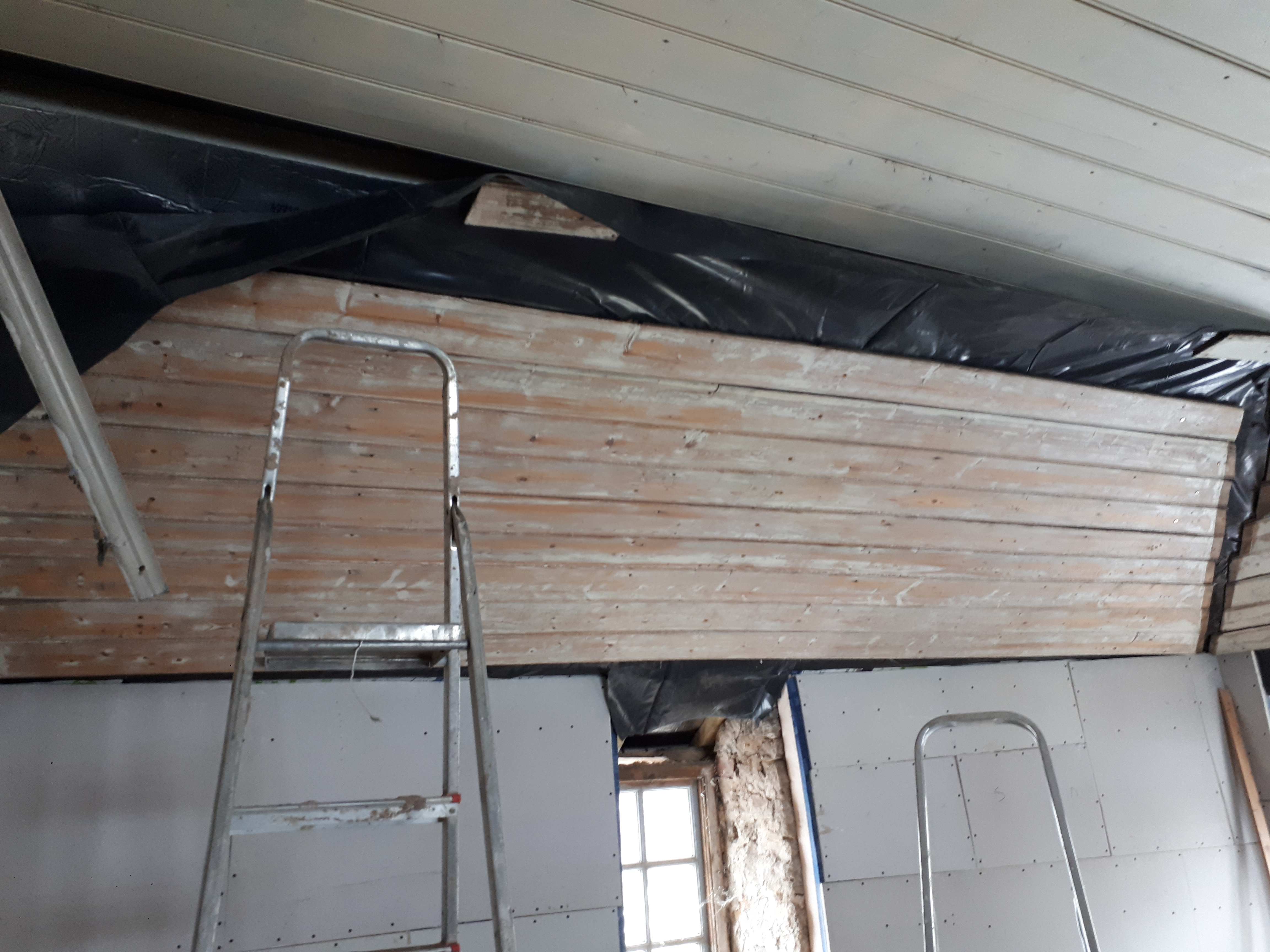Myself and Anna meanwhile cracked on with the ceiling. Somehow we came aground on several attempts, unable to find the rafters below with our screws. Nothing a bit of filler can’t fix though.