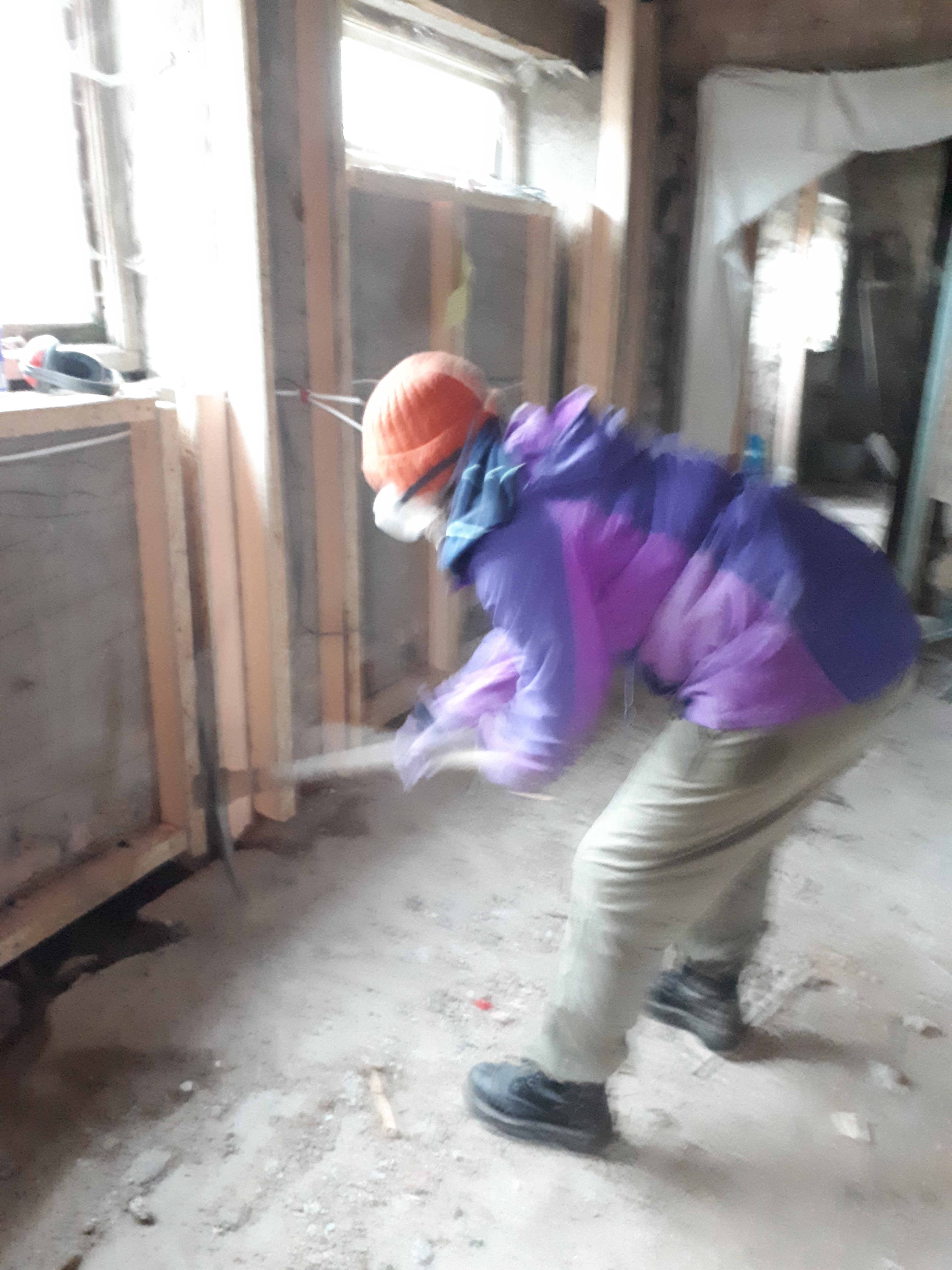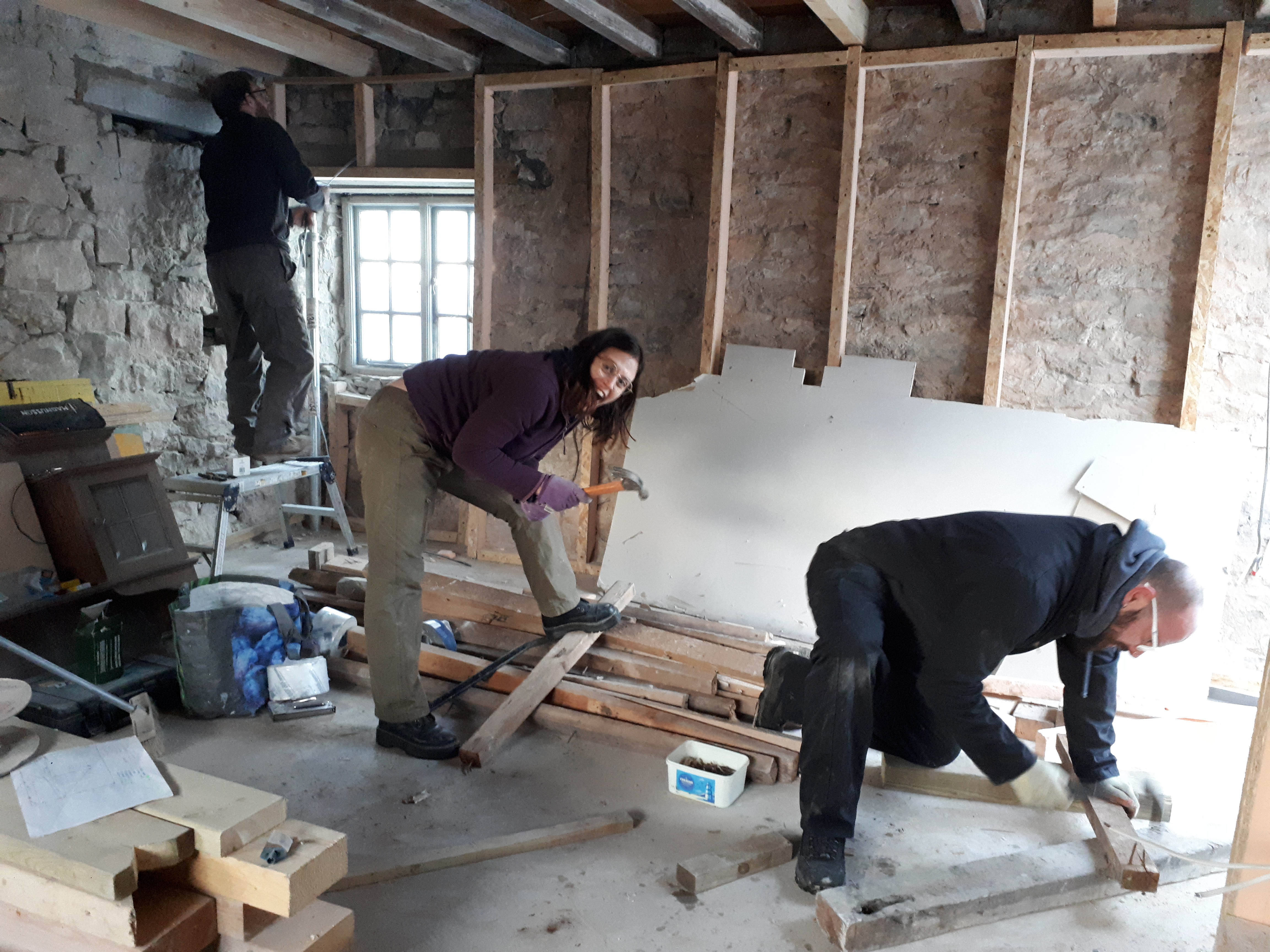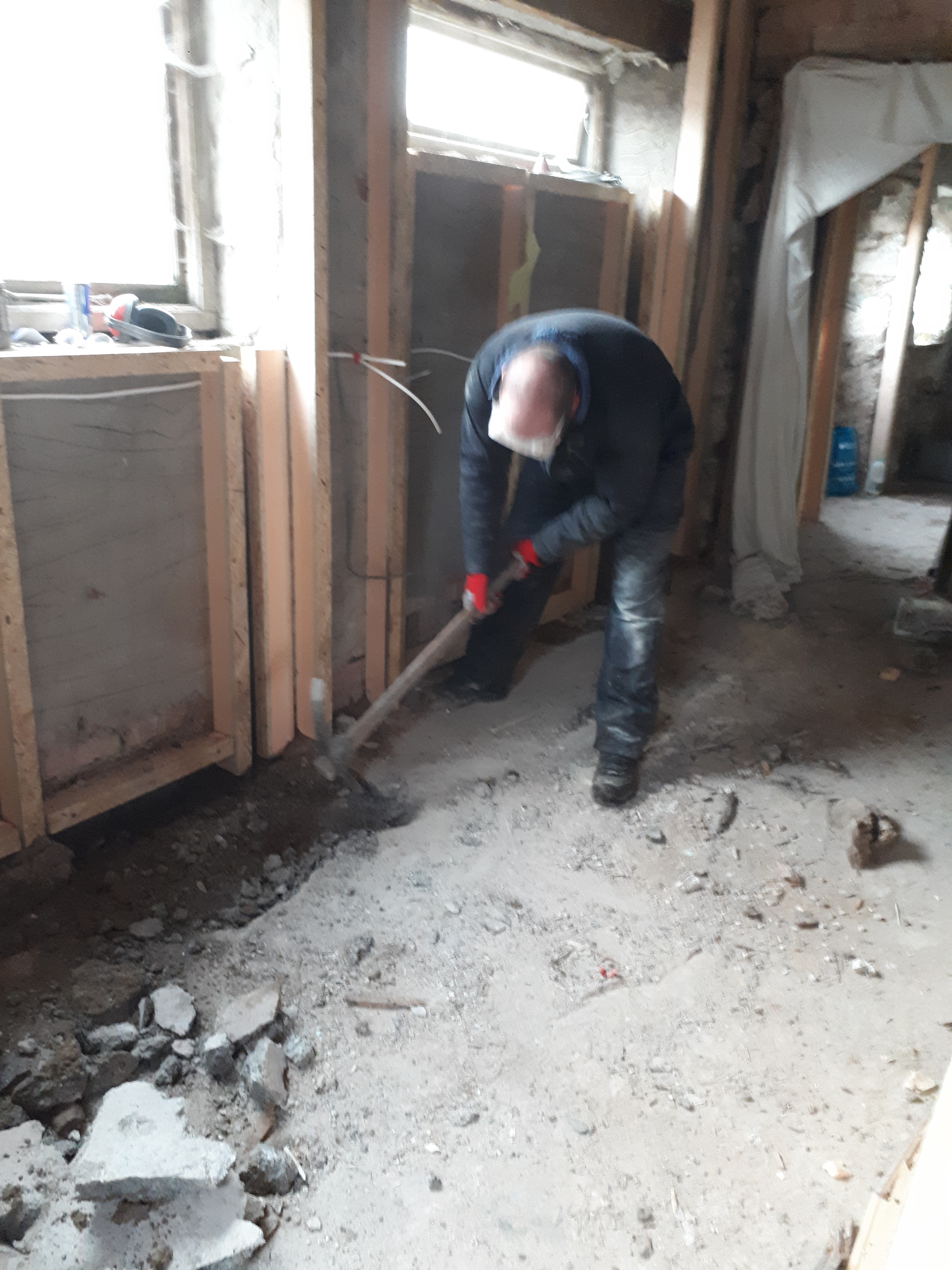 Wanting a change of pace we then attempted to break up the concrete floor in the kitchen/diner. While we did make some progress with the pickaxe, Luke particularly having an impressive swing, it was decided a more heavy-duty machine might save some aching bones on another occasion.